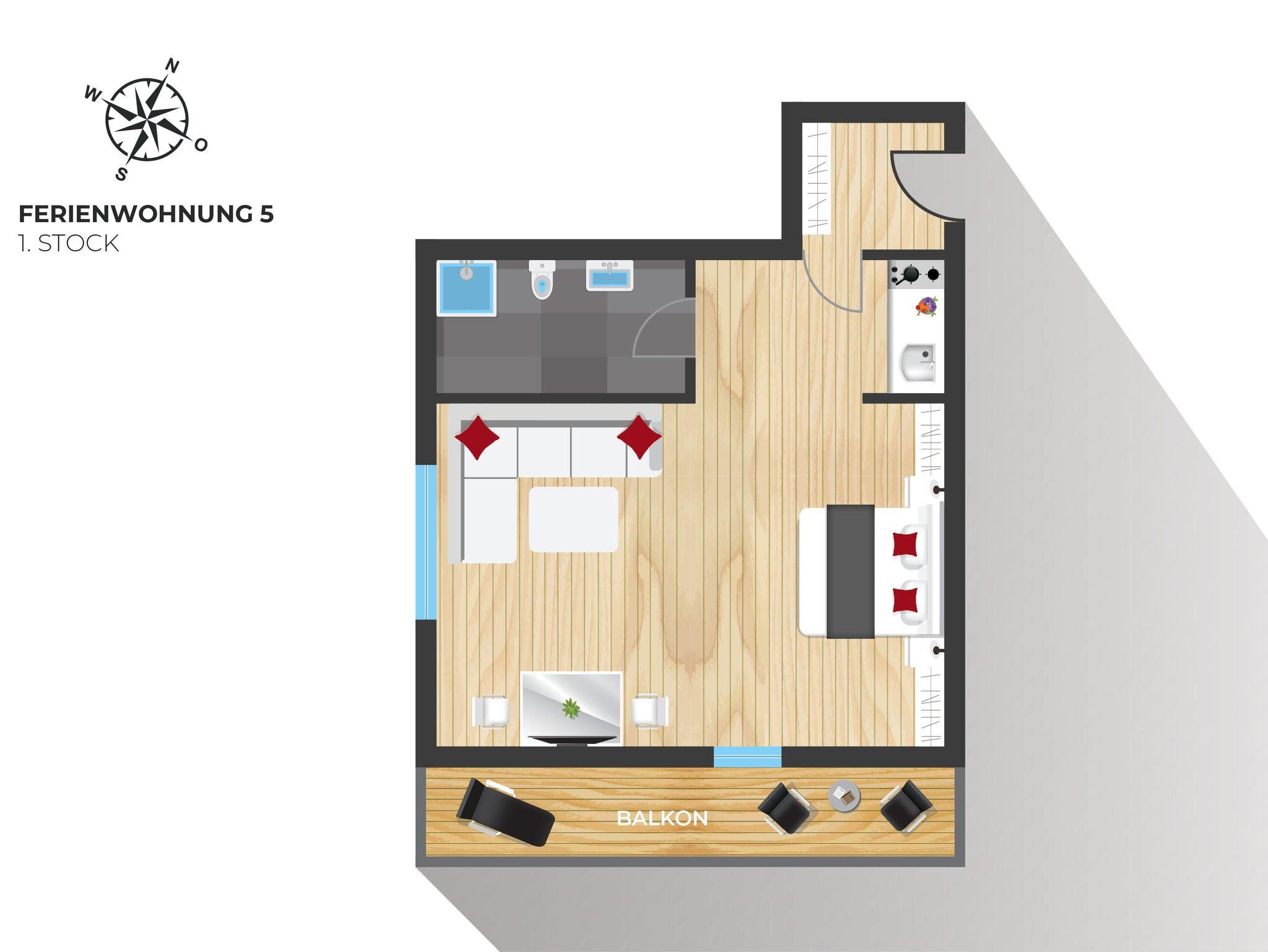 Ferienwohnung Typ 5, 30qm für 2 Personen,Wohn/Schlafraum (Doppelbett), Kochnische, Dusche/WC, SAT-TV, Safe, W-LAN, Radio und Balkon.