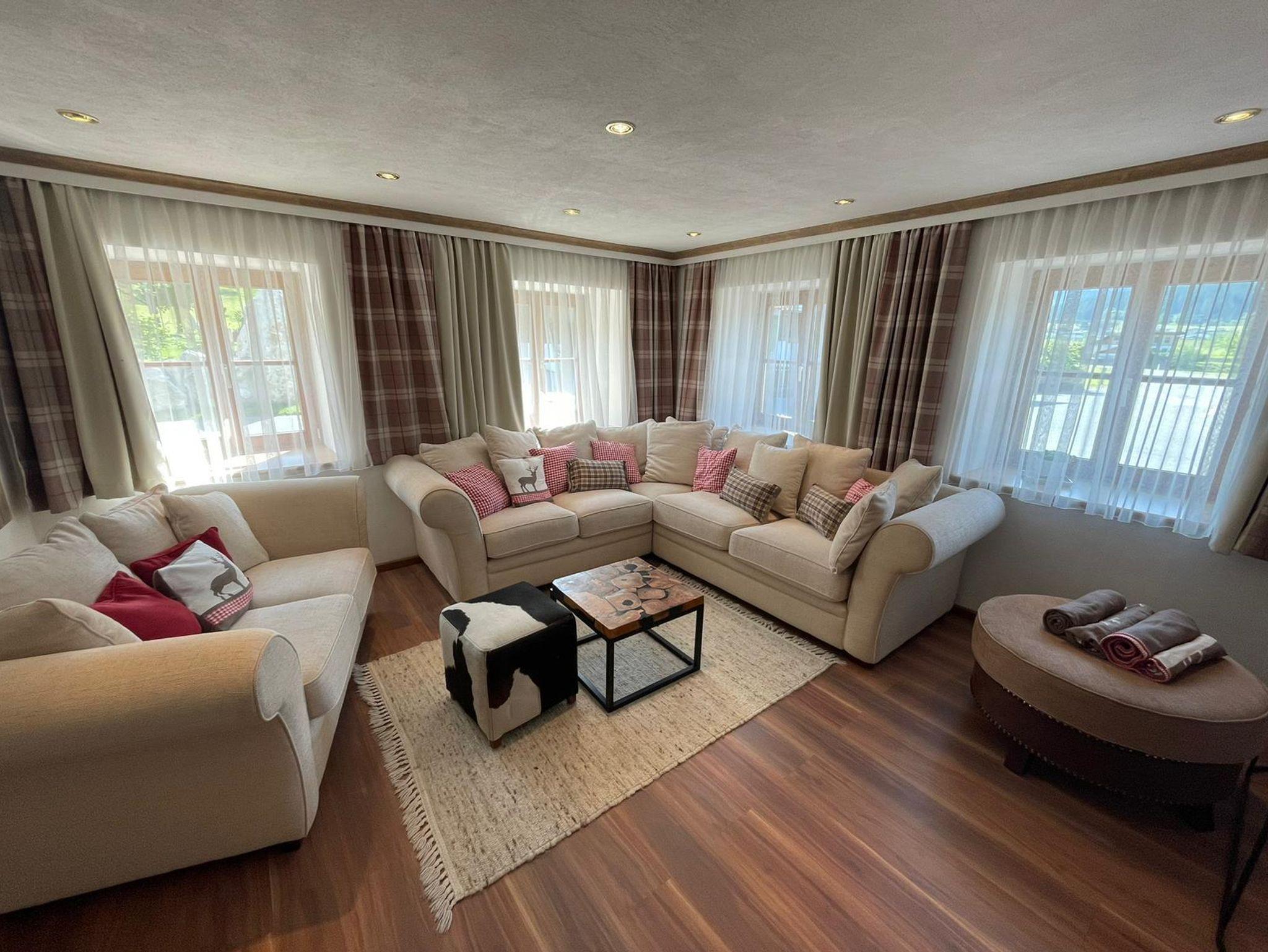 Im Erdgeschoss: Die Bauernküche - voll ausgestattet mit Kochinsel, Backrohr, Dampfgarer, Wärmeschublade, Espresso-Maschine und Spülmaschine. Am großen Esstisch ist Platz für bis zu 12 Personen. Die Bauernstube dient als Wohnzimmer mit großzügiger Entspannungsecke und großen Flat-Kabel-TV. Von außen zugängig ist das Depot für Sportequipment mit Schuhtrockner.