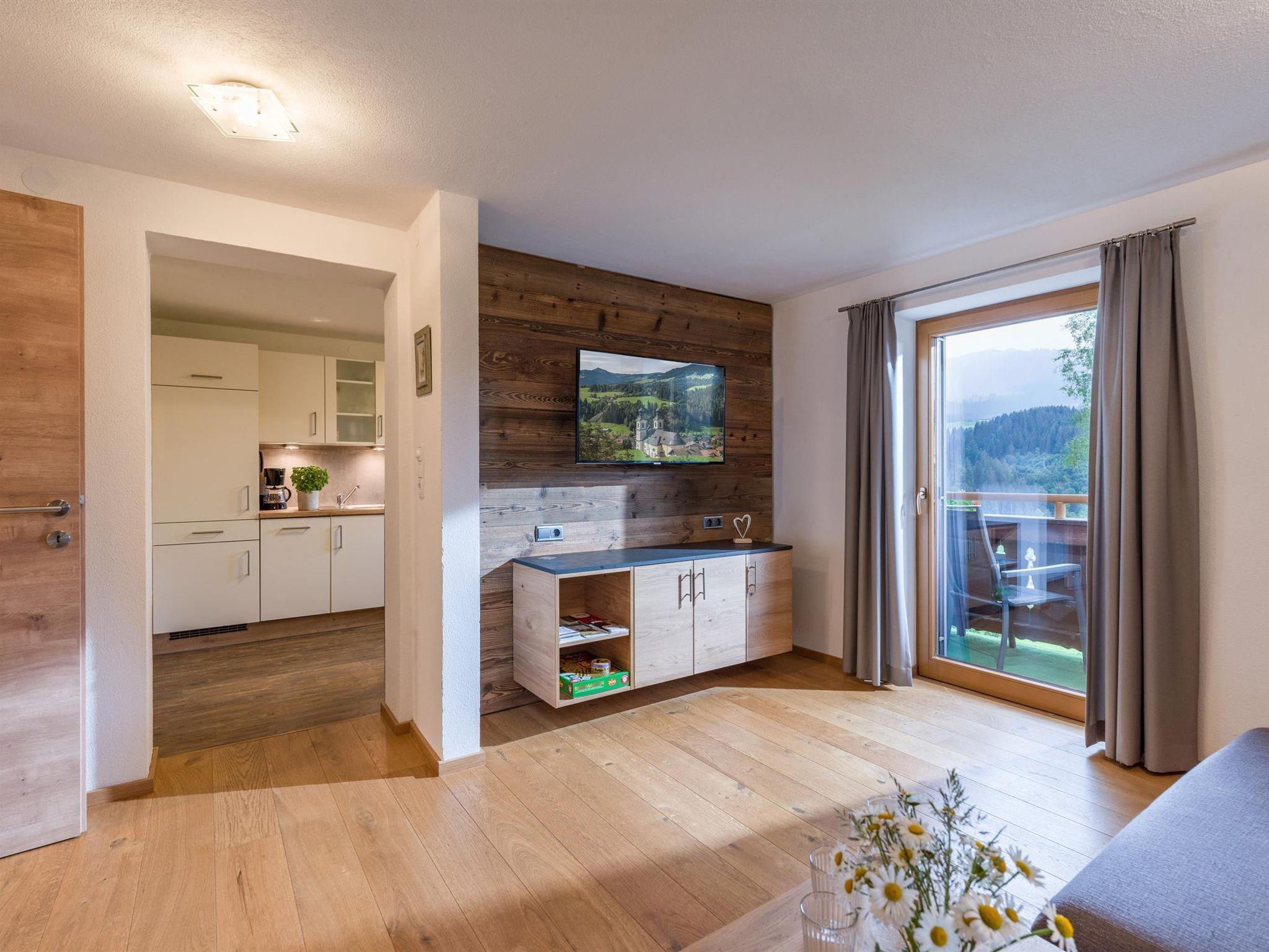 Die großzügige, helle Wohnung mit Balkon befindet sich im 2. Stock unseres Bauernhauses. Sie verfügt über 1 Schlafzimmer und einer großen Küche mit offenem Durchgang zum Wohnzimmer (und einer ausziehbaren Couch für 2 Personen). Bad und WC sind getrennt. Das Wohnzimmer lädt mit einer großen Wohnlandschaft zum Ausspannen ein. SAT-TV und WLan sind inklusive.
