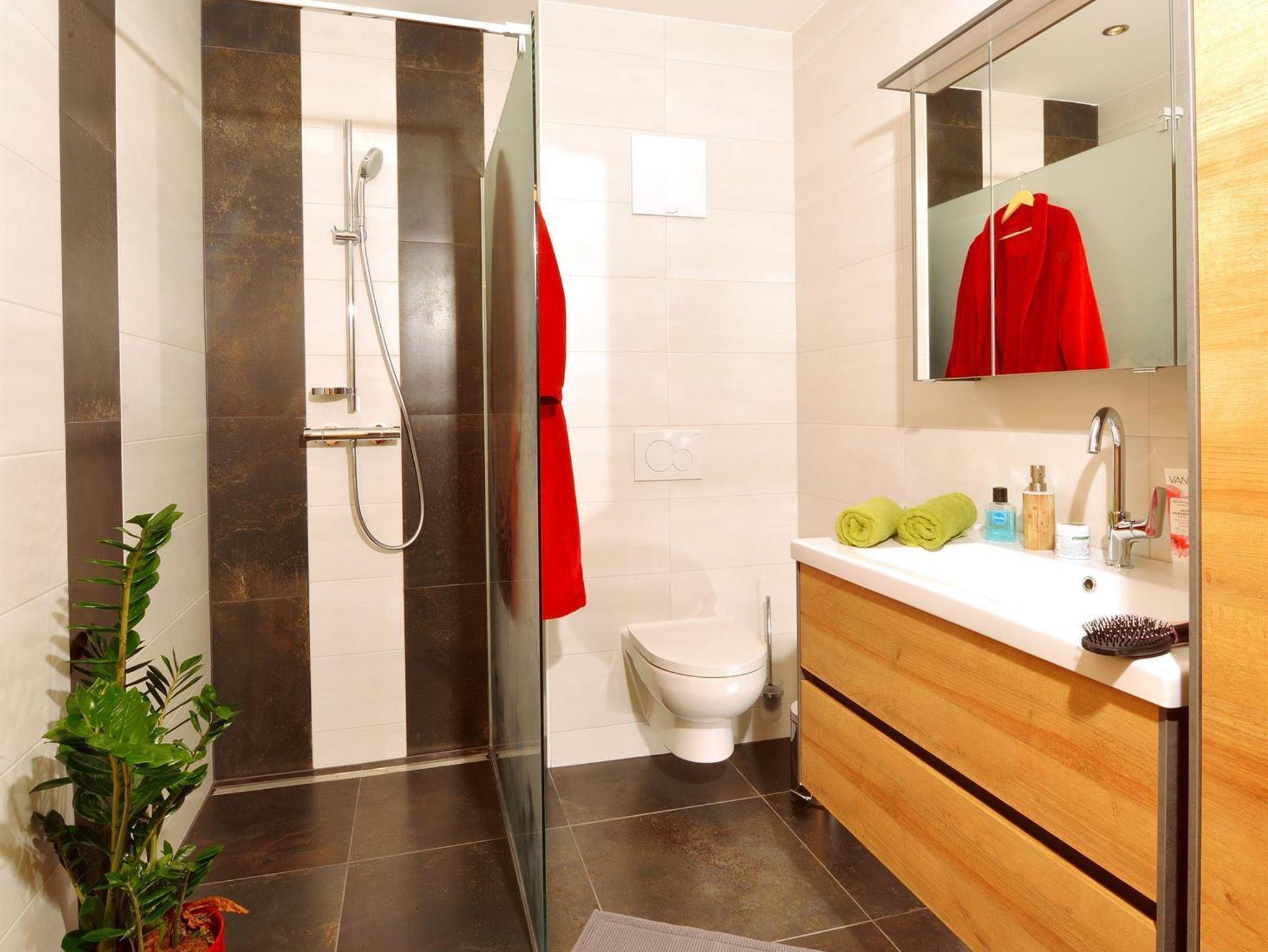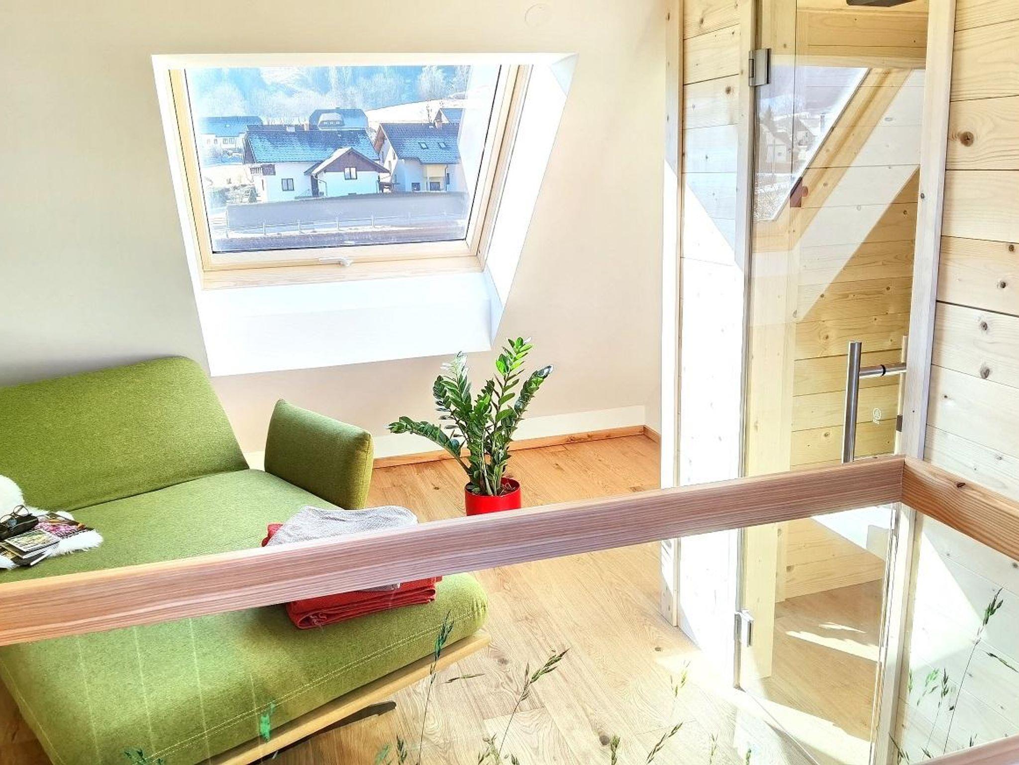 Hier kann man getrost auf den Wecker verzichten – man wird von der Sonne wachgeküsst, in sanfter Begleitung vom lieblichen Vogelgezwitscher. Von der Küche aus, erreicht man über eine kleine Stiege die wohnungseigene Infrarotkabine, welche direkt in der Dachgalerie untergebracht wurde. Hiefla unterteilen den Eingangsbereich vom Schlafzimmer und vermitteln somit das Gefühl von Hoamat und erinnern an die frühere Arbeitsweise hier am Hof.