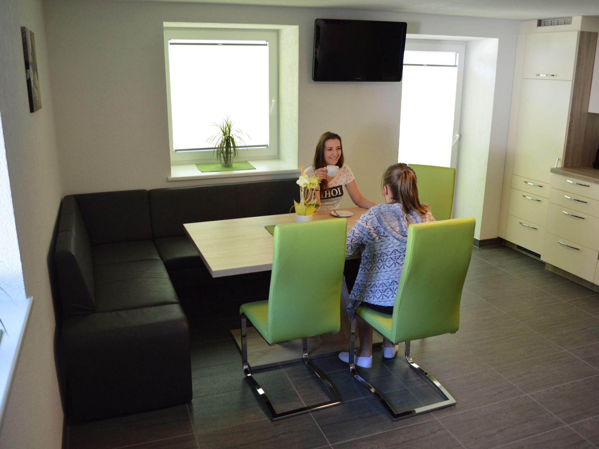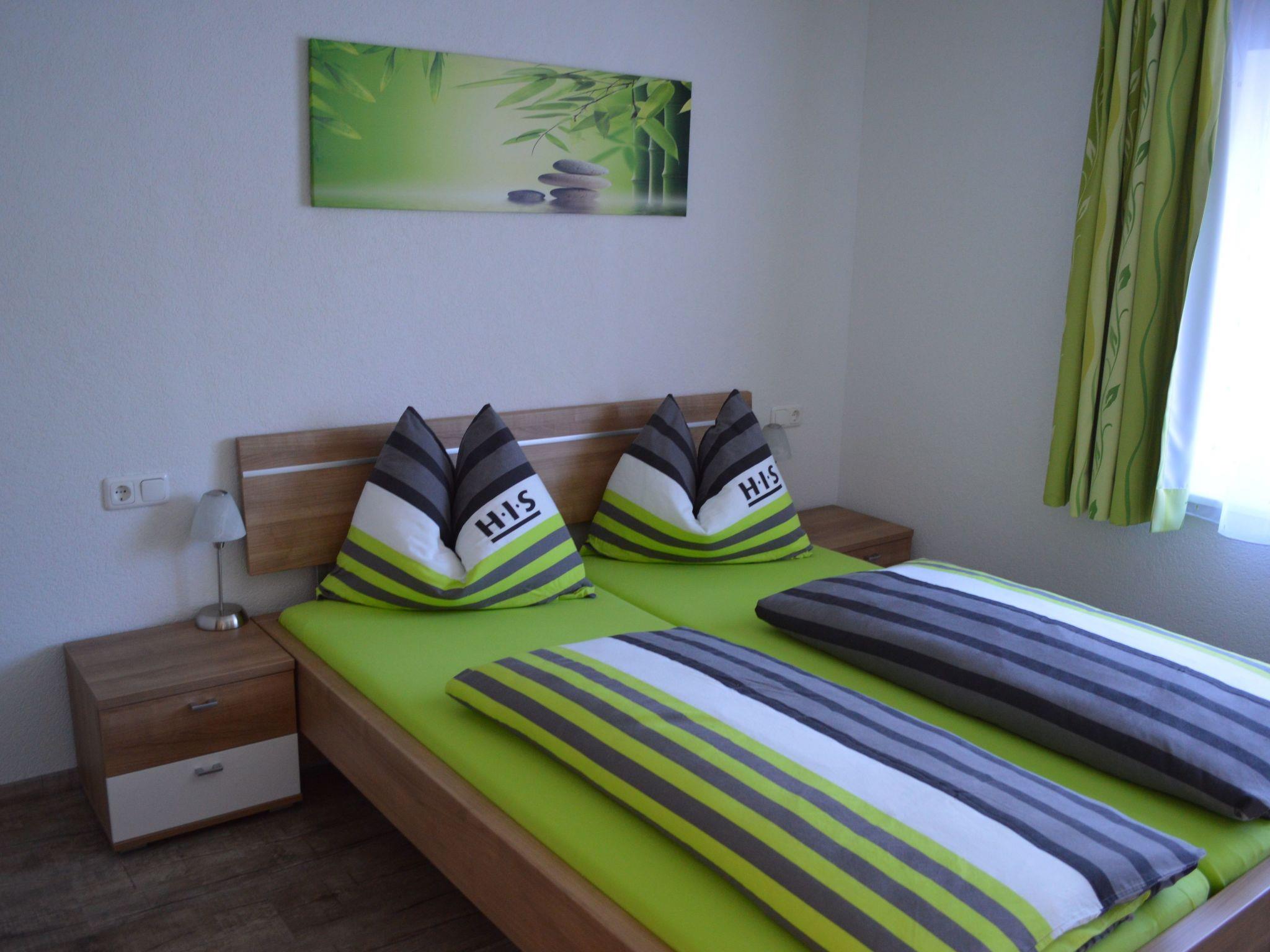 In this bright holiday flat, two bedrooms, a living, dining and cooking area, a bathroom and a separate WC branch off from the hallway. The entire living area of 65 m² is pleasantly heated by underfloor heating. In the first bedroom you sleep in a double bed measuring 180 cm x 200 cm, which is surrounded by two bedside tables on both sides. The second bedroom is furnished in the same way, but also has a single bed measuring 90 cm x 200 cm. Wardrobes for storing your travelling wardrobe are available in both rooms. The heart of the flat is the cosy living area with integrated kitchen-diner. Take a seat on the corner sofa to relax after a day out. The wall-mounted flat-screen TV with satellite TV provides entertainment in the evening. The fully equipped kitchenette allows you to cook for yourself with a dishwasher, a fridge with freezer compartment, a four-zone ceramic hob with oven and the usual small electrical appliances such as a coffee machine, kettle, microwave and toaster. The dining table invites you to enjoy a meal together on the comfortable leather corner bench with three swivel chairs. The daylight bathroom is equipped with a vanity unit with mirror cabinet, a towel dryer, a walk-in shower with shower partition and a bathtub. The separate WC has a window and a wash hand basin.