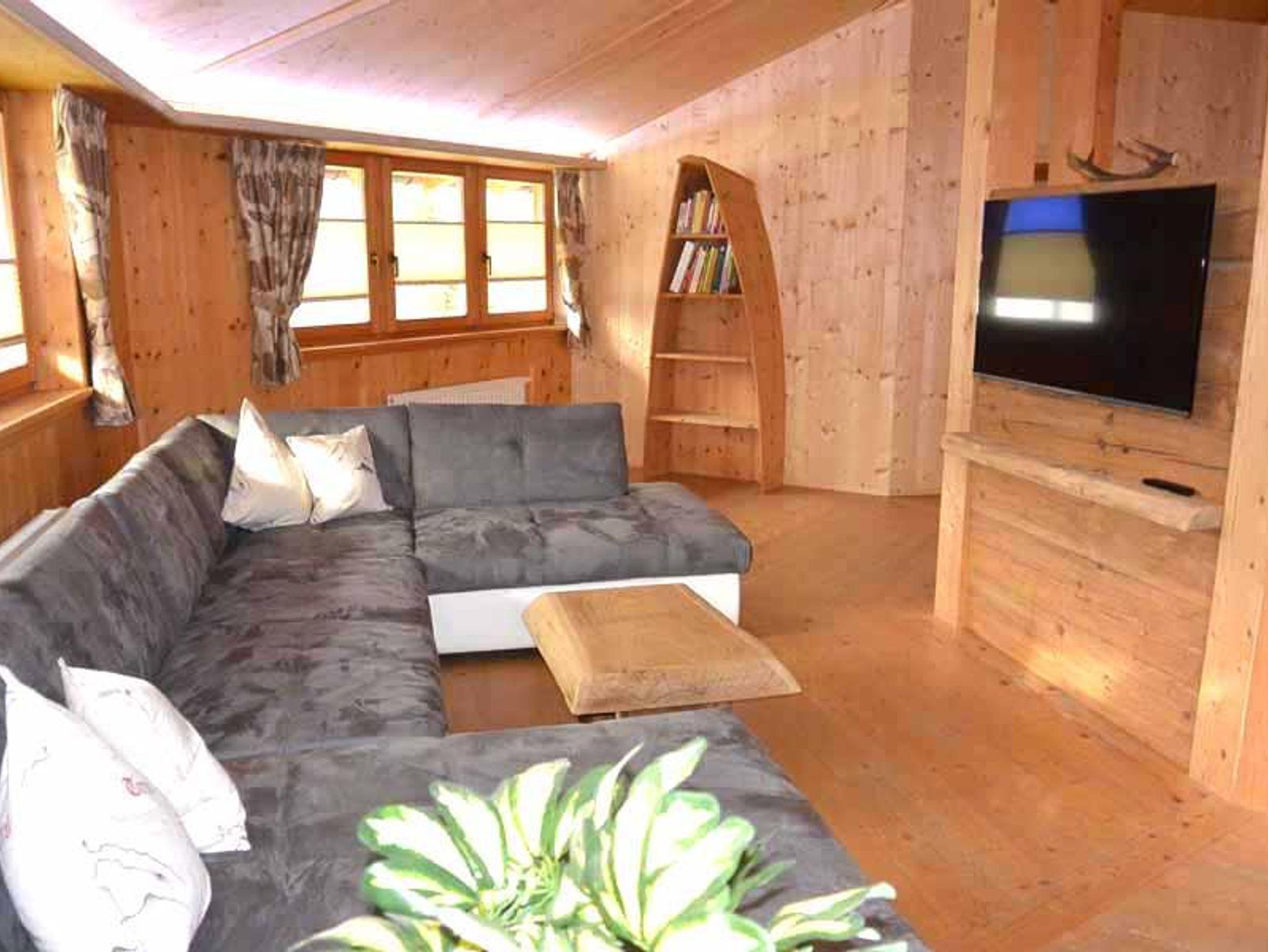 Im Wohnbereich befindet sich eine gemütliche Wohnlandschaft mit einem großen Flat-TV.