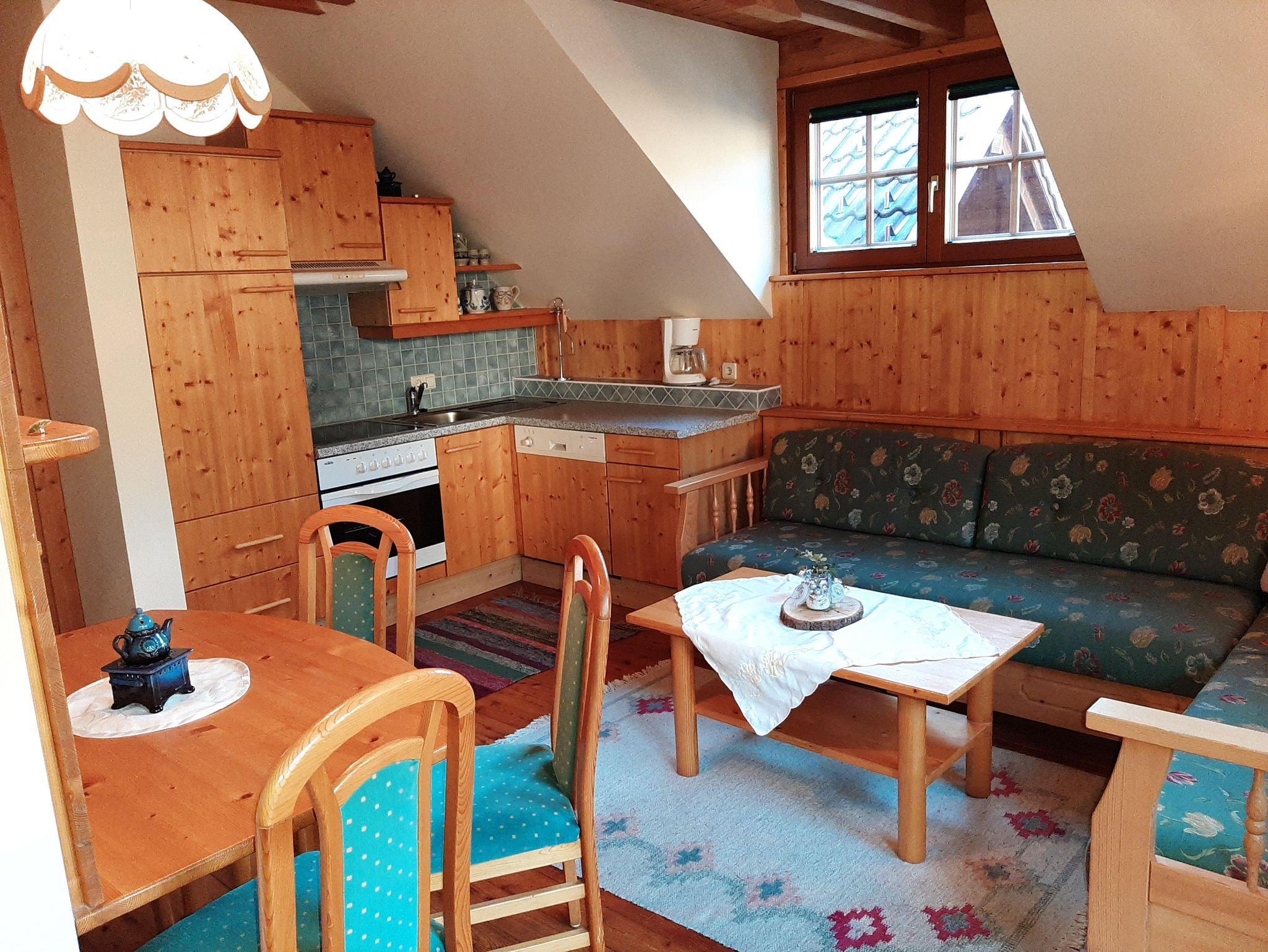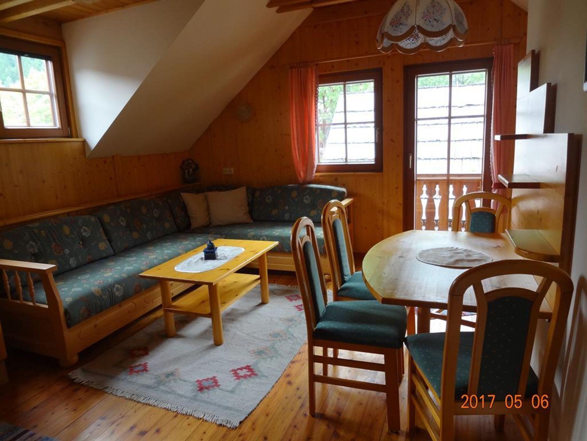 Ferienwohnung mit 57 m², Wohnküche mit Essecke, Schlafbereich für vier Personen, Doppelcouch (im Küchenbereich) separates Doppelzimmer, Bad mit Badewanne, WC, Sat TV, W-Lan, Balkon