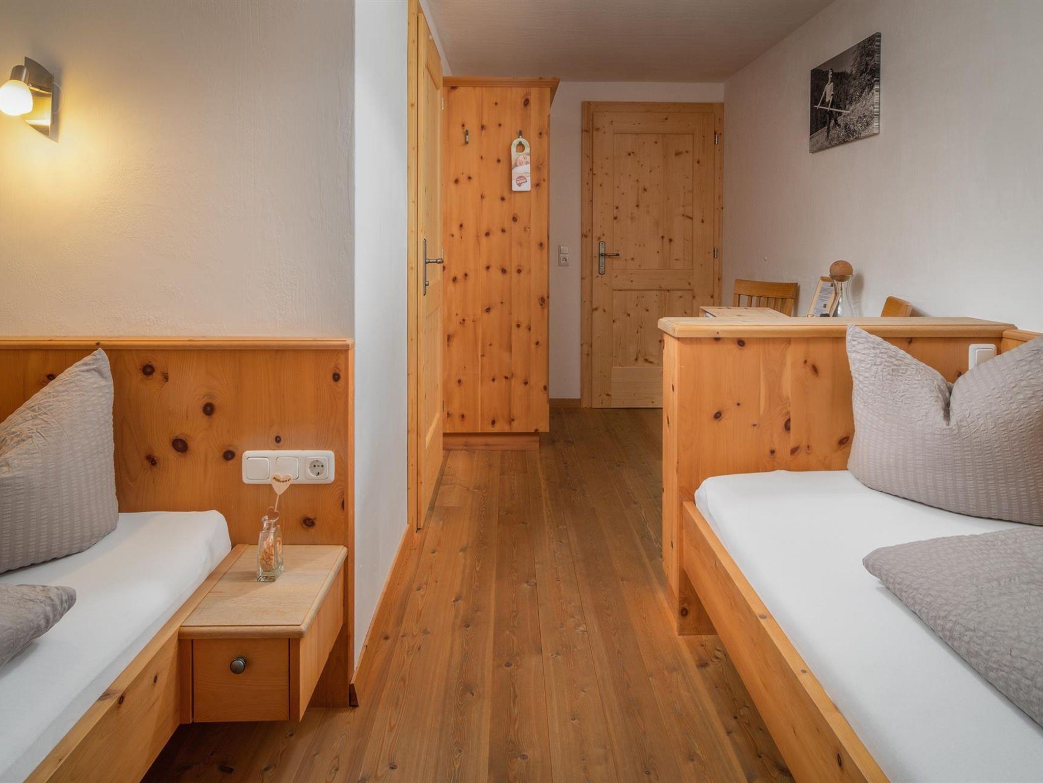 Das kleine aber feine Zweibettzimmer hat ca. 15m² und ist nach Westen ausgerichtet. Besonders wohltuend ist der Duft der Zirbe. Das Zimmer ist mit Zirbenmöbel, Holzboden, Dusche und WC, SAT-TV und direkten Zugang zum Balkon ausgestattet.