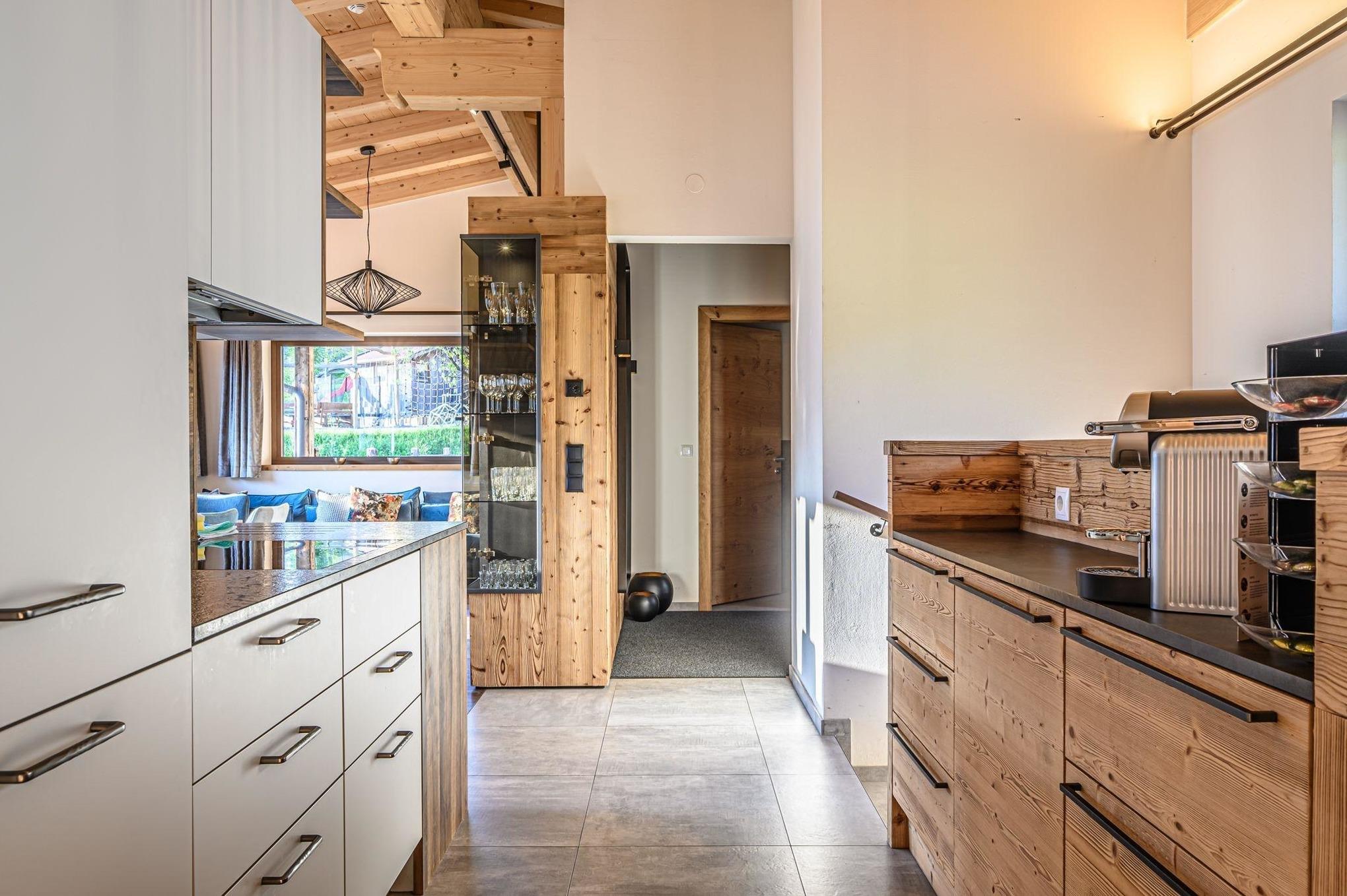 Die moderne Küchenzeile ist umfassend ausgestattet. Es sind nicht nur alle Annehmlichkeiten vorhanden, welche das Kochen zum Genuss werden lassen, die private Bar, eine Nespresso Pro Kaffeemaschine und eine Teebar von Bioteaque ergänzen die Küchenausstattung zusätzlich.