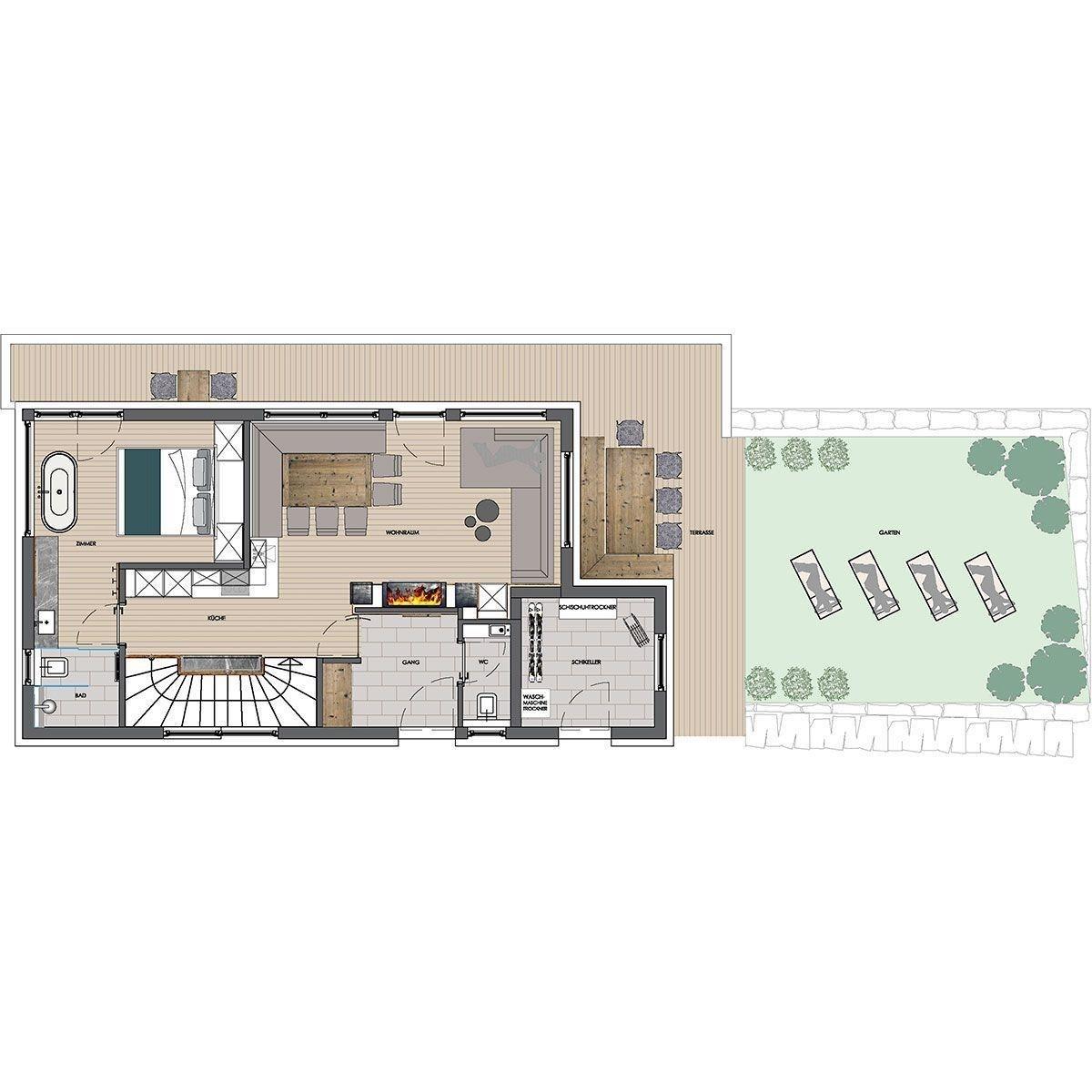 Unmittelbar neben der Haustür befindet sich der private Skiraum der Unterkunft. Hier kann nicht nur das eigene Equipment gelagert werden, es stehen zusätzlich ein Schuhtrockner, eine Waschmaschine und ein Wäschetrockner zur Verfügung.
