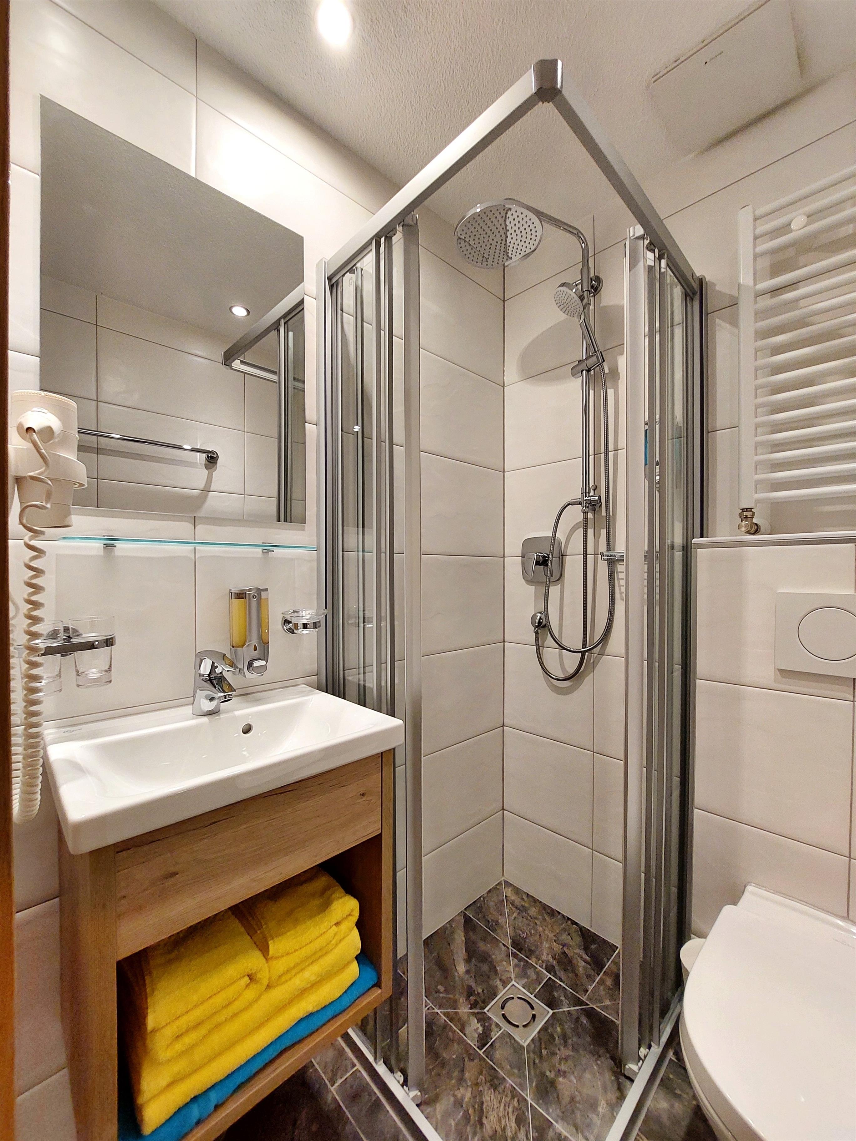 - 1 Badezimmer mit Dusche, WC, Haarfön, Kosmetikspiegel