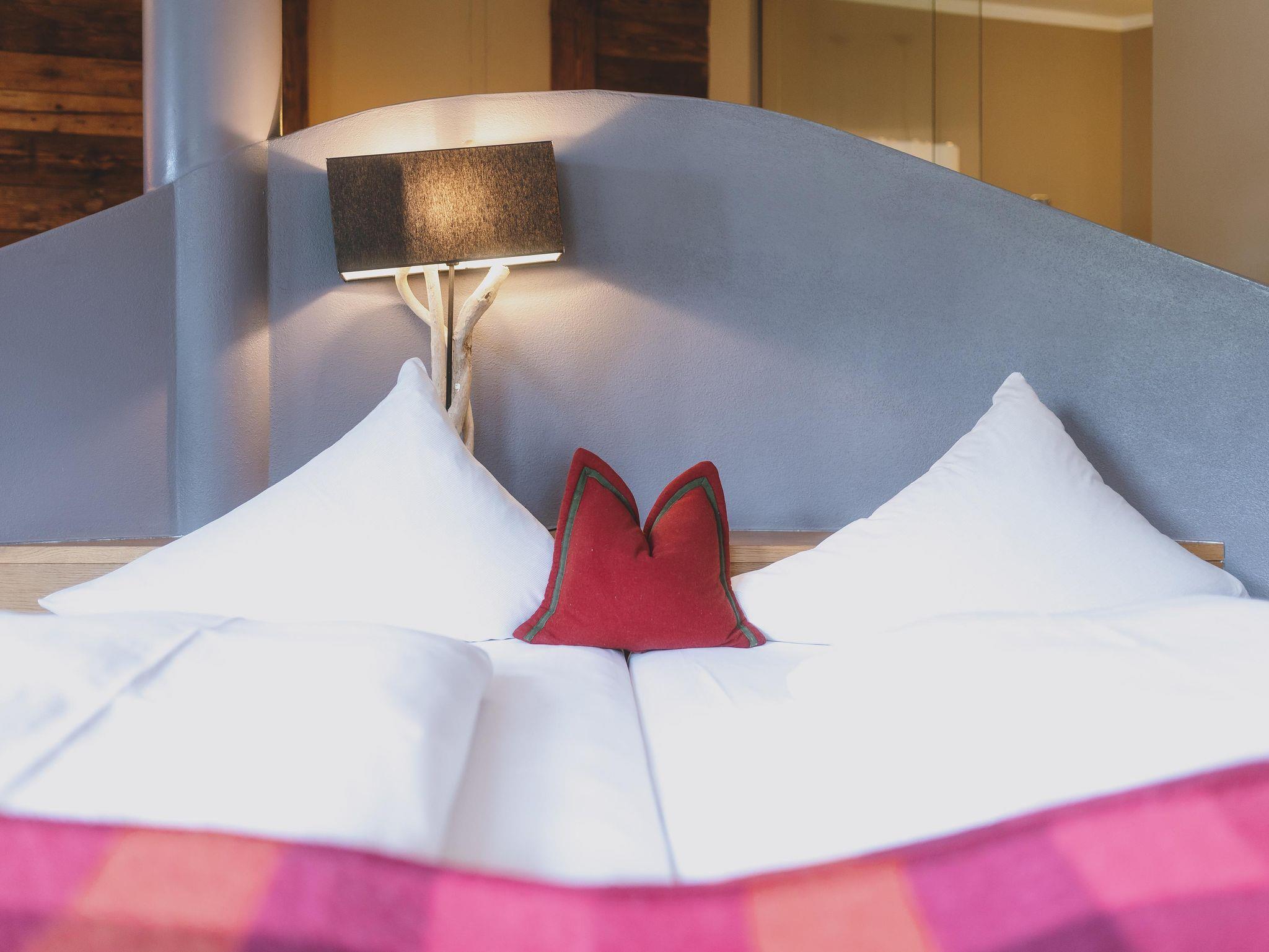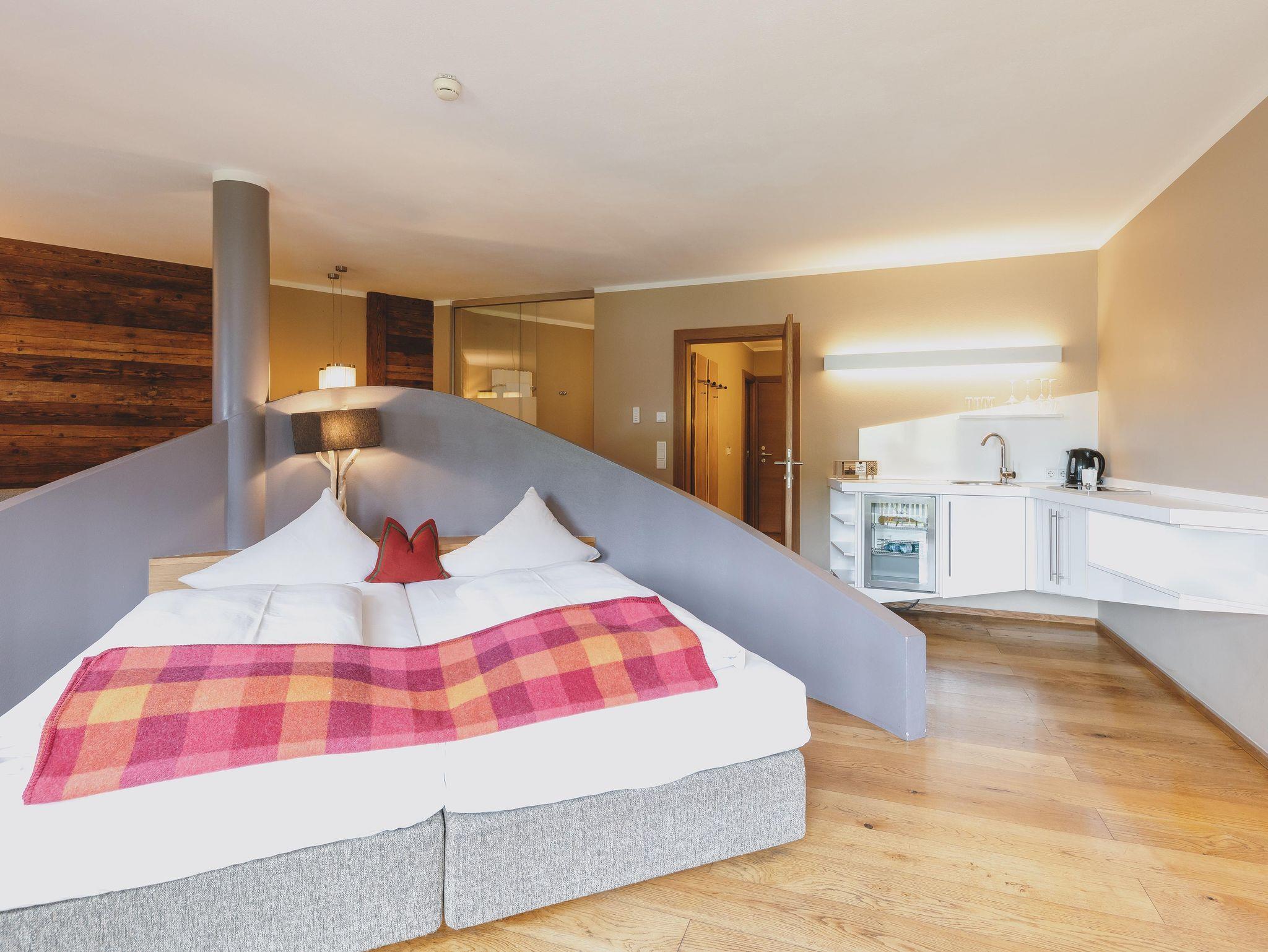 Vom Bett aus schon auf den Bergen. Wie das geht? Ganz einfach in unseren „kleinen“ aber feinen Suiten mit extra großem Doppelbett erwartet Sie ein atemberaubender Blick auf die Berge. Sie verbringen Ihren Urlaub auf 55qm reiner Behaglichkeit.