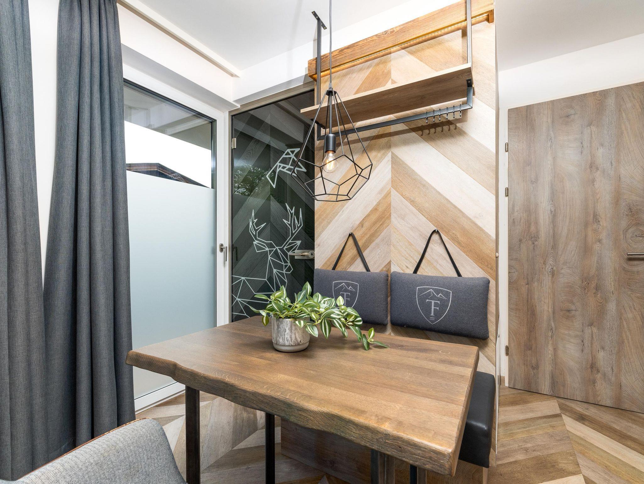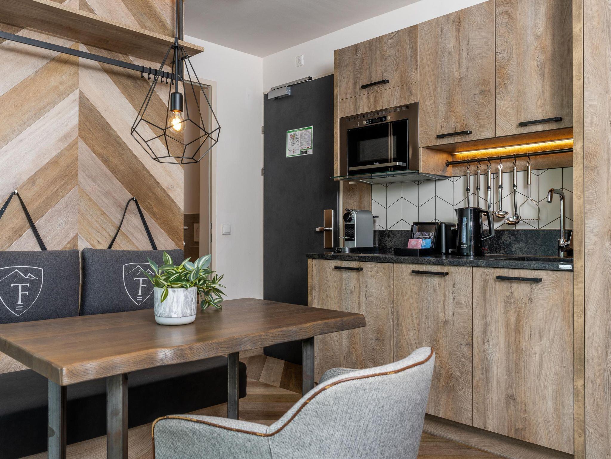 Unser Studio eignet sich perfekt für den Urlaub zu zweit. Die Einrichtung im modernen alpinen Stil schafft eine helle Atmosphäre. Eine kleine Kochnische und eine gemütliche Sitzbank machen den Raum neben einem komfortablen Bett und einem Bad mit Dusche und WC komplett. Der private Balkon lädt dazu ein, den Abend bei einem guten Glas Wein ausklingen zu lassen.