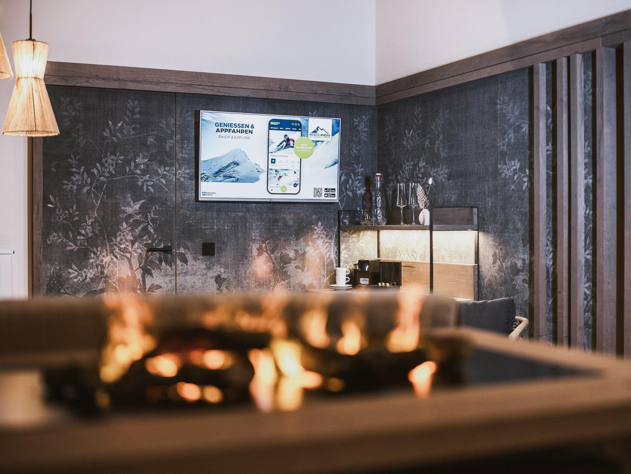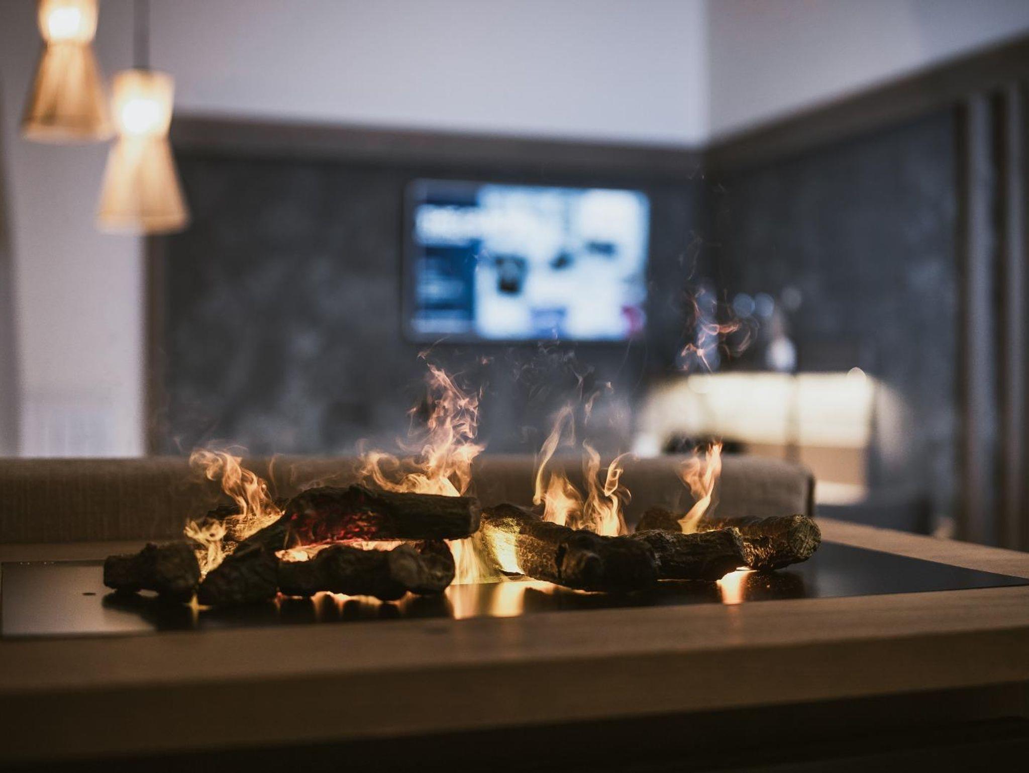 • Relaxlounge mit Sofa und Couchtisch mit Effektfeuer