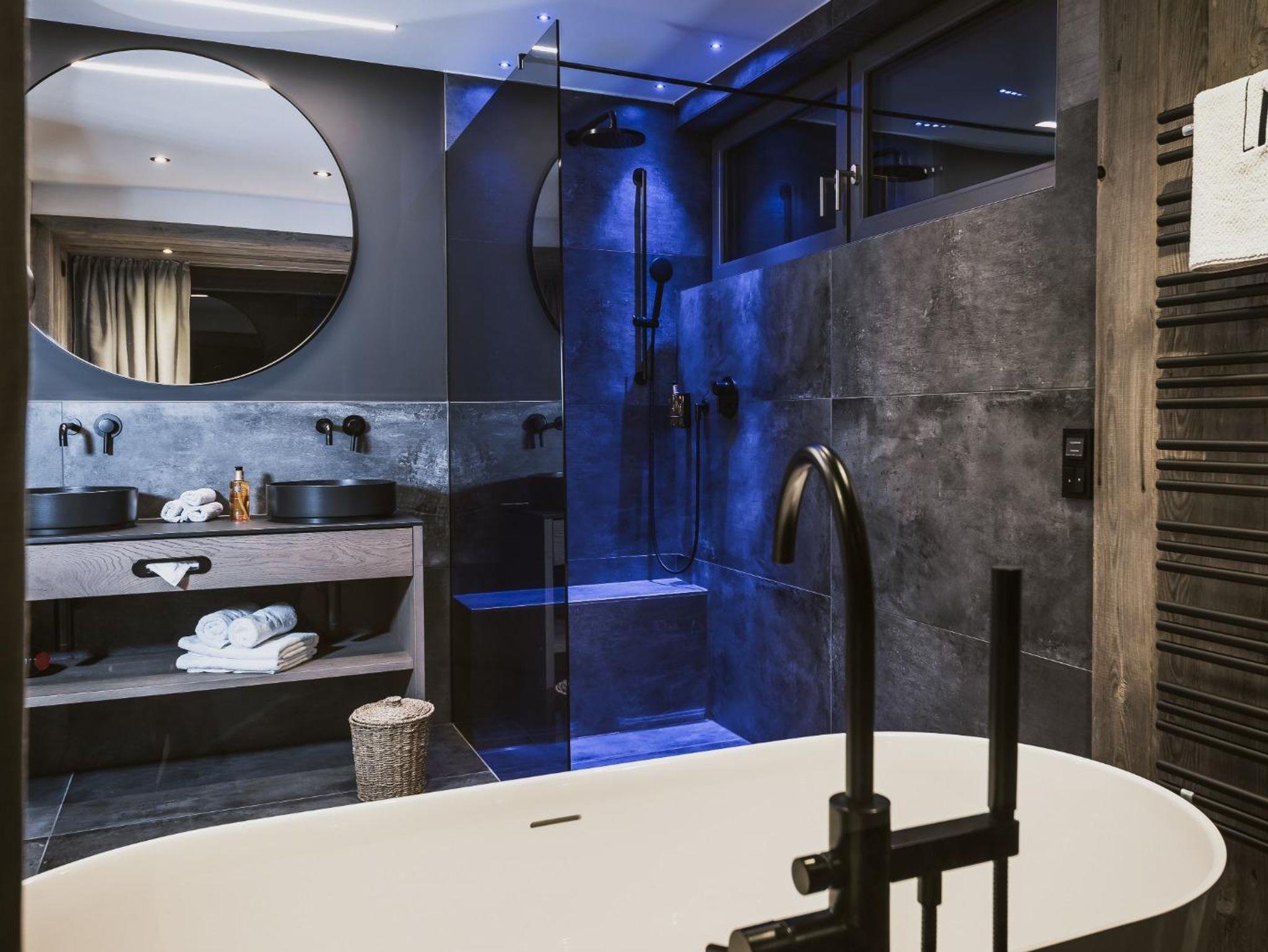 • offenes Lifestyle Bad mit Blick ins Zimmer, Doppelwaschbecken Badewanne und Regendusche