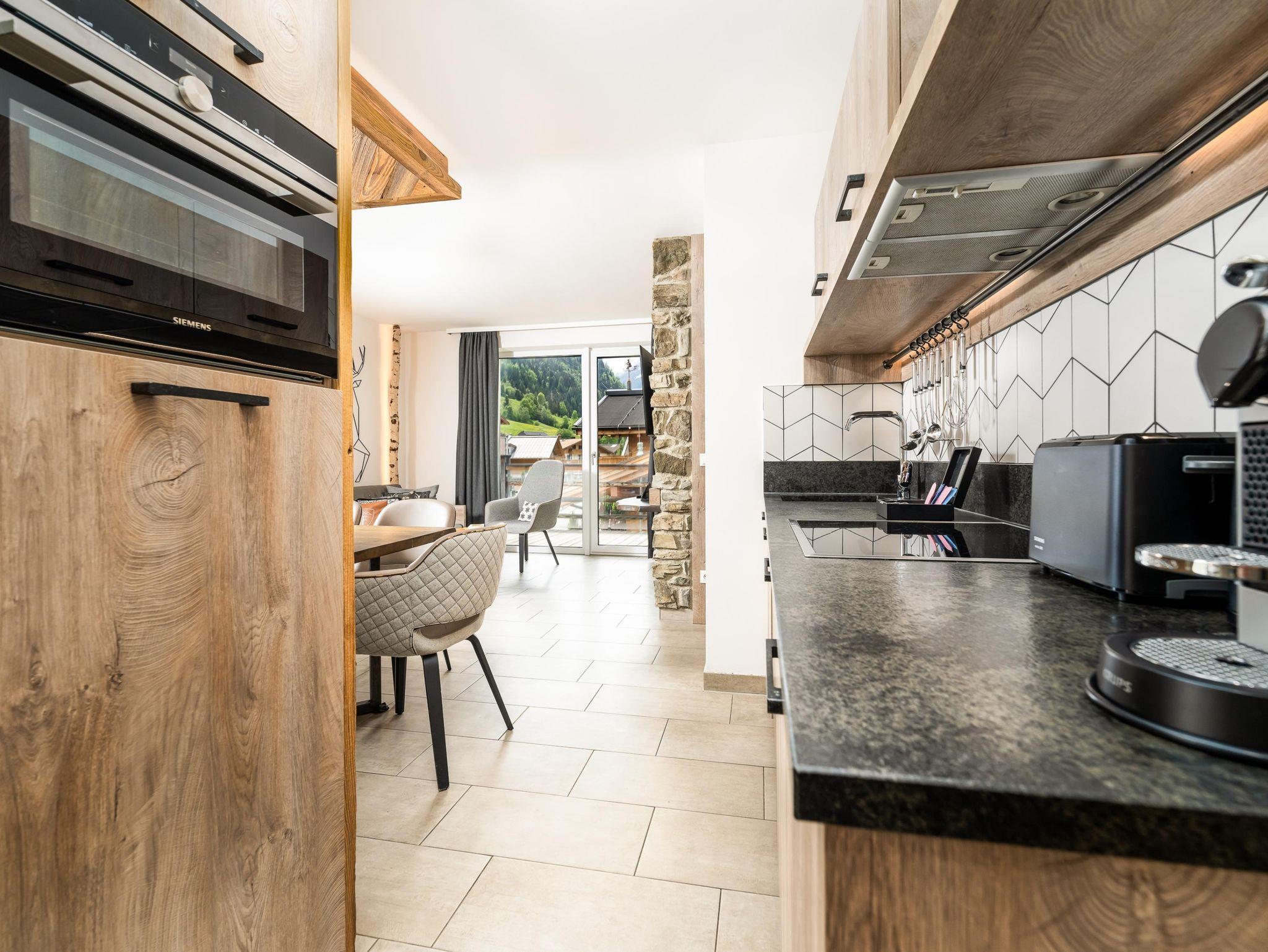 Die Doppelbetten in den beiden Schlafzimmern der Suite, sowie die integrierte Schlafcouch im Wohnbereich bieten Platz für bis zu sechs Personen. Es erwarten Sie zwei Badezimmer mit Dusche und WC und ein offener, hochwertig möblierter Wohnbereich mit einer modernen Küche. Die Holzelemente in der Suite lassen Sie den alpinen Lifestyle spüren. Der gemütliche Esstisch und der private Balkon sind der perfekte Platz, um ein gutes Glas Wein zu genießen und einen spannenden Tag in den Bergen Revue passieren zu lassen.