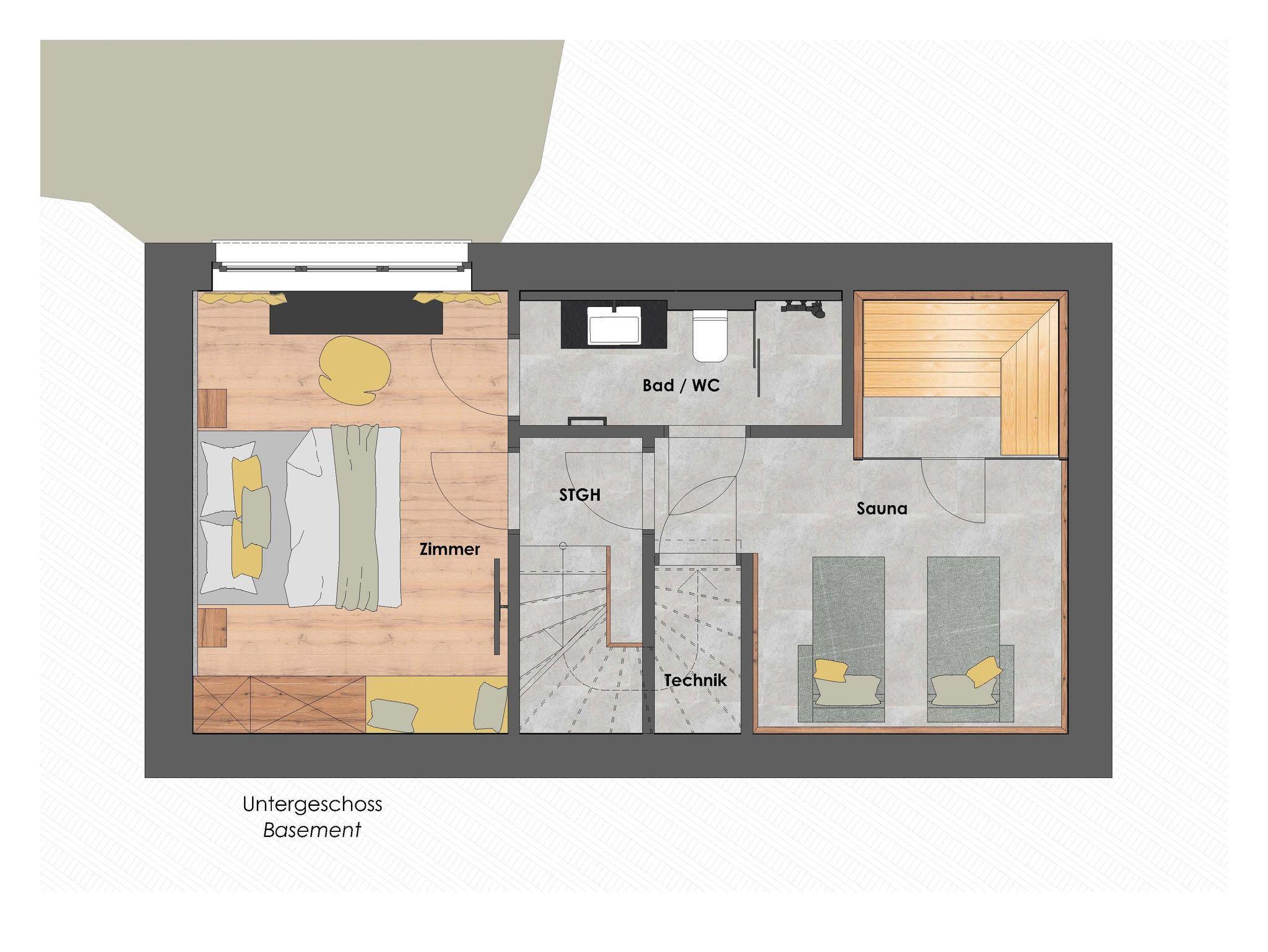 Im UG befindet sich das 3.Schlafzimmer mit Tageslicht & Dusche/WC sowie eine edle Sauna mit Liegen zum Entspannen.