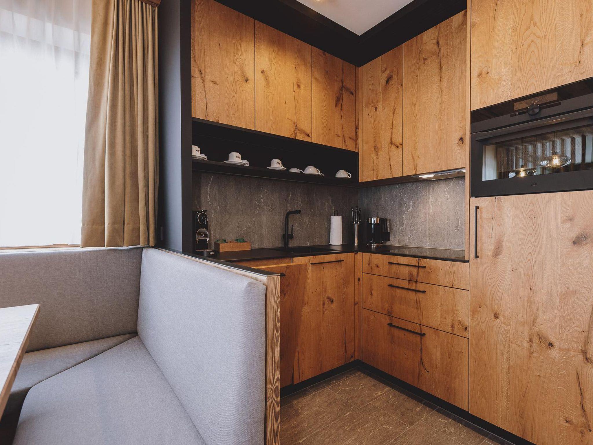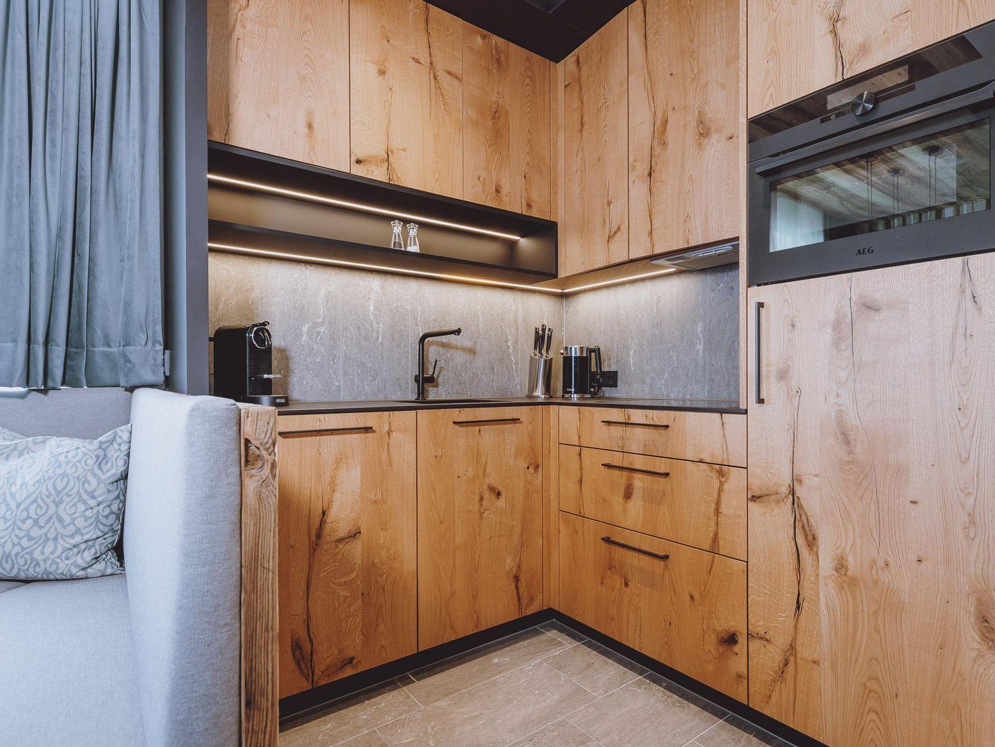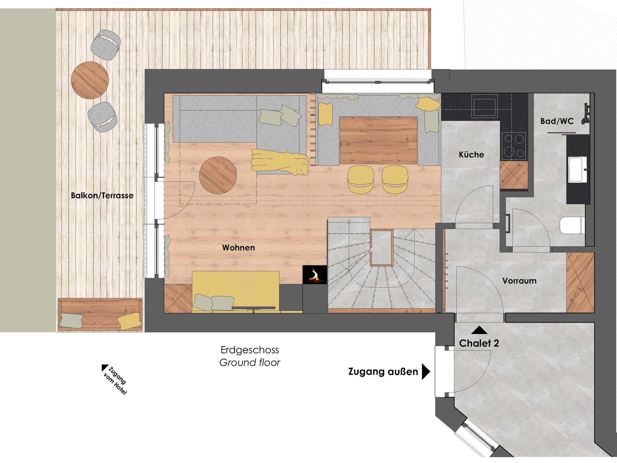 Die dreistöckigen Chalets bieten im Erdgeschoss eine vollausgestattete Küche, vom heimischen Tischler gefertigt mit Backofen samt Mikrowellenfunktion, Geschirrspüler, Induktionsherdplatten und Kühlschrank mit Tiefkühlfach sowie Kaffeemaschine und Wasserkocher. Der große Holz-Esstisch für gemeinsame Mahlzeiten grenz direkt an den Wohnbereich mit gemütlichem Kamin, Sofa ( auch als zusätzlicher Schlafplatz für 2 nutzbar) und einem Diwan (bequeme Liege) sowie ein Badezimmer mit Dusche & WC .
