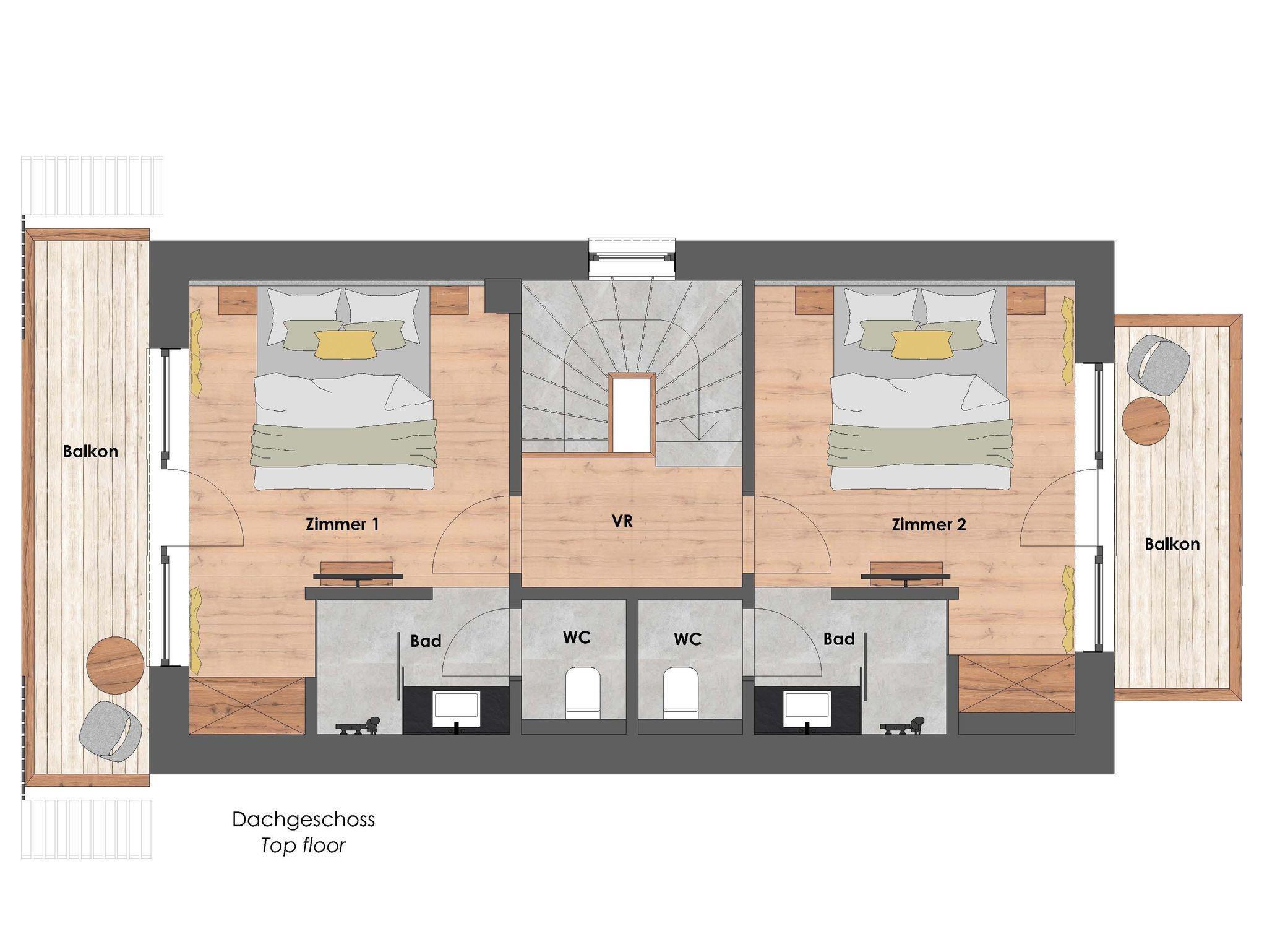 Im OG finden Sie 2 Schlafzimmer, je mit Dusche/WC & Balkon.