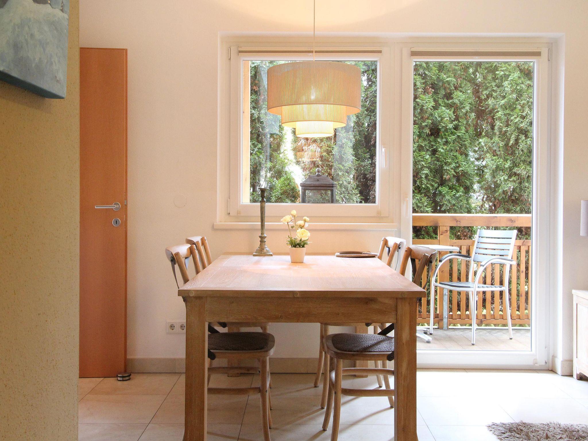 Das Ein-Schlafzimmer Apartment mit Doppelbett liegt im Erdgeschoss und verfügt über eine Fußbodenheizung. Das Badezimmer ist mit einer Dusche, Waschbecken und Toilette ausgestattet. Über den Flur gelangt man in das komfortable und geräumige Wohnzimmer mit gemütlicher Sitzecke und integrierter Schlafcouch. Die offene Küche und der Esstisch bieten eine ideale Umgebung für gemeinsame Mahlzeiten und geselliges Beisammensein.
