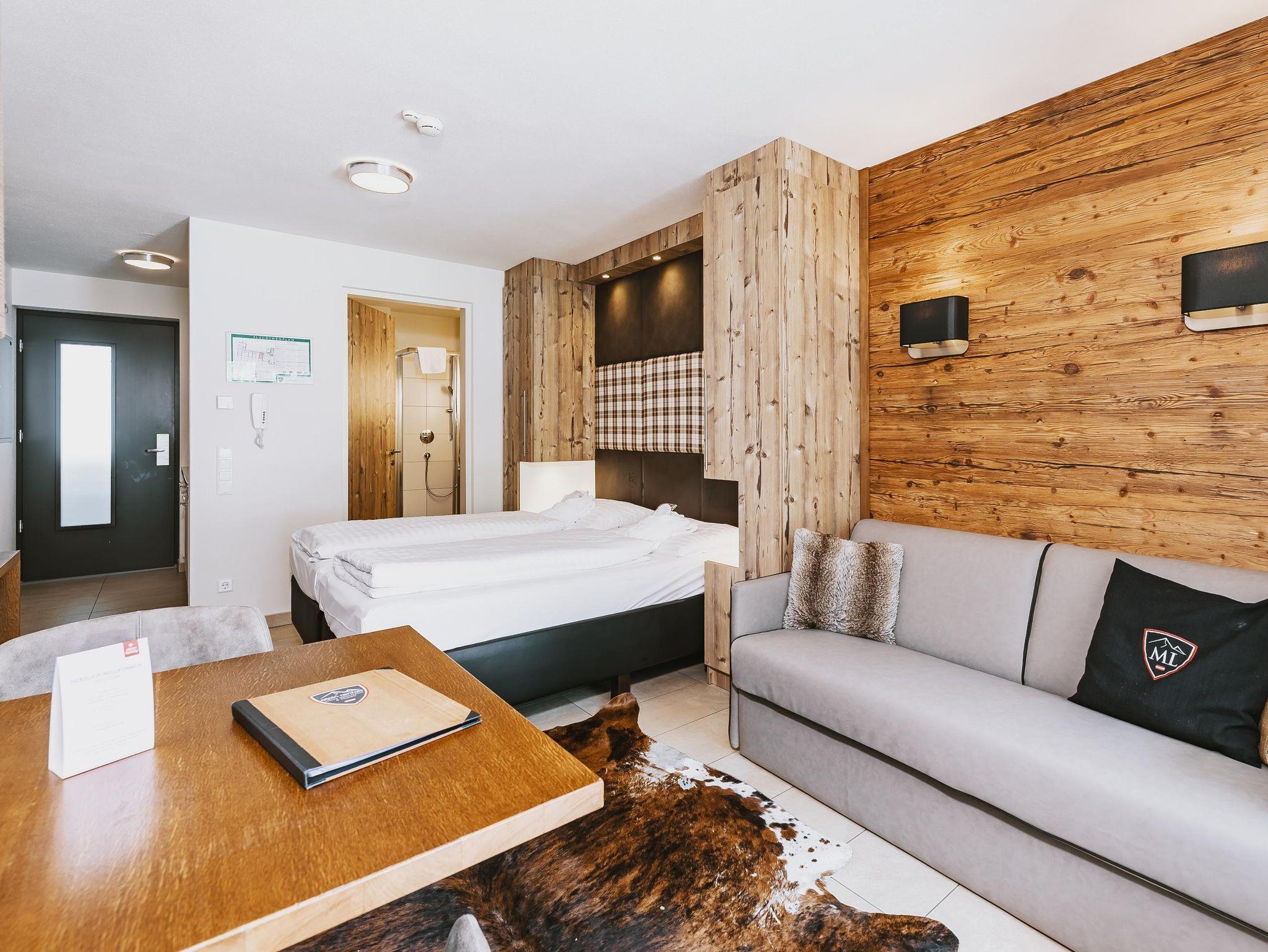 Unser Studio für bis zu 3 Personen überzeugt mit seiner Einrichtung. Dazu gehören eine voll ausgestattete Küche mit Essbereich, Badezimmer mit Dusche oder Badewanne und Toilette sowie gemütlichem Doppelbett und Schlafcouch. Auf der privaten Terrasse können Sie einen schönen Tag in den Bergen ruhig ausklingen lassen.