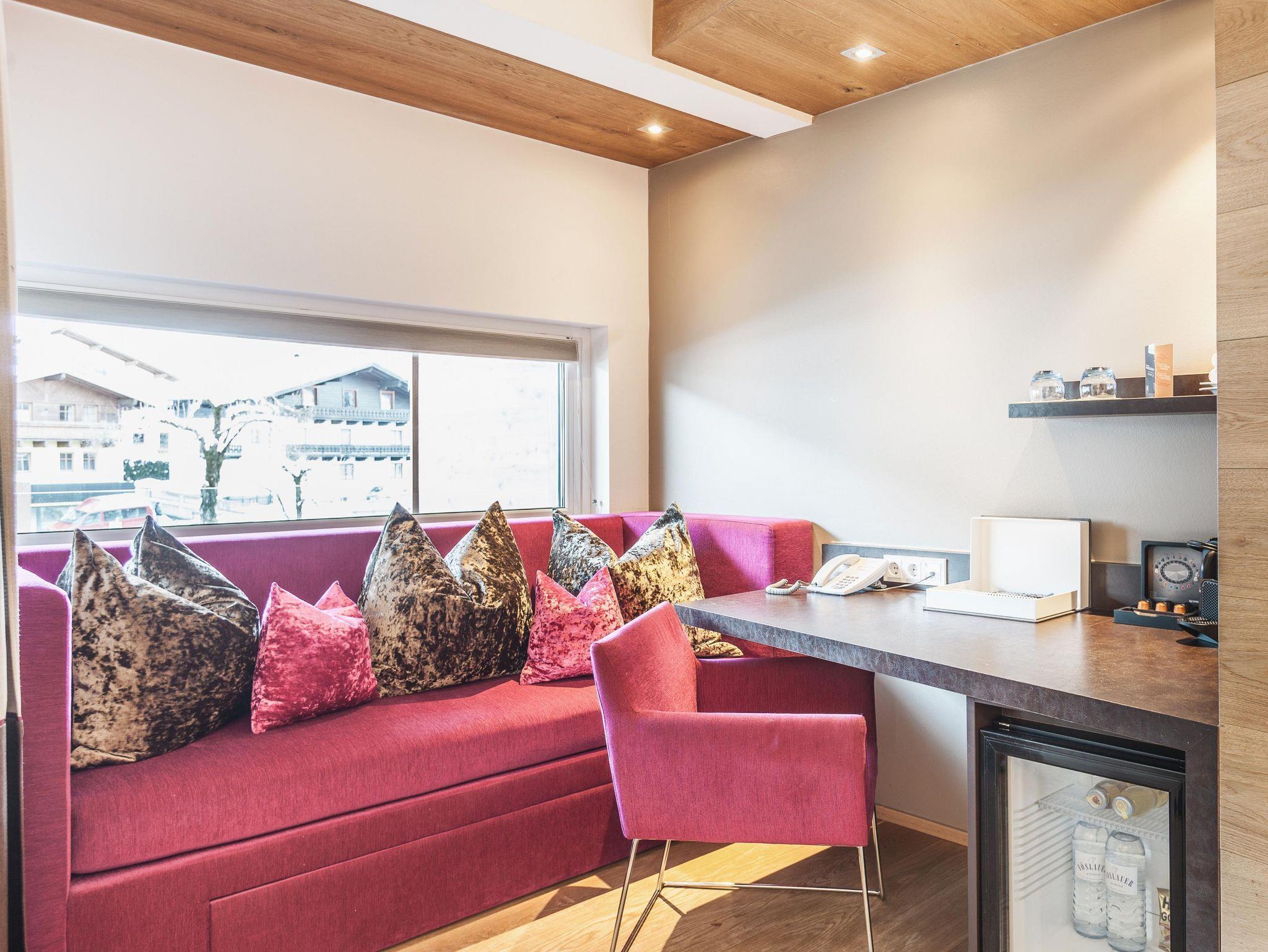 Unser Zimmer PREMIUM DORFPLATZ mit 30 Quadratmetern bietet allen, die gerne mitten im Geschehen sind und sich ins kunterbunte Leben stürzen, einen exklusiven Blick auf den Salzburger Platz, dem zentralen Platz in Kaprun. Und als Draufgabe wartet am Balkon noch die Aussicht auf die majestätische Silhouette des Kitzsteinhorns auf sie. Gemixt mit ganz viel Komfort, wie 32'' LED TV mit Kabelanschluss, kostenloses WLAN, Minibar, Espressomaschine, Safe, Badezimmer mit Regendusche, separates WC und großzügiger Balkon, erwartet sie ein Zimmercocktail der Extraklasse. Die Kuschel-Couch-Ecke kann zu einem Schlafsofa für den Nachwuchs vorbereitet werden.