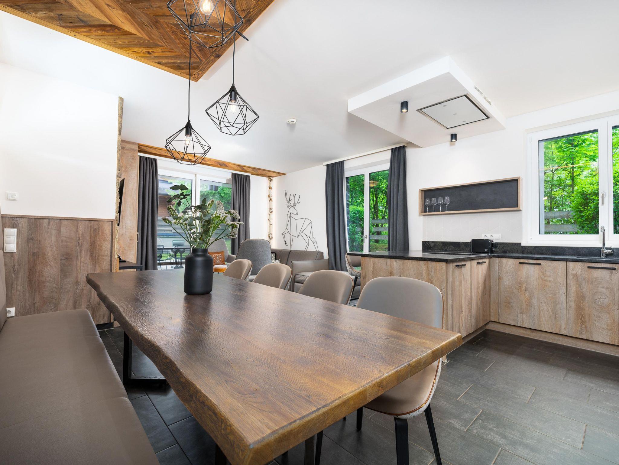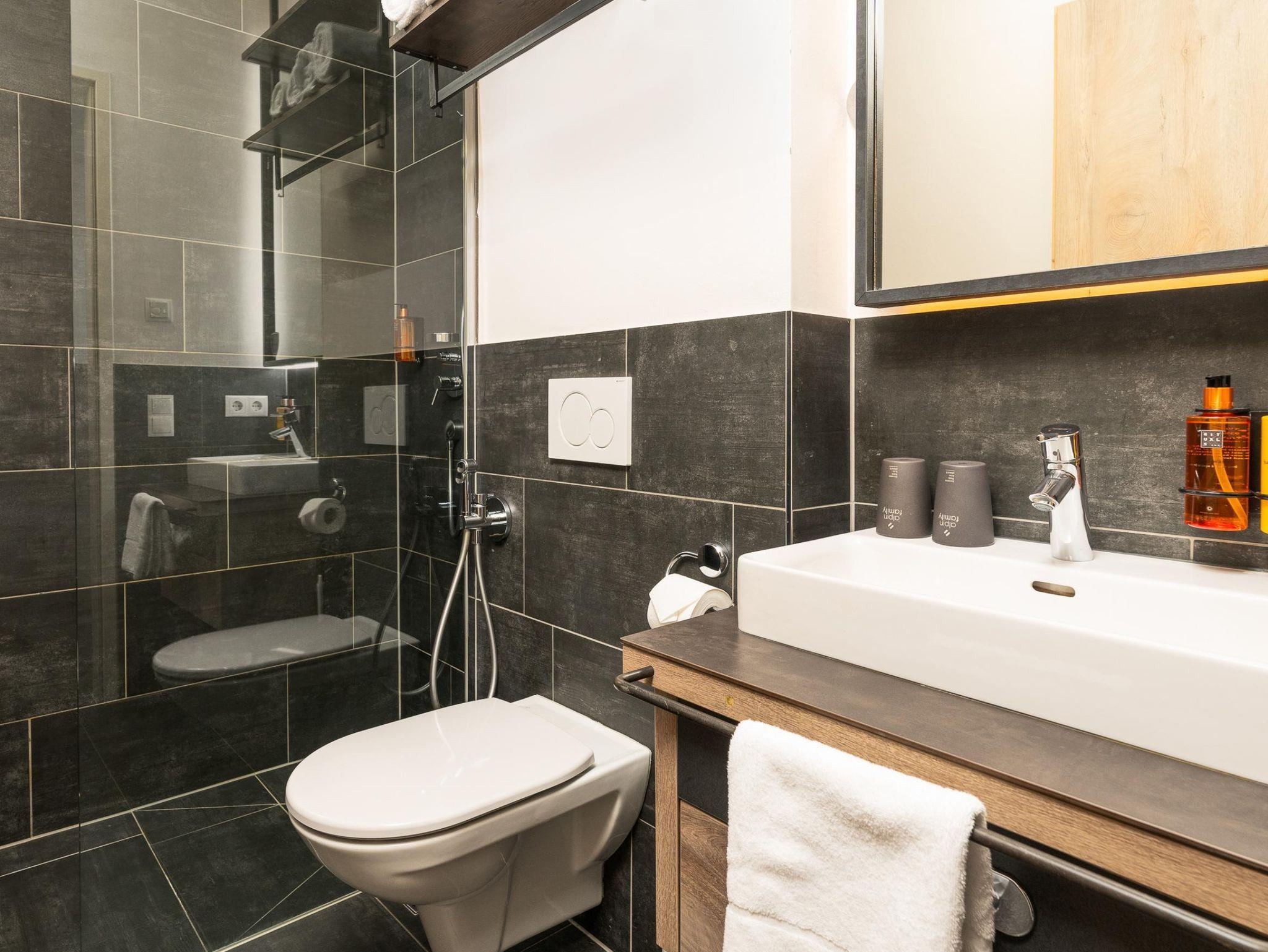 Unsere modern ausgestattete Suite besteht aus drei gemütlichen Schlafzimmern und drei Badezimmern mit Dusche und WC. Sie bietet genügend Platz für bis zu acht Personen. Der großzügige Wohnbereich verfügt über eine voll ausgestattete Küche, einen großen Esstisch und eine Schlafcouch. Die in der ganzen Suite verbauten Holzdetails lassen Sie den alpinen Lebensstil verspüren. Vom Wohnzimmer aus gelangen Sie direkt auf die private Terrasse, auf der Sie entspannen können.