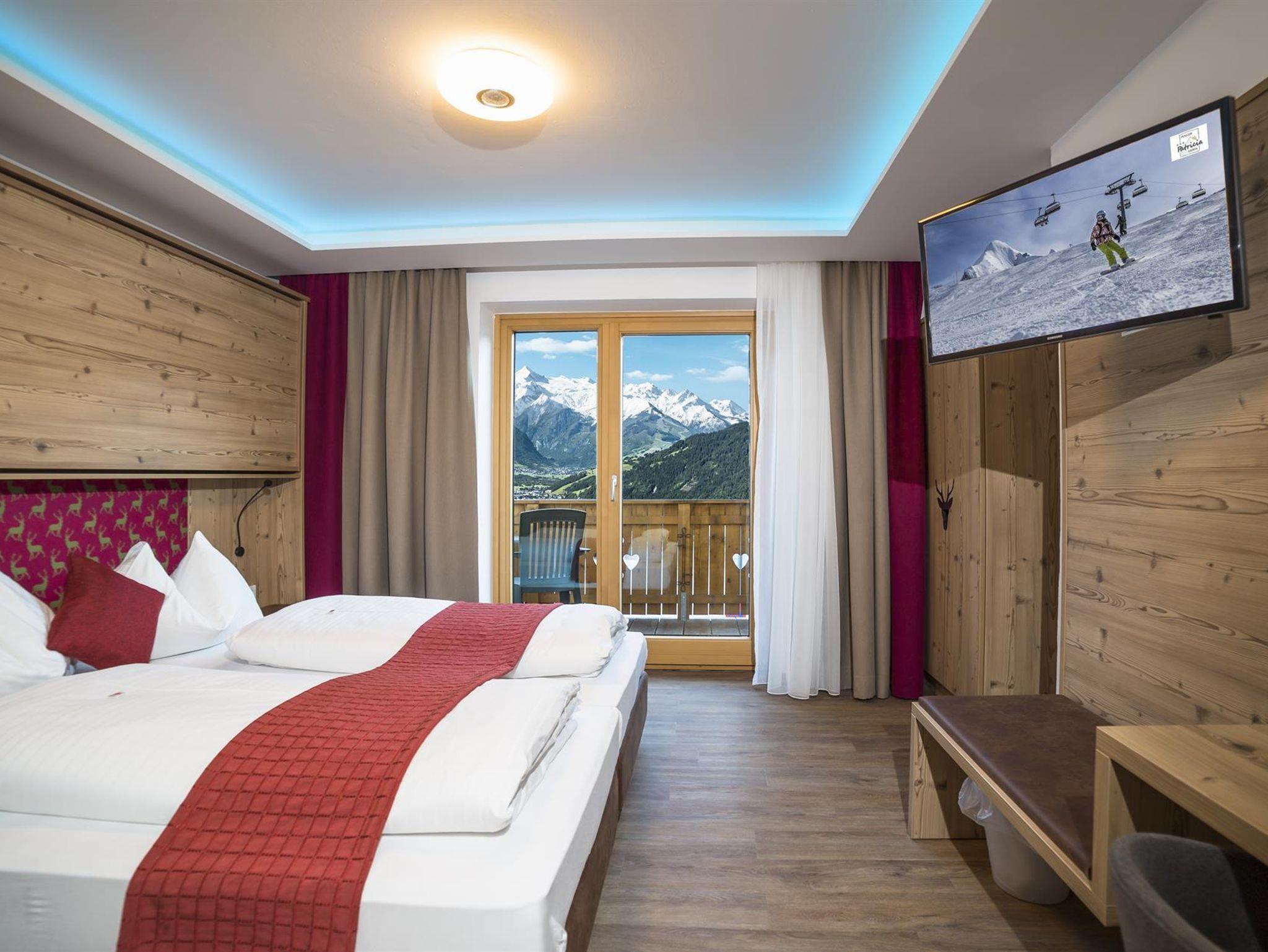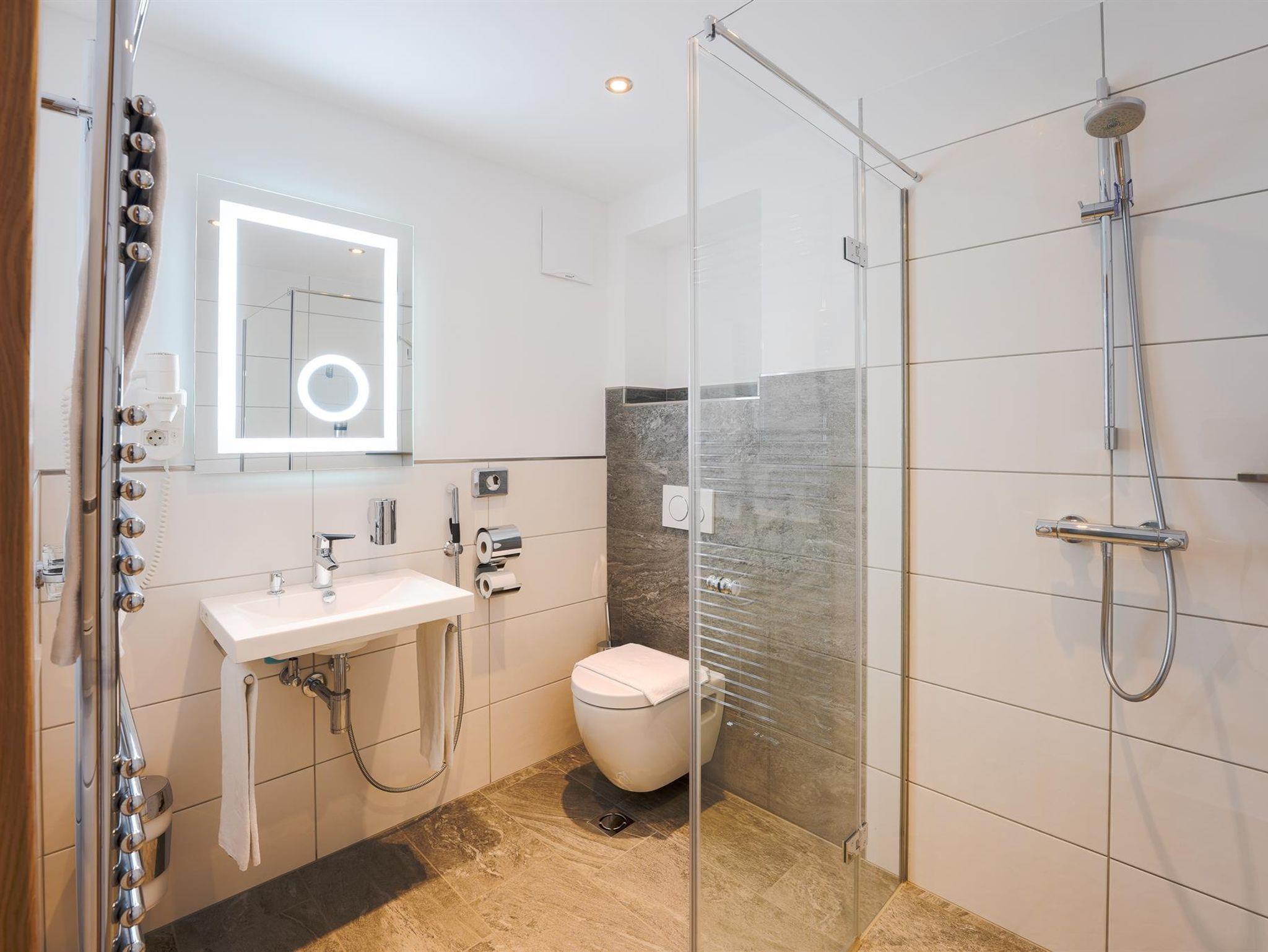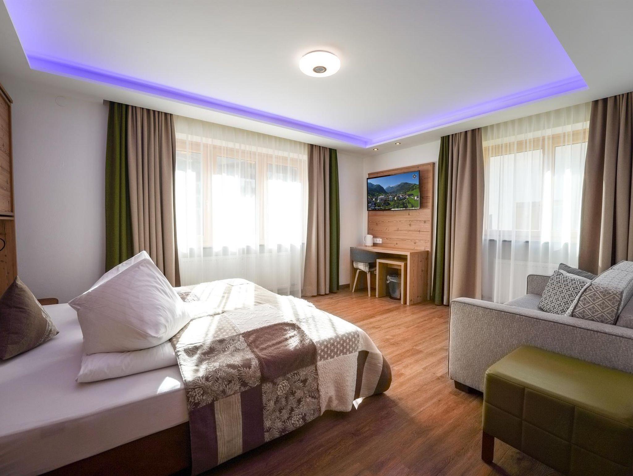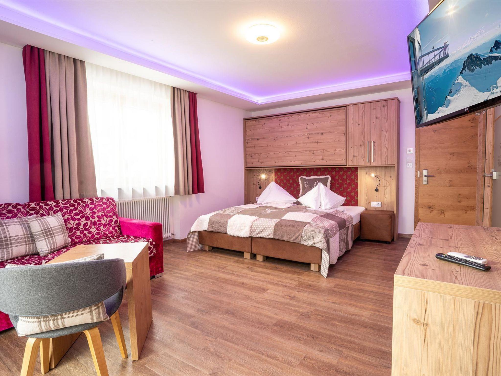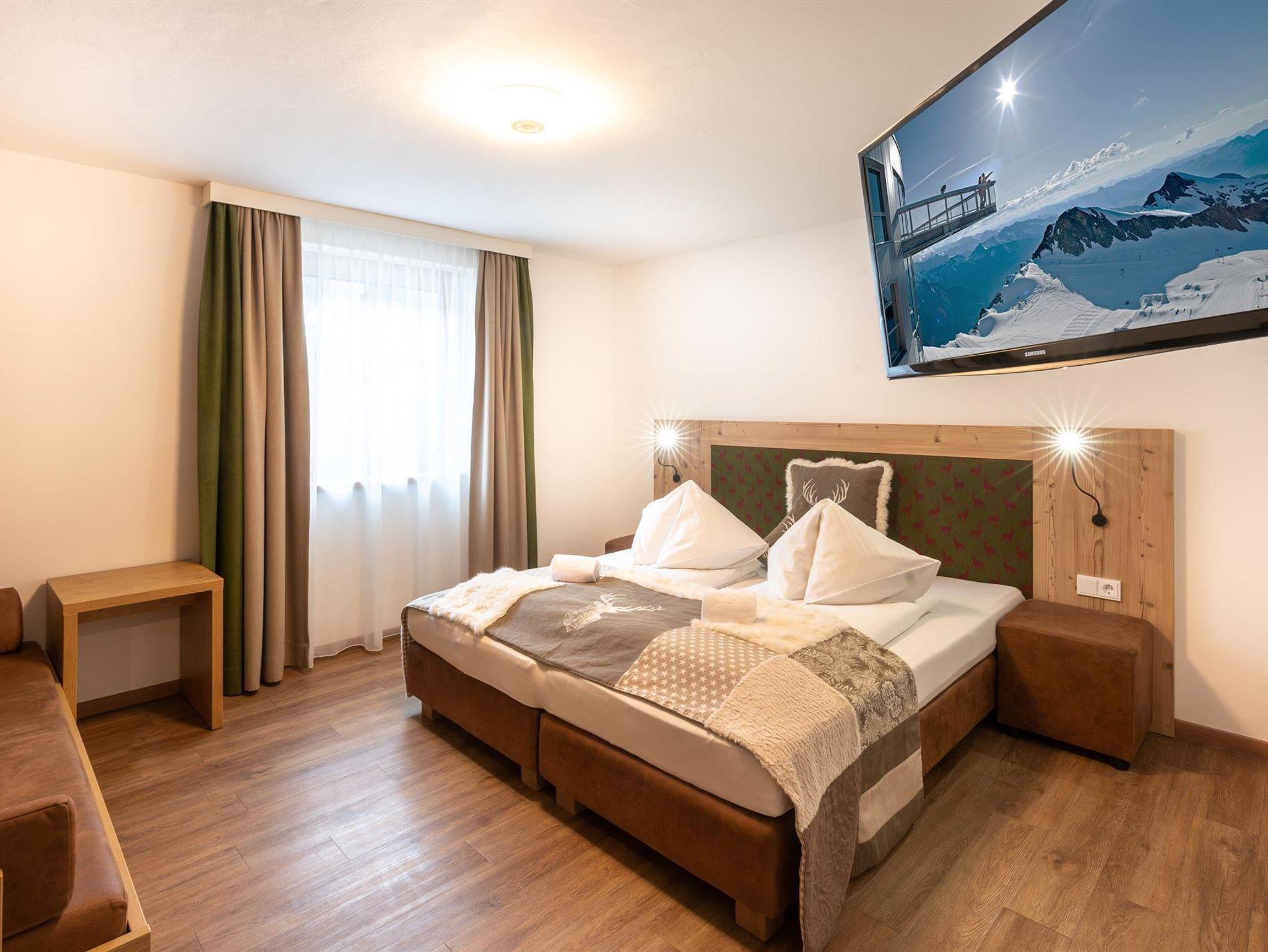 Das geschmackvoll ausgestattet und moderne Familien Zimmer hat eine Kapazität für 4 Personen und verfügt über 28 m². Diese Zimmerkategorie befindet sich teilweise im Erdgeschoss und im 1. Stock mit Dusche, einige Zimmer bieten zudem einen Balkon mit Bergblick.