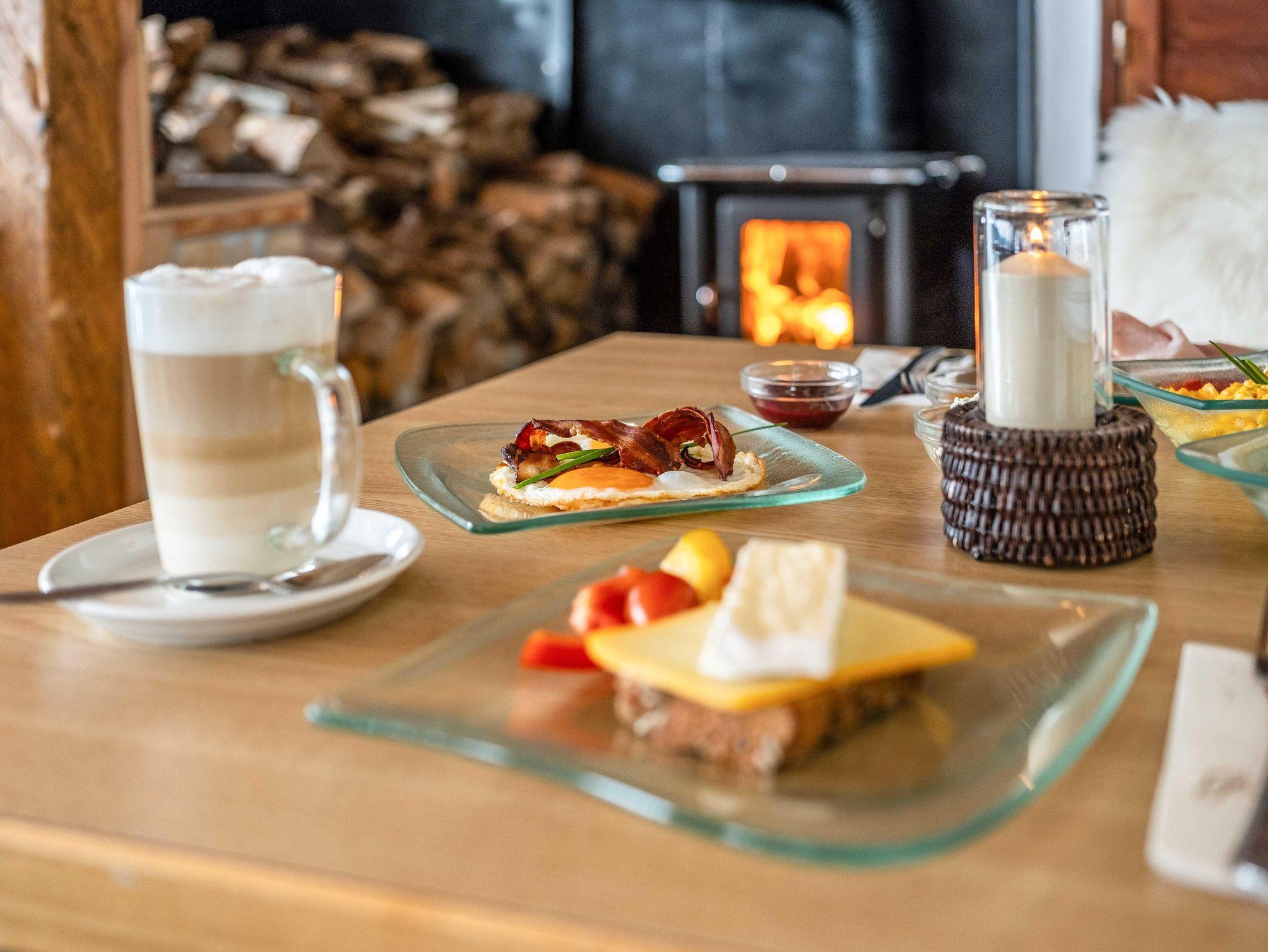 • 100% regionales Frühstückbuffet mit frischen, selbstgemachten und qualitativ hochwertigen Produkten auf der Panorama Terrasse Sommer wie Winter