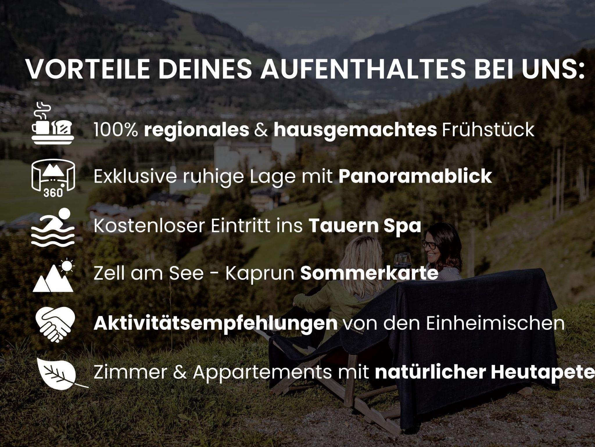 In dem familiär geführten Hotel Garni finden Aktivbegeisterte, Erholungssuchende und Familien mitten in der Natur ein gemütliches Urlaubszuhause: Durch die einzigartige Alleinlage oberhalb von Kaprun bieten sich traumhafte Panoramablicke über die Salzburger Bergwelt, sanfte Ruhe ist allgegenwärtig und der Verkehrslärm weit weg. Die natürliche Umgebung kommt auch im Haus selbst überall zur Geltung und verspricht Entspannung von Kopf bis Fuß.