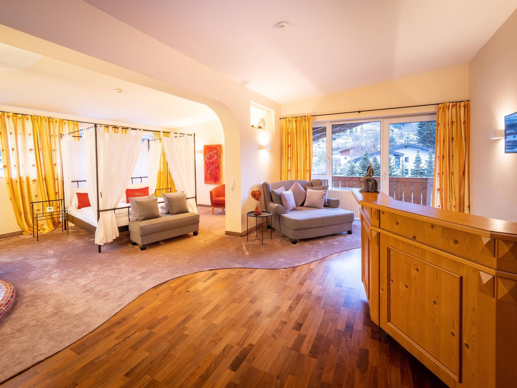 Wunderschöne Suite mit 40m² mit besonderen Akzenten für romantische Stunden zu Zweit. Selbstverständlich inklusive aller Verwöhnhotel Extras. Helle, großzügige Suite mit offenem Schlaf-, Wohn- und Badebereich, Dusche, getrenntem WC, Minibar, BALKON, gratis Wlan