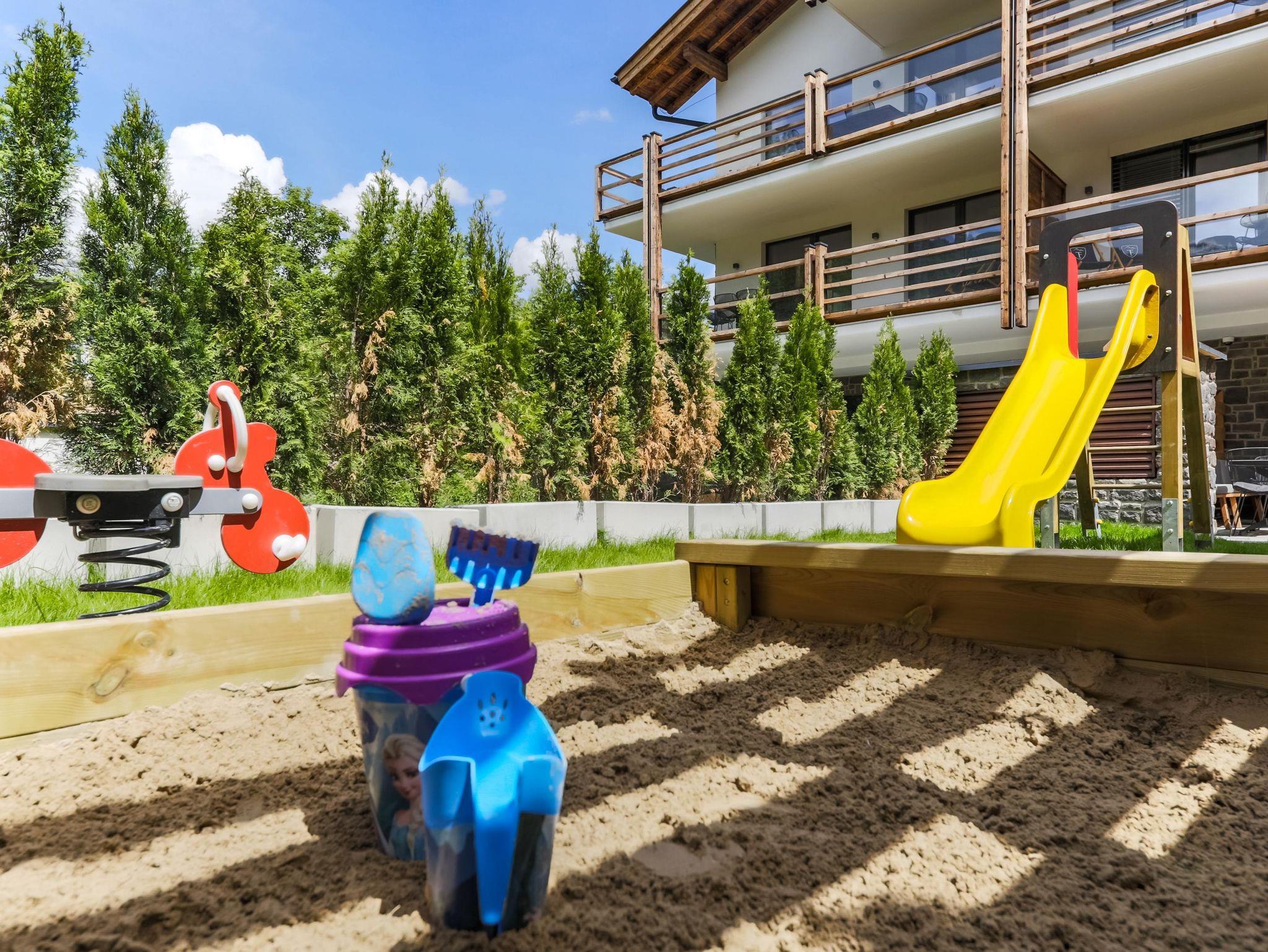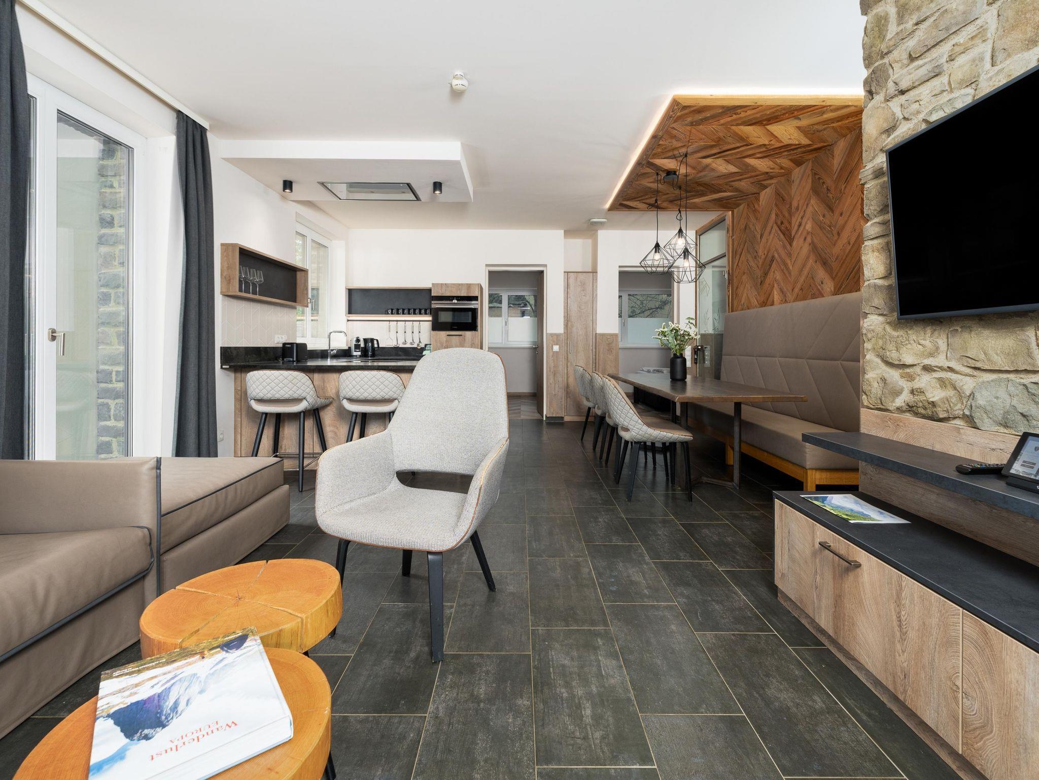 Unsere modern ausgestattete Suite besteht aus drei gemütlichen Schlafzimmern und drei Badezimmern mit Dusche und WC. Sie bietet genügend Platz für bis zu acht Personen. Der großzügige Wohnbereich verfügt über eine voll ausgestattete Küche, einen großen Esstisch und eine Schlafcouch. Die in der ganzen Suite verbauten Holzdetails lassen Sie den alpinen Lebensstil verspüren. Vom Wohnzimmer aus gelangen Sie direkt auf die private Terrasse, auf der Sie entspannen können.
