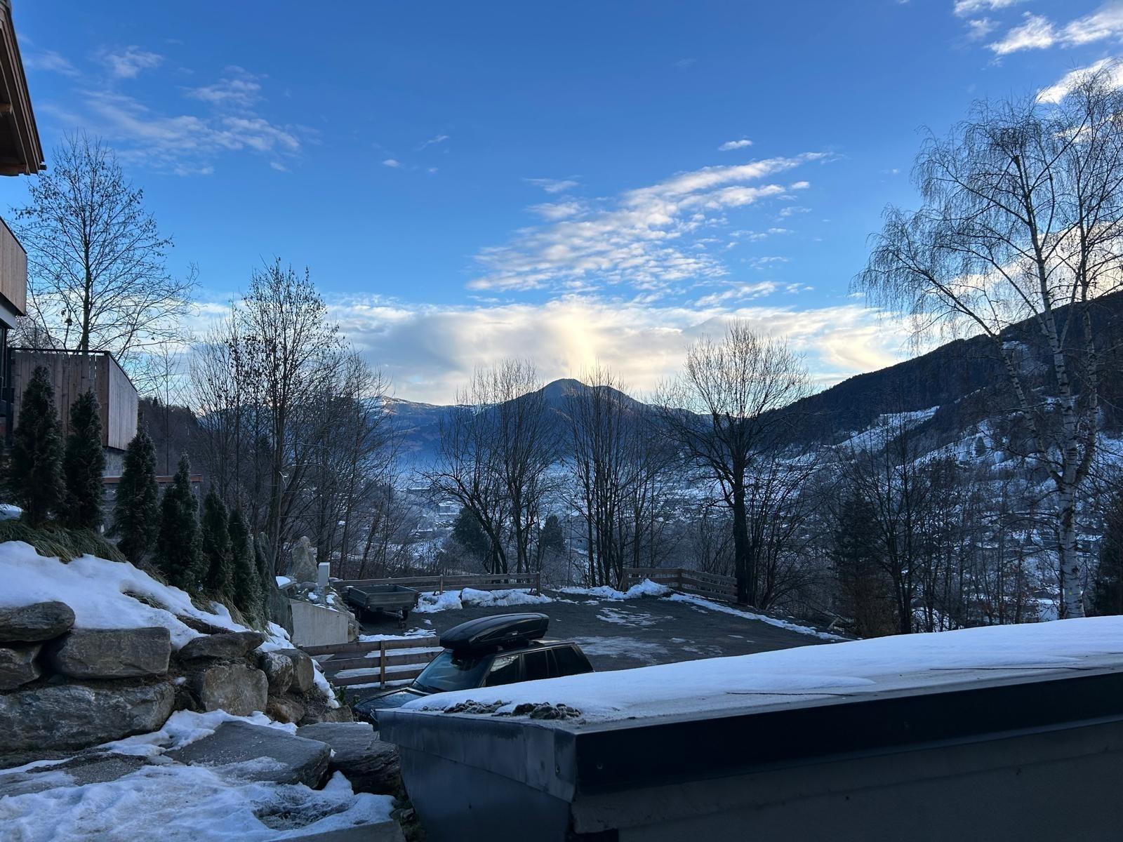 Genießen Sie eine 20 m² große Terrasse mit atemberaubendem Blick über Kaprun und den Kitzsteinhorn-Gletscher.