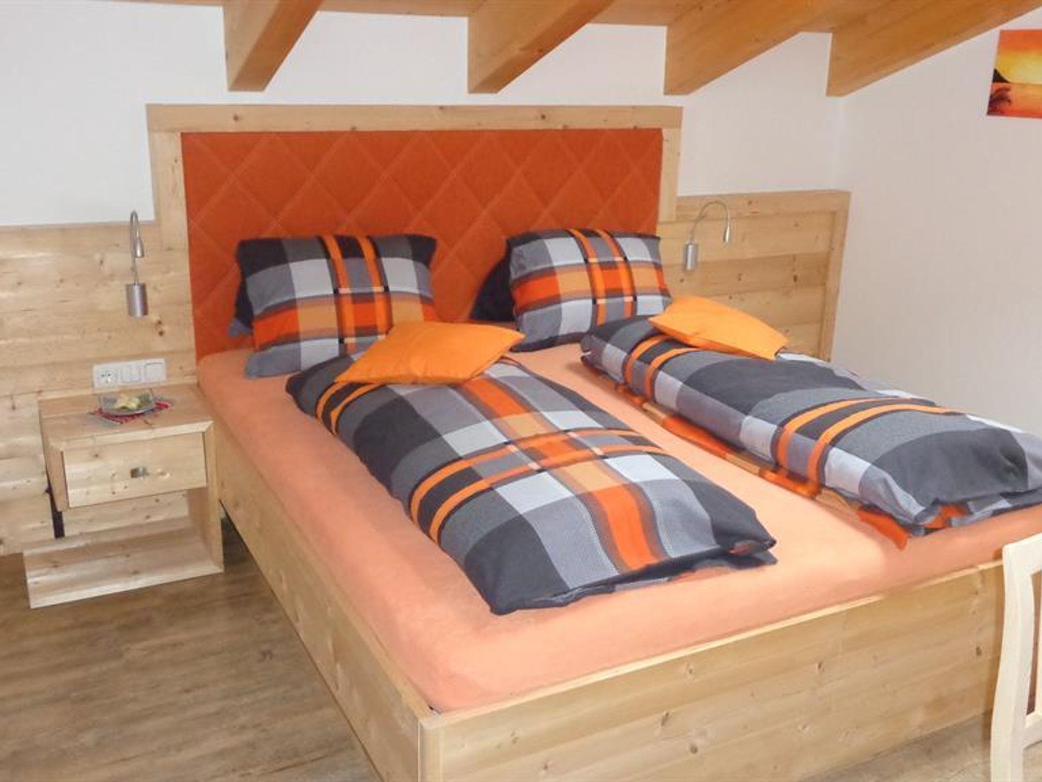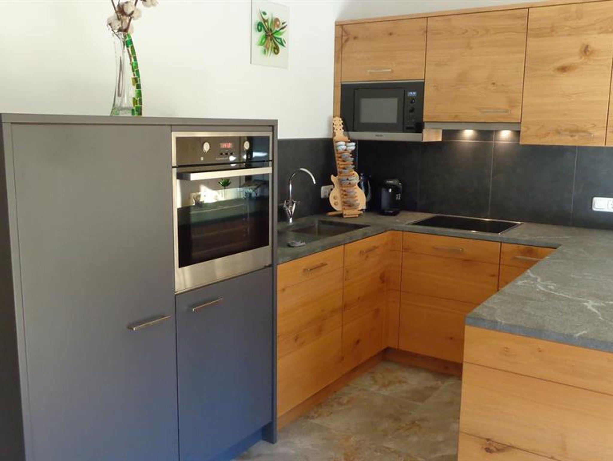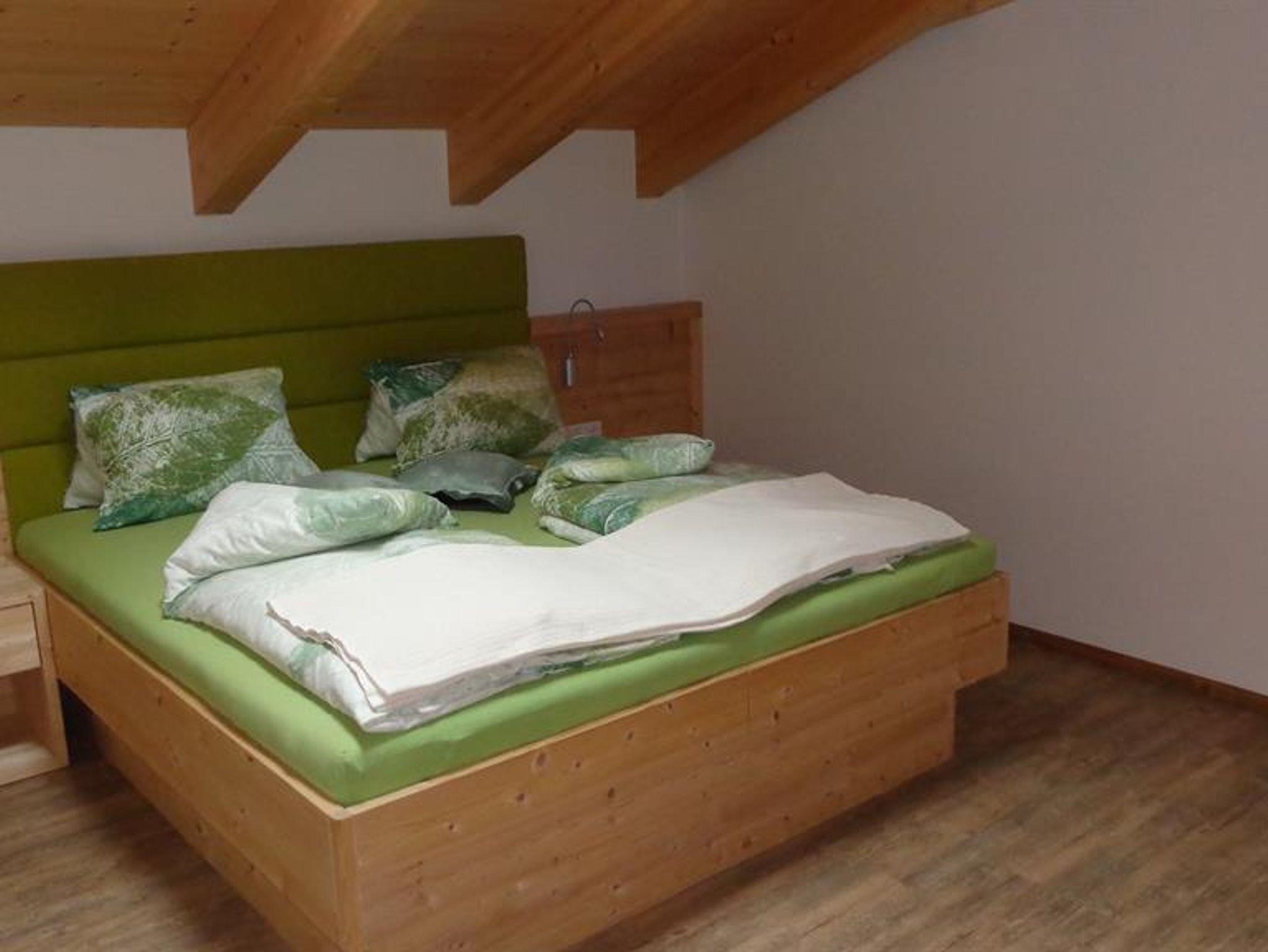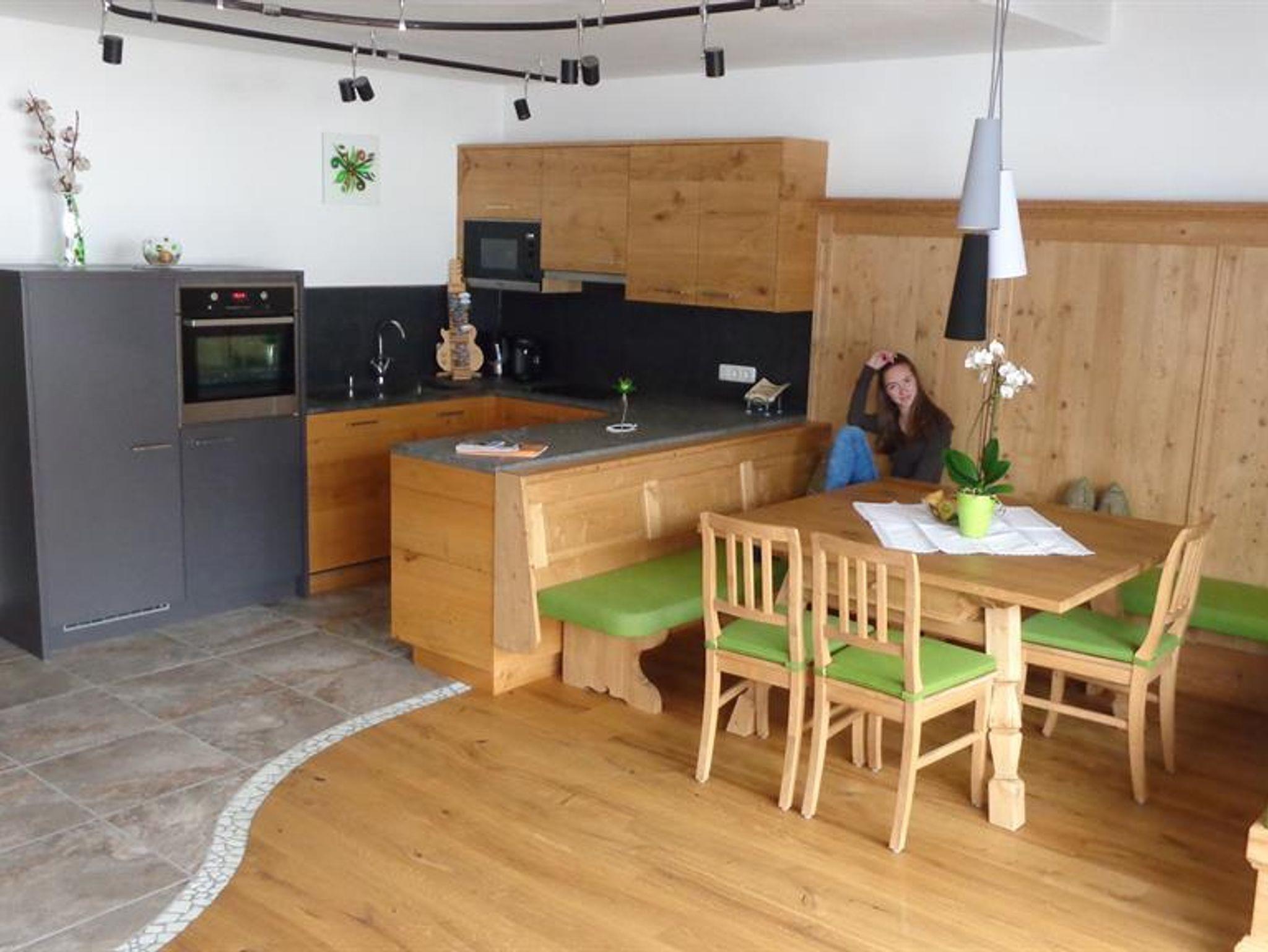 Die Wohnung liegt südöstlich, misst 130 m², hat 3 Altholz-Schlafzimmer mit Sat-TV, eine urige Wohnküche mit Stubencharakter, 3 Bäder, eines mit Whirlpool und Bidet, ein separates WC, ein offenes Wohnzimmer im oberen Stock und 2 große Balkone.