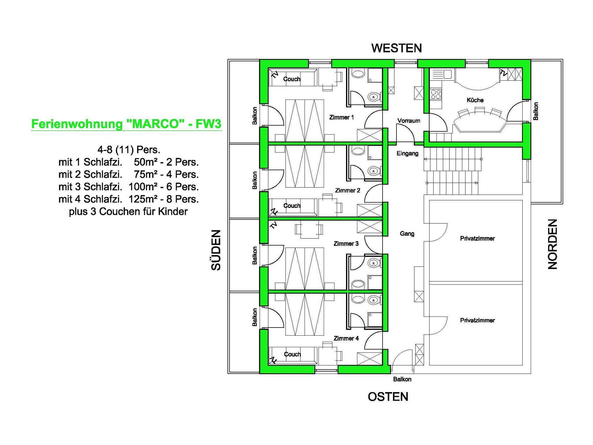 sehr gut ausgestattete, große Küche mit Nordbalkon; 4 Doppelzimmer je mit Doppelbett und 3x mit Zusatzbett, 4x Dusche/WC, alle Zi. mit Südbalkon; Vorraum; Frischmilch- und Brötchendienst!