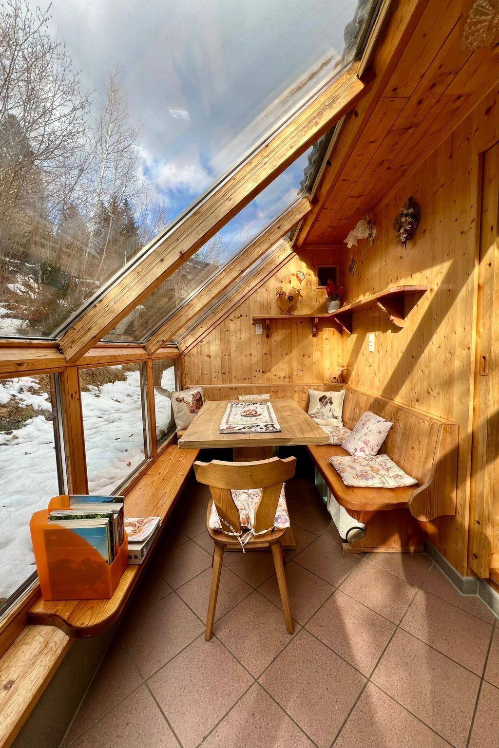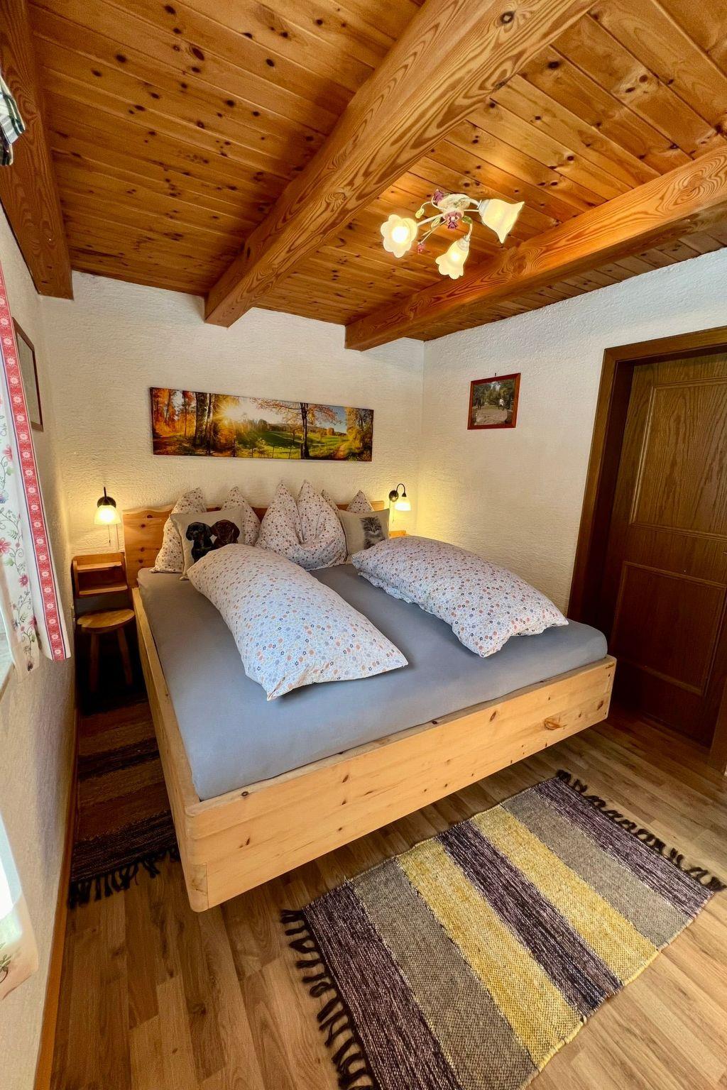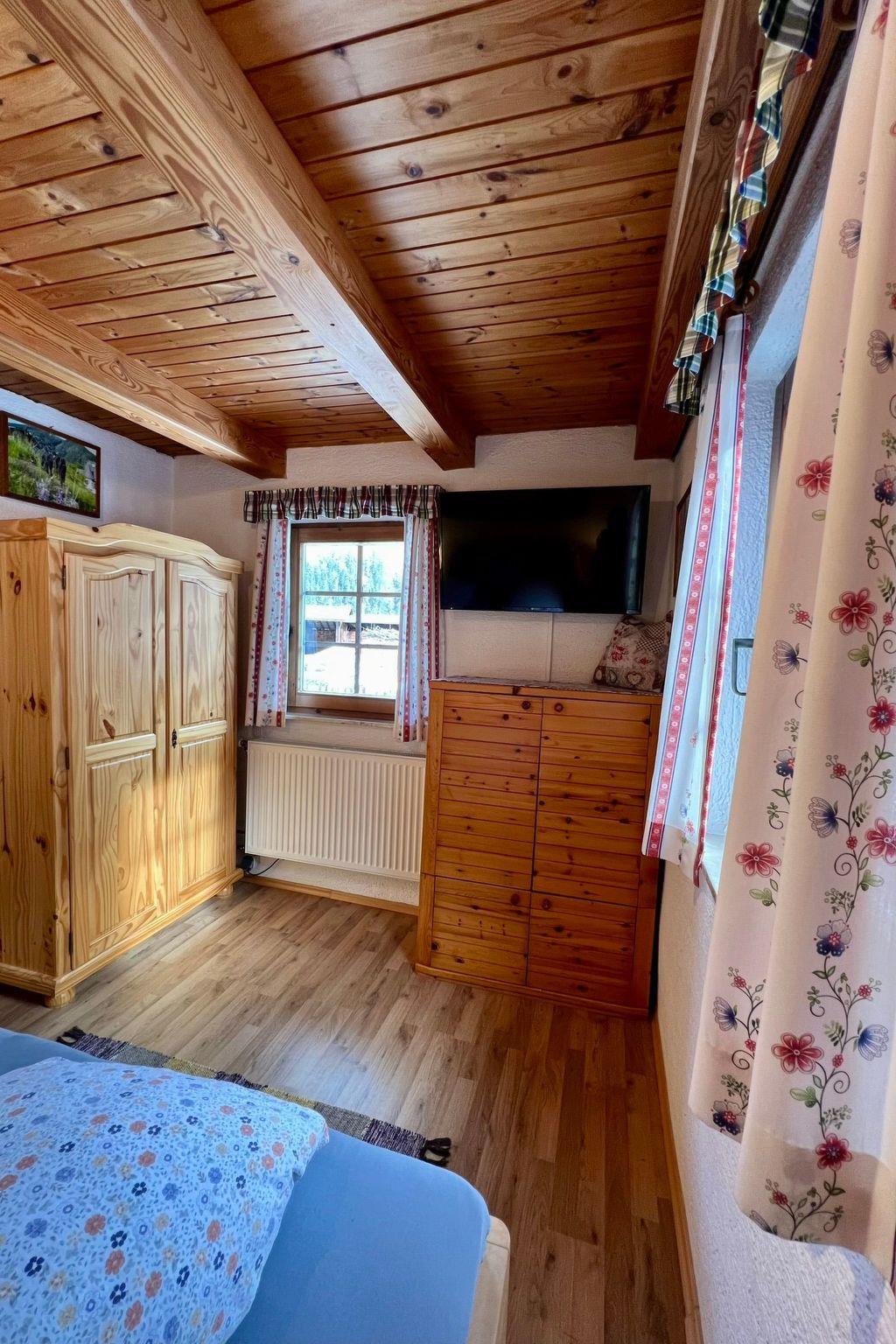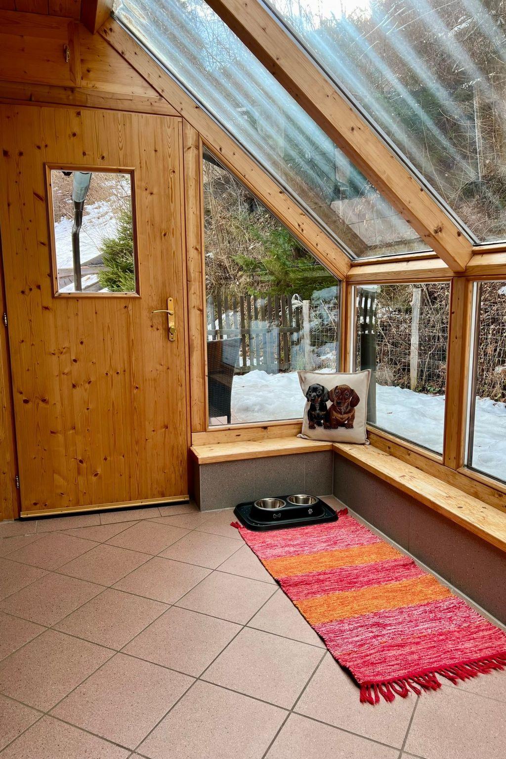 With its 80 m² of living space on two levels, the hut offers enough space for four people in 2 separate bedrooms. On the ground floor, you enter the cosy kitchen-cum-living room with dishwasher and coffee machine, electric cooker with oven, a tiled stove and a seating area for six people through a small entrance hall with cloakroom. Right next door is the bedroom with a cosy pine double bed (2.00 m x 1.80 m). In this room there is also a Samsung flat screen TV with satellite TV as well as a country-style wardrobe and a chest of drawers full of board games. From the kitchen/living room you can access the beautiful conservatory on the mountain side of the hut. In this bright space, a table and a bench made of light-coloured pine wood invite you to linger and relax. A staircase leads from the entrance area to the lower part of the house. The WC with underfloor heating, mirror, washbasin and boiler is immediately to the left. Next to it is the large barrier-free shower with underfloor heating. There is also a nice chest of drawers in the hallway with lots of interesting books for bookworms. Then you enter the large twin bedroom or "star room", furnished with a four-poster bed (2.00 m x 2.00 m), bedside cabinet, country-style wardrobe, Bluetooth radio, Samsung flat-screen TV with satellite TV and a washbasin with mirror and hairdryer. There are therefore two flat screen televisions in the holiday home. The entire cottage is heated by central and solar heating, as well as a cosy and very efficient tiled stove. WLAN is available free of charge in all rooms.