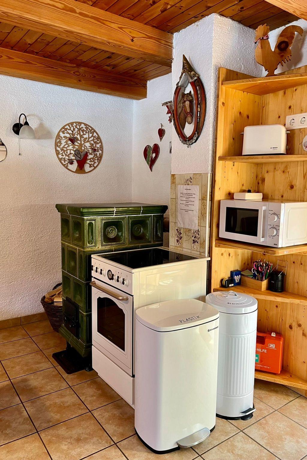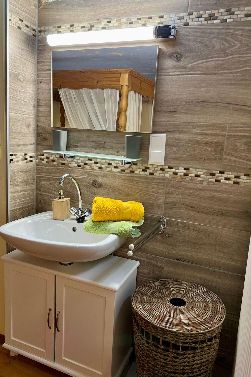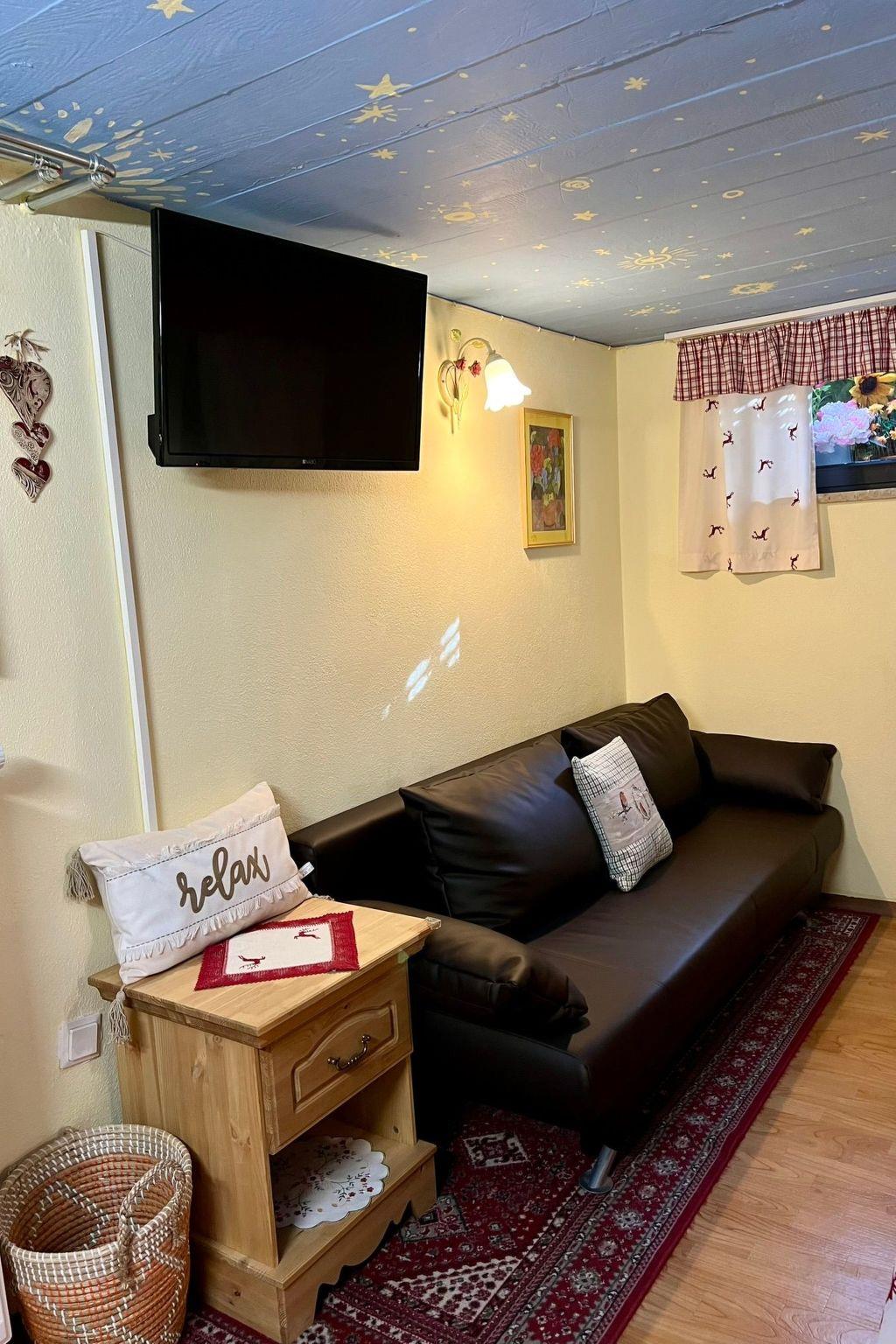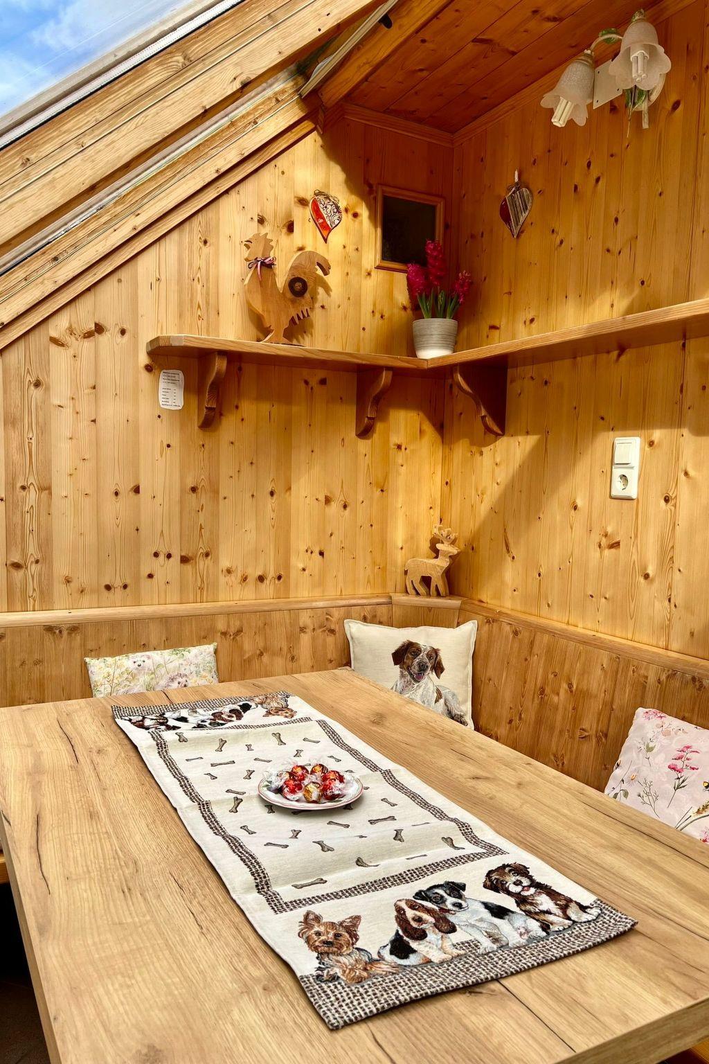 With its 80 m² of living space on two levels, the hut offers enough space for four people in 2 separate bedrooms. On the ground floor, you enter the cosy kitchen-cum-living room with dishwasher and coffee machine, electric cooker with oven, a tiled stove and a seating area for six people through a small entrance hall with cloakroom. Right next door is the bedroom with a cosy pine double bed (2.00 m x 1.80 m). In this room there is also a Samsung flat screen TV with satellite TV as well as a country-style wardrobe and a chest of drawers full of board games. From the kitchen/living room you can access the beautiful conservatory on the mountain side of the hut. In this bright space, a table and a bench made of light-coloured pine wood invite you to linger and relax. A staircase leads from the entrance area to the lower part of the house. The WC with underfloor heating, mirror, washbasin and boiler is immediately to the left. Next to it is the large barrier-free shower with underfloor heating. There is also a nice chest of drawers in the hallway with lots of interesting books for bookworms. Then you enter the large twin bedroom or "star room", furnished with a four-poster bed (2.00 m x 2.00 m), bedside cabinet, country-style wardrobe, Bluetooth radio, Samsung flat-screen TV with satellite TV and a washbasin with mirror and hairdryer. There are therefore two flat screen televisions in the holiday home. The entire cottage is heated by central and solar heating, as well as a cosy and very efficient tiled stove. WLAN is available free of charge in all rooms.
