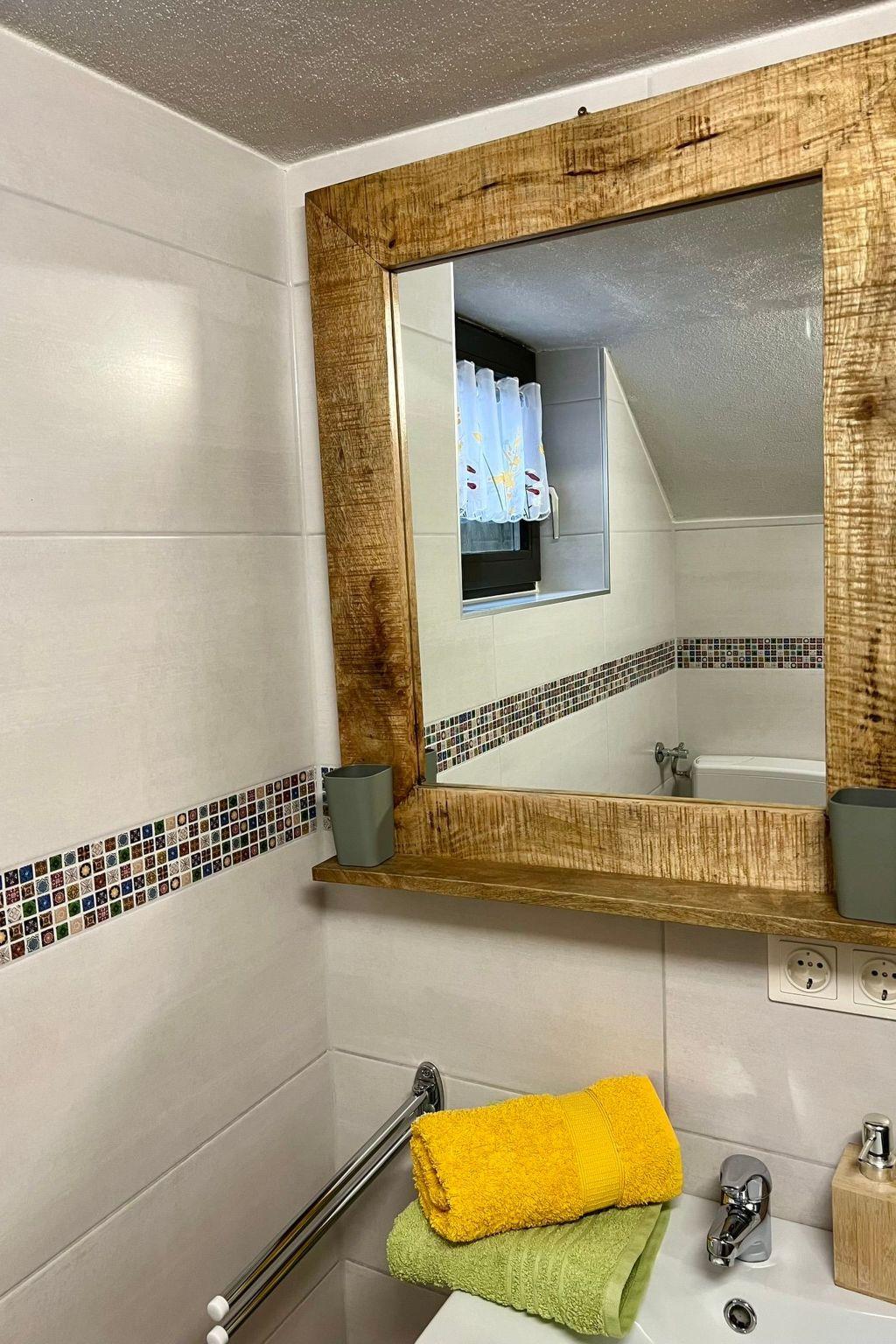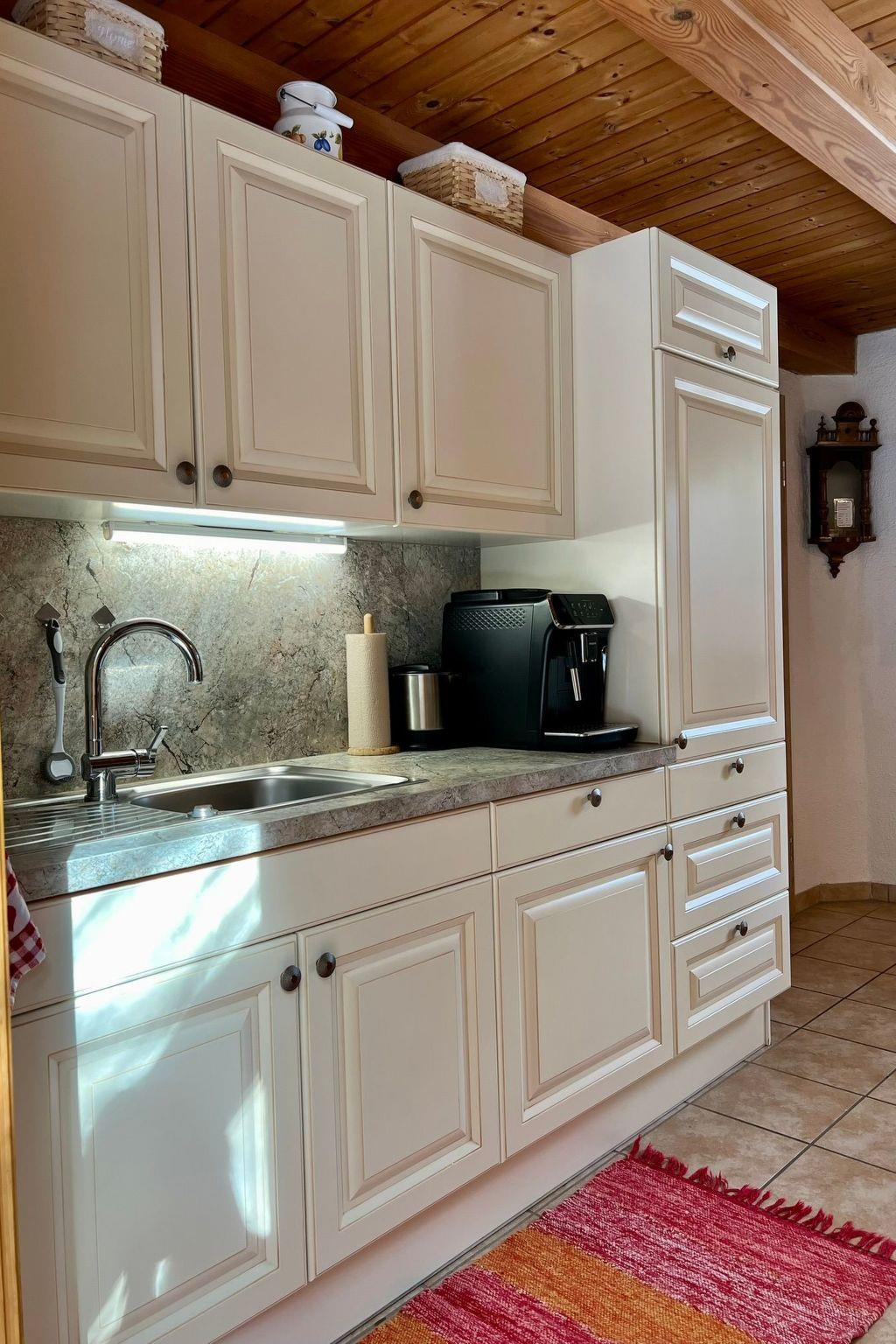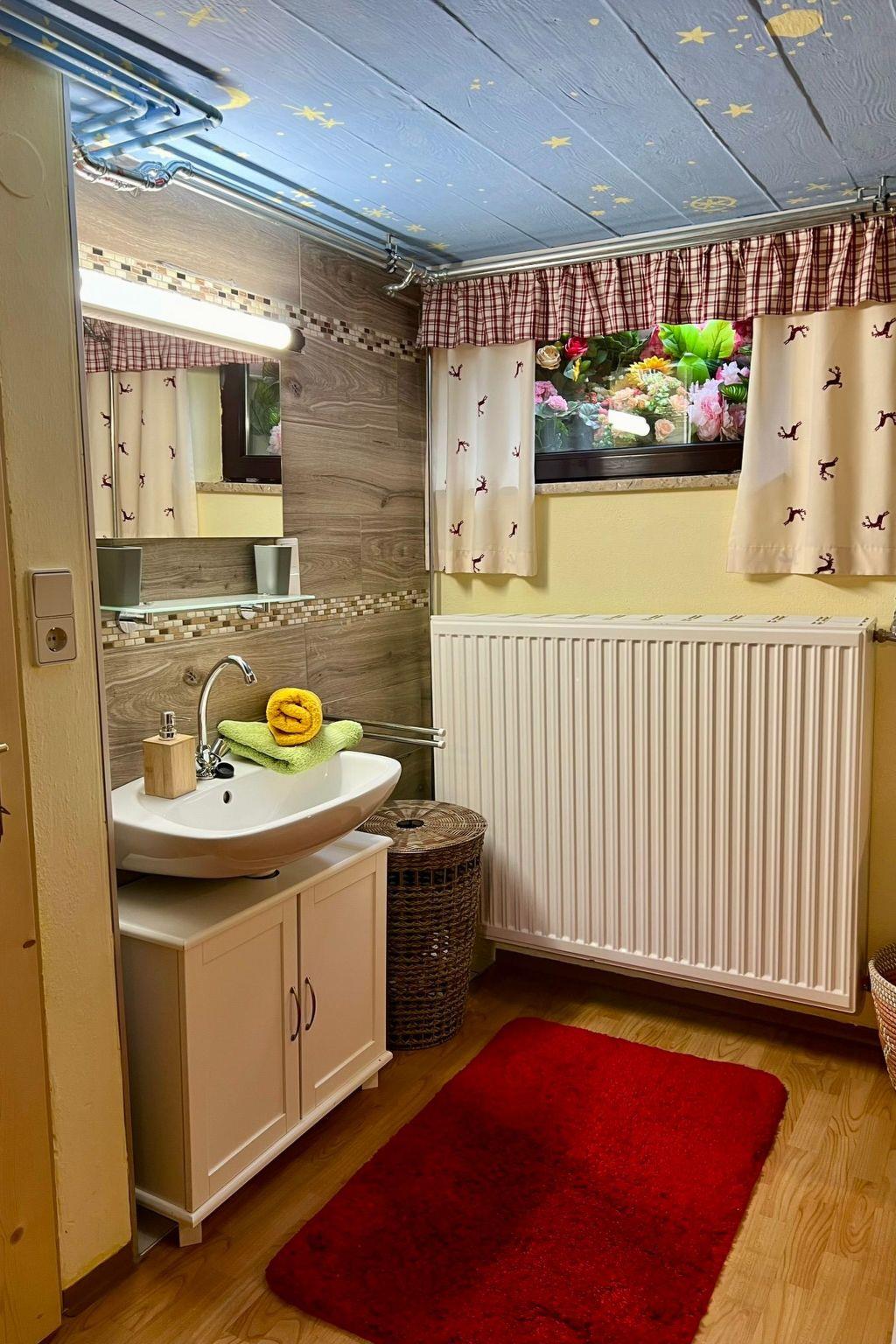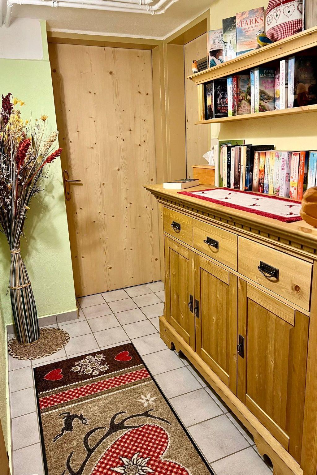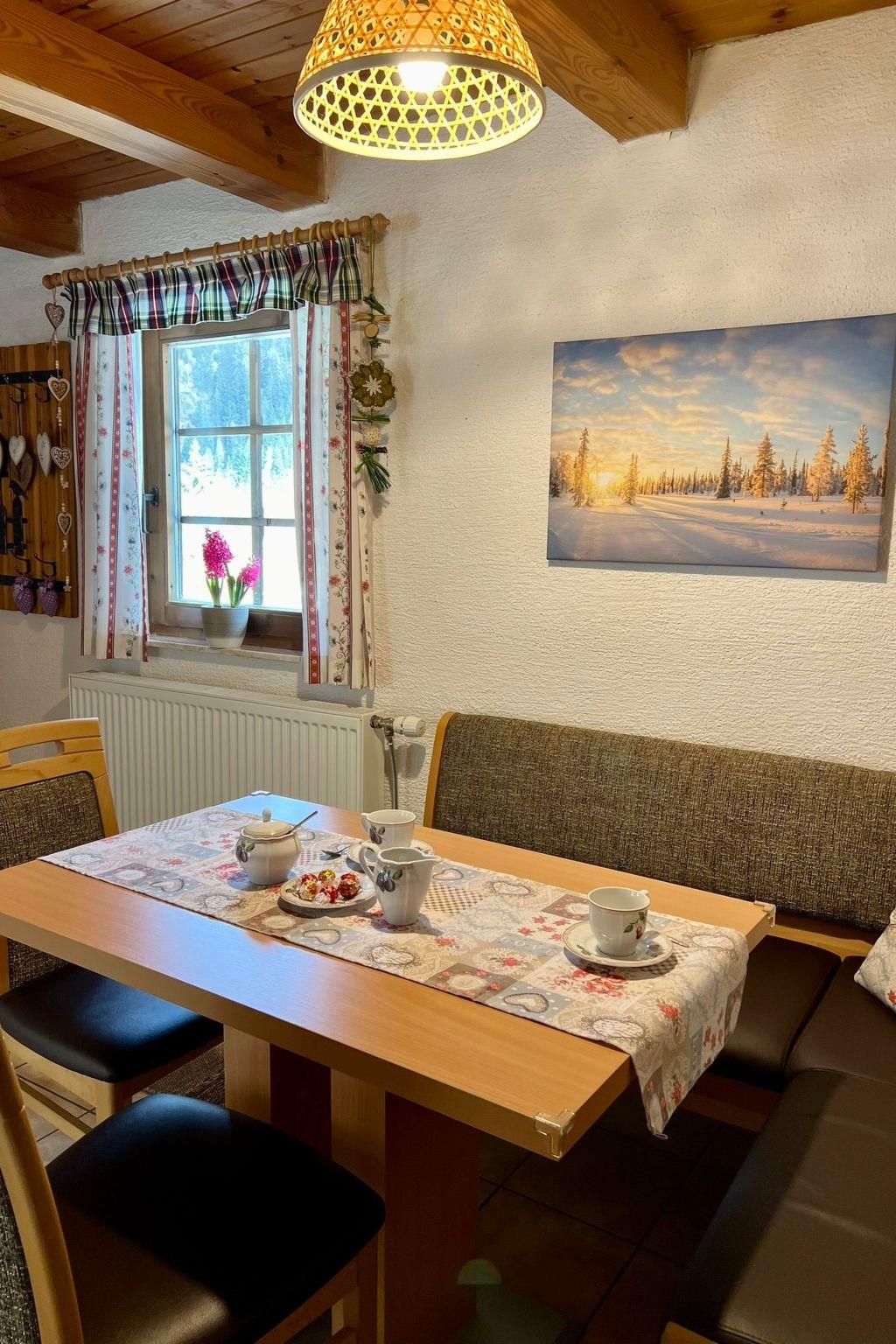 With its 80 m² of living space on two levels, the hut offers enough space for four people in 2 separate bedrooms. On the ground floor, you enter the cosy kitchen-cum-living room with dishwasher and coffee machine, electric cooker with oven, a tiled stove and a seating area for six people through a small entrance hall with cloakroom. Right next door is the bedroom with a cosy pine double bed (2.00 m x 1.80 m). In this room there is also a Samsung flat screen TV with satellite TV as well as a country-style wardrobe and a chest of drawers full of board games. From the kitchen/living room you can access the beautiful conservatory on the mountain side of the hut. In this bright space, a table and a bench made of light-coloured pine wood invite you to linger and relax. A staircase leads from the entrance area to the lower part of the house. The WC with underfloor heating, mirror, washbasin and boiler is immediately to the left. Next to it is the large barrier-free shower with underfloor heating. There is also a nice chest of drawers in the hallway with lots of interesting books for bookworms. Then you enter the large twin bedroom or "star room", furnished with a four-poster bed (2.00 m x 2.00 m), bedside cabinet, country-style wardrobe, Bluetooth radio, Samsung flat-screen TV with satellite TV and a washbasin with mirror and hairdryer. There are therefore two flat screen televisions in the holiday home. The entire cottage is heated by central and solar heating, as well as a cosy and very efficient tiled stove. WLAN is available free of charge in all rooms.