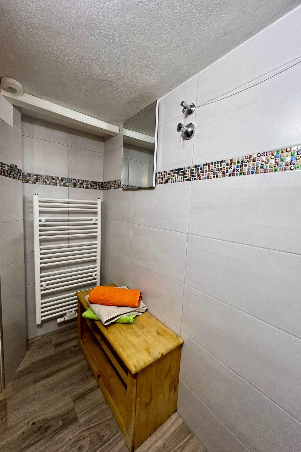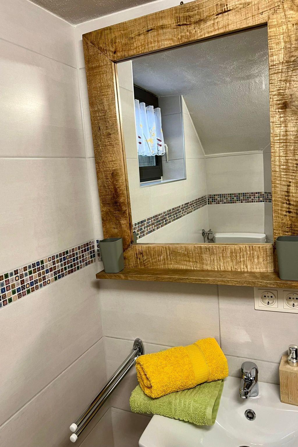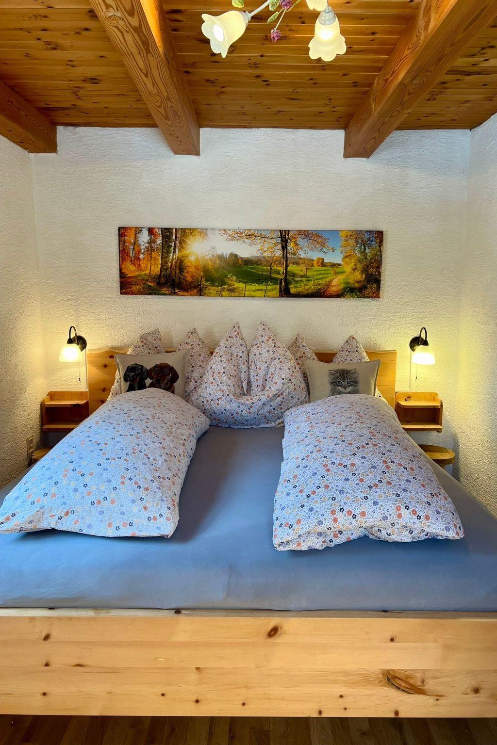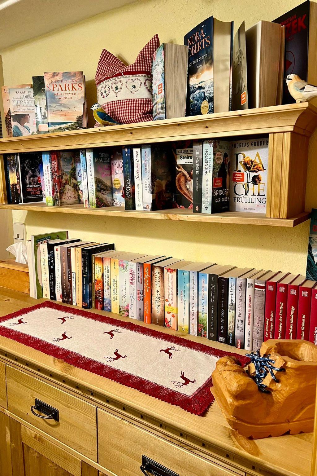 With its 80 m² of living space on two levels, the hut offers enough space for four people in 2 separate bedrooms. On the ground floor, you enter the cosy kitchen-cum-living room with dishwasher and coffee machine, electric cooker with oven, a tiled stove and a seating area for six people through a small entrance hall with cloakroom. Right next door is the bedroom with a cosy pine double bed (2.00 m x 1.80 m). In this room there is also a Samsung flat screen TV with satellite TV as well as a country-style wardrobe and a chest of drawers full of board games. From the kitchen/living room you can access the beautiful conservatory on the mountain side of the hut. In this bright space, a table and a bench made of light-coloured pine wood invite you to linger and relax. A staircase leads from the entrance area to the lower part of the house. The WC with underfloor heating, mirror, washbasin and boiler is immediately to the left. Next to it is the large barrier-free shower with underfloor heating. There is also a nice chest of drawers in the hallway with lots of interesting books for bookworms. Then you enter the large twin bedroom or "star room", furnished with a four-poster bed (2.00 m x 2.00 m), bedside cabinet, country-style wardrobe, Bluetooth radio, Samsung flat-screen TV with satellite TV and a washbasin with mirror and hairdryer. There are therefore two flat screen televisions in the holiday home. The entire cottage is heated by central and solar heating, as well as a cosy and very efficient tiled stove. WLAN is available free of charge in all rooms.