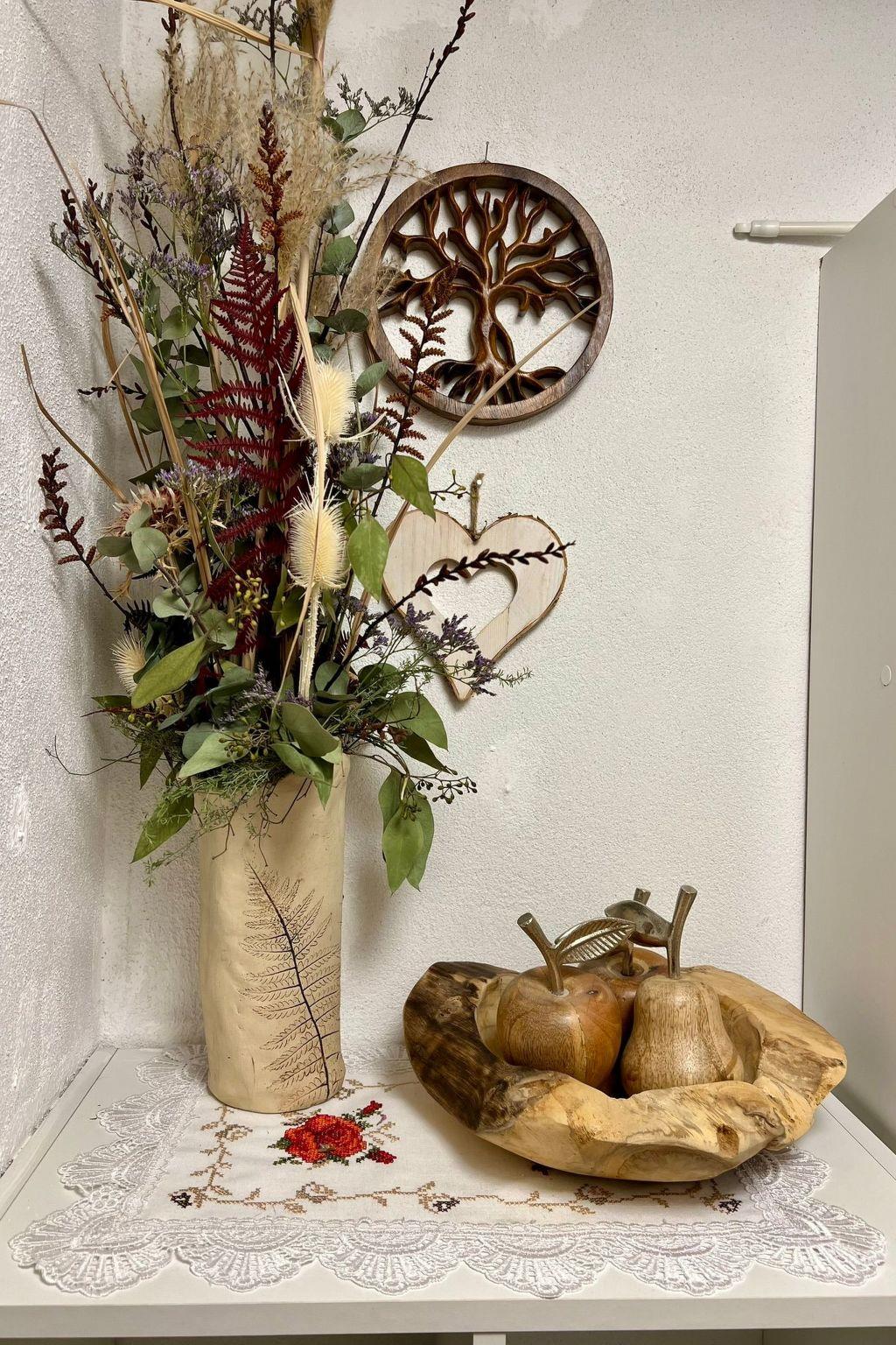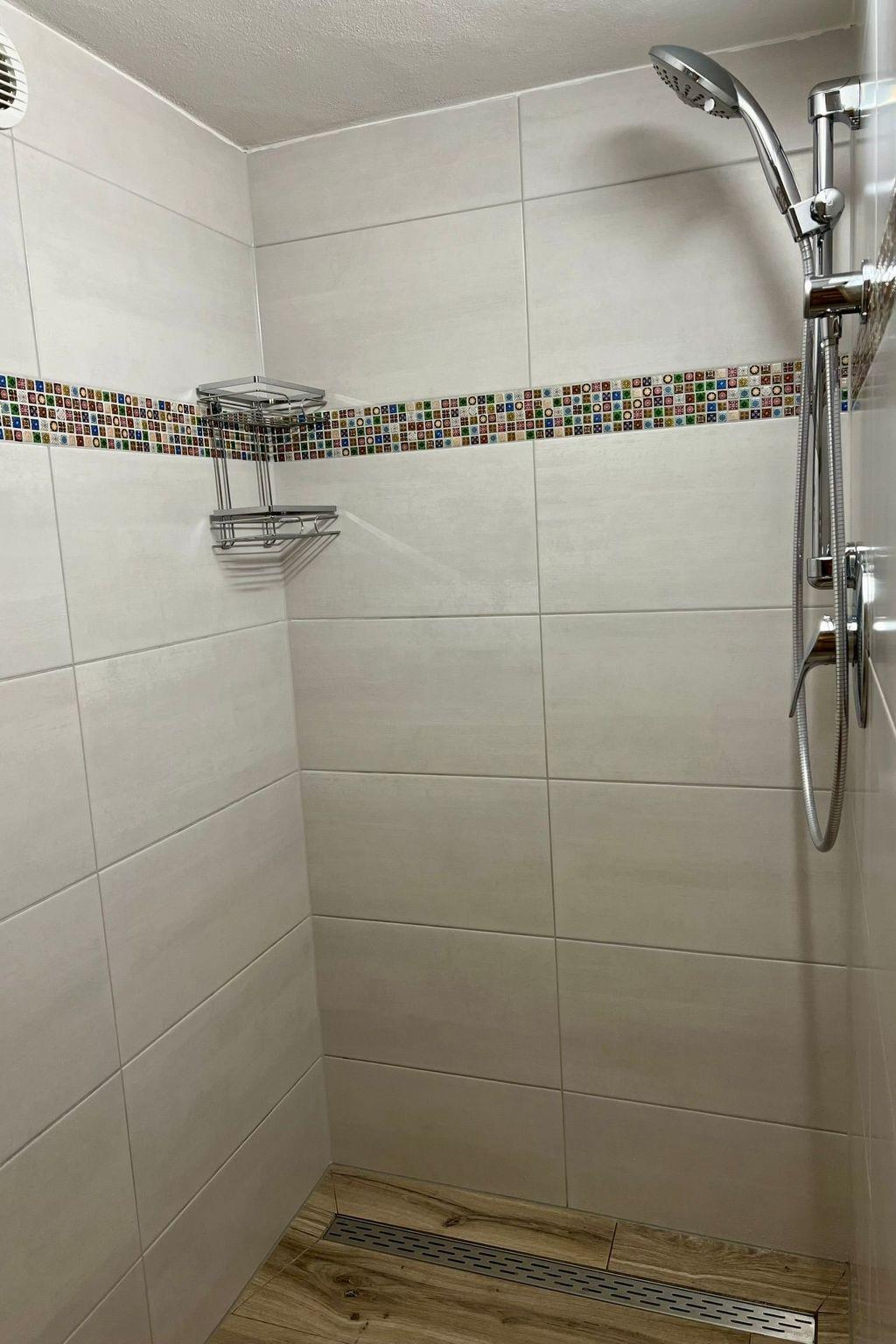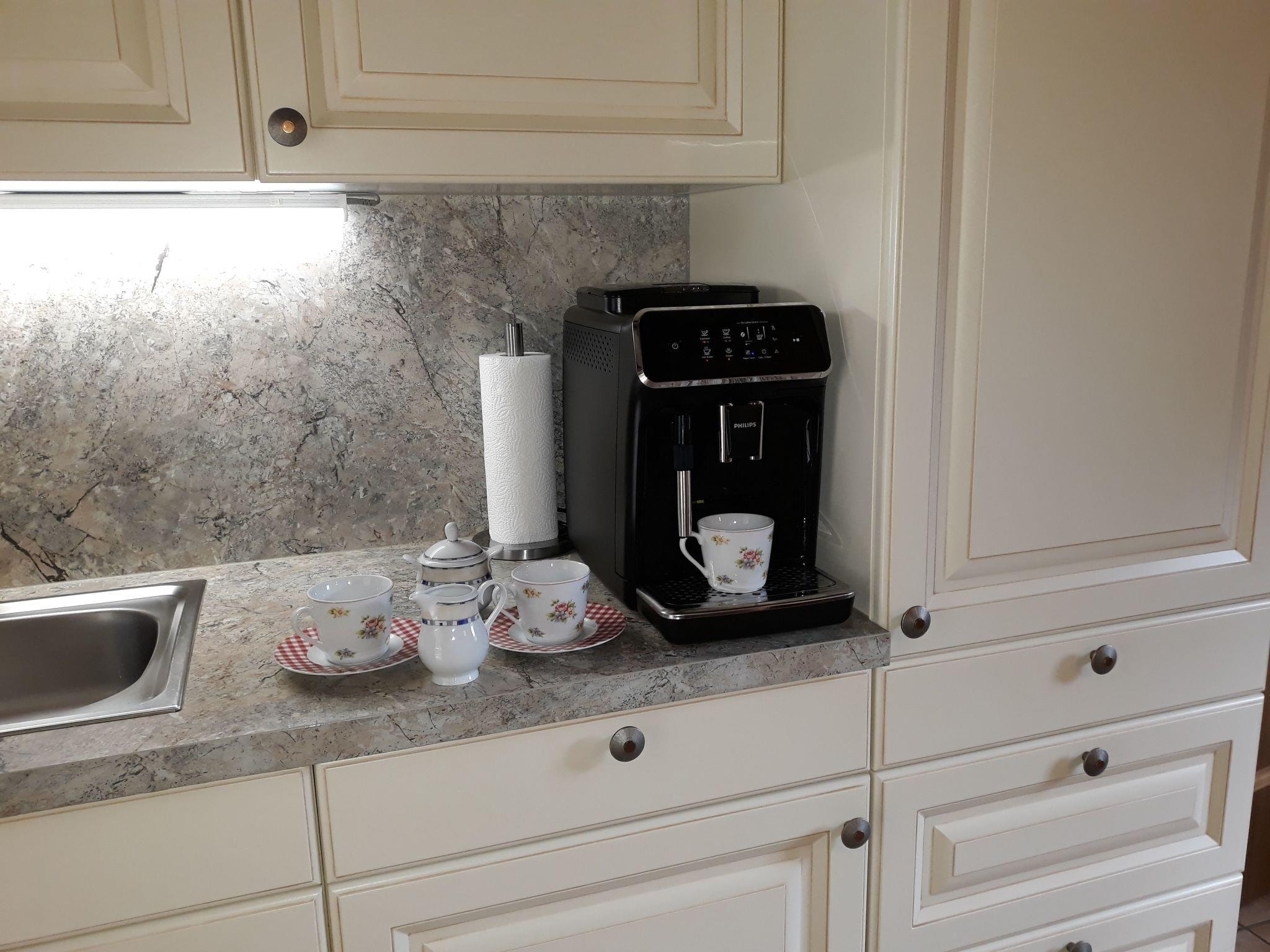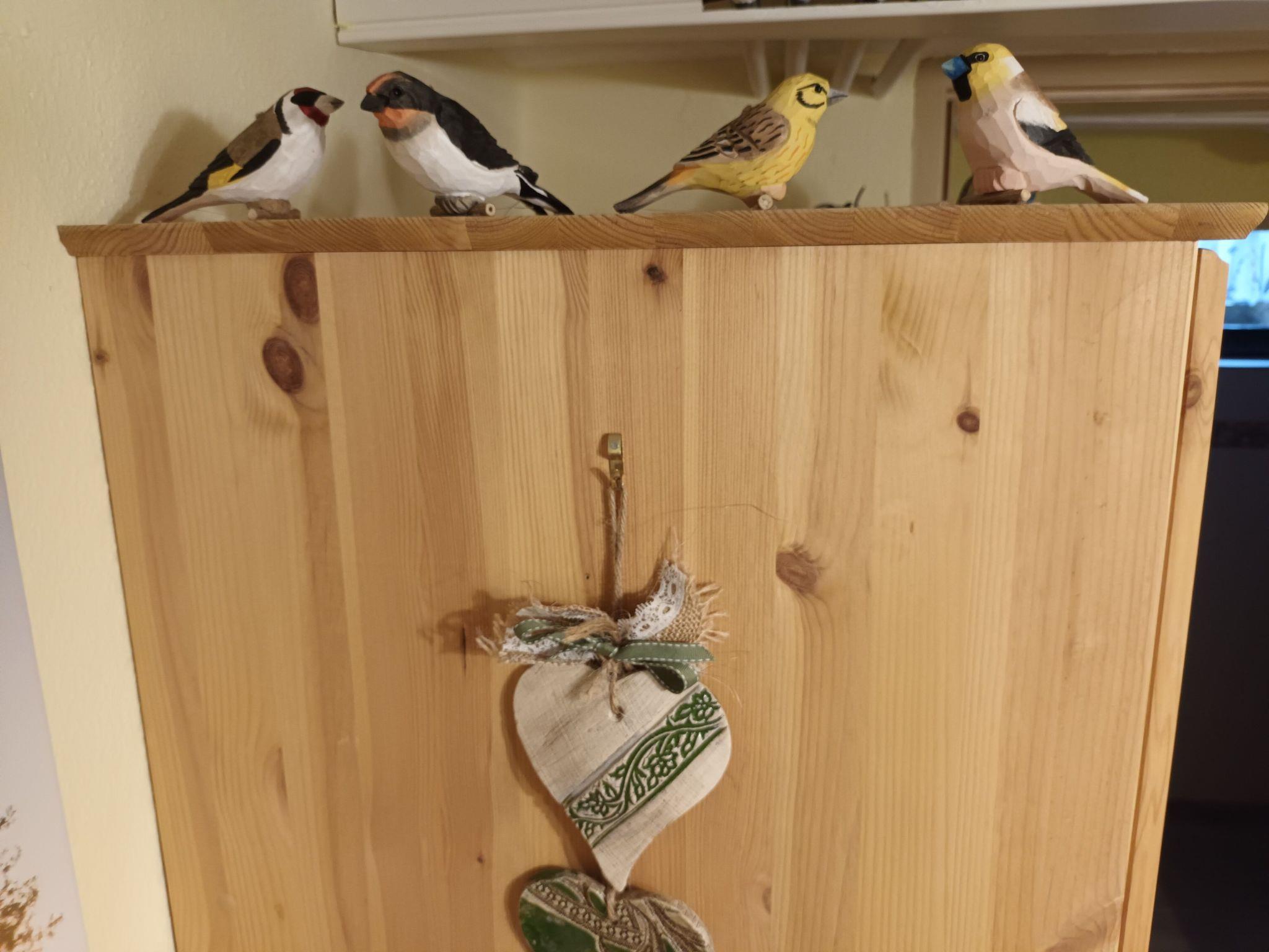 With its 80 m² of living space on two levels, the hut offers enough space for four people in 2 separate bedrooms. On the ground floor, you enter the cosy kitchen-cum-living room with dishwasher and coffee machine, electric cooker with oven, a tiled stove and a seating area for six people through a small entrance hall with cloakroom. Right next door is the bedroom with a cosy pine double bed (2.00 m x 1.80 m). In this room there is also a Samsung flat screen TV with satellite TV as well as a country-style wardrobe and a chest of drawers full of board games. From the kitchen/living room you can access the beautiful conservatory on the mountain side of the hut. In this bright space, a table and a bench made of light-coloured pine wood invite you to linger and relax. A staircase leads from the entrance area to the lower part of the house. The WC with underfloor heating, mirror, washbasin and boiler is immediately to the left. Next to it is the large barrier-free shower with underfloor heating. There is also a nice chest of drawers in the hallway with lots of interesting books for bookworms. Then you enter the large twin bedroom or "star room", furnished with a four-poster bed (2.00 m x 2.00 m), bedside cabinet, country-style wardrobe, Bluetooth radio, Samsung flat-screen TV with satellite TV and a washbasin with mirror and hairdryer. There are therefore two flat screen televisions in the holiday home. The entire cottage is heated by central and solar heating, as well as a cosy and very efficient tiled stove. WLAN is available free of charge in all rooms.