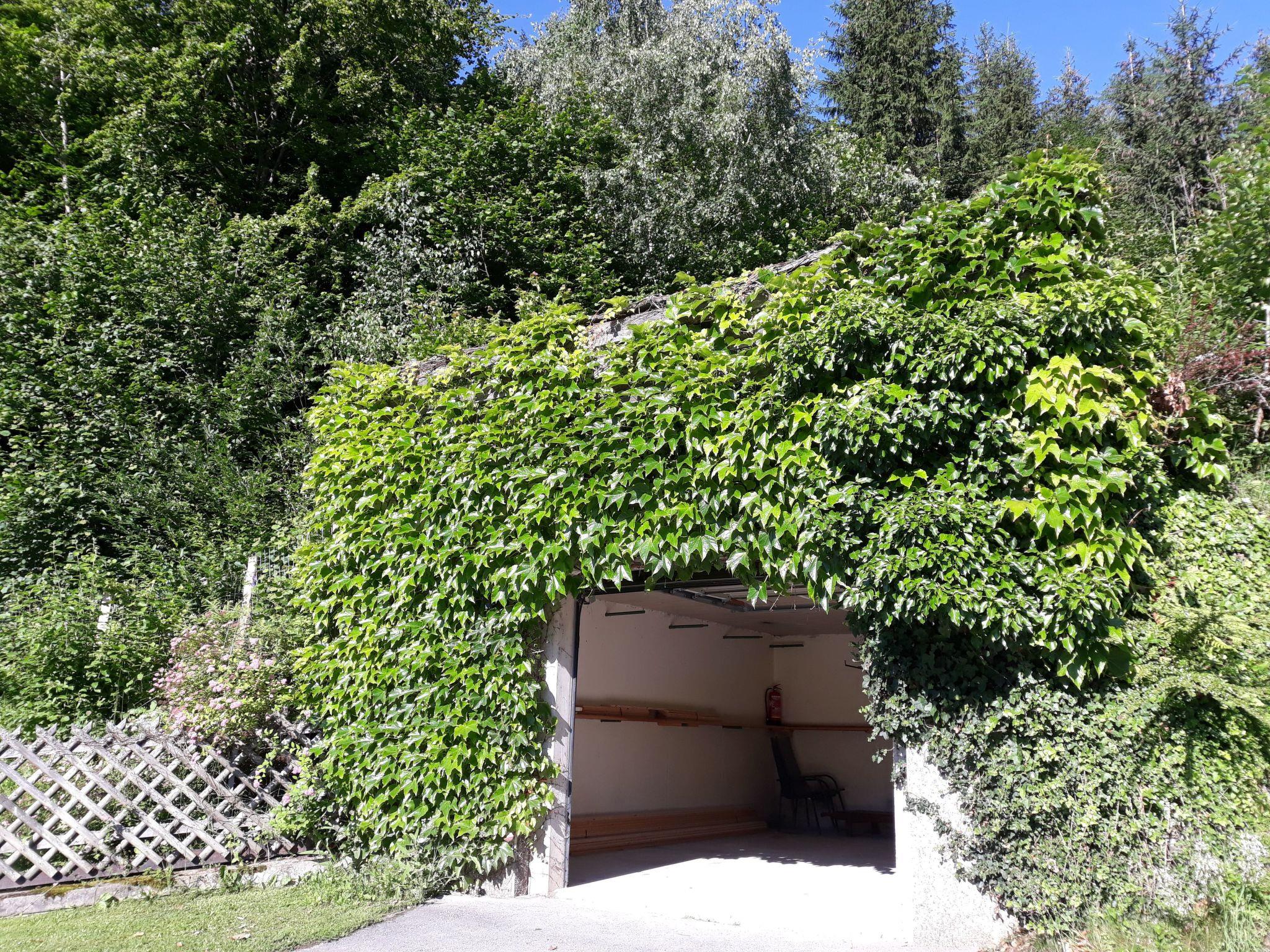 From the conservatory, a door leads outside onto the terrace with wooden furniture and you are already in the fenced garden that surrounds three sides of the hut. Ideal for families with small children and dog owners. On the right-hand side of the hut is the wooden hut where the firewood is available for free use. Next to it, built into the slope, is the spacious garage with room for a car. The rubbish collection area is also located there. There is enough space in front of the garage for one or two more cars. Wooden benches around the hut invite you to linger and rustic wooden deckchairs make you want to take a midday nap. And on beautiful summer evenings, the charcoal barbecue is of course used and you can enjoy a barbecue in the midst of nature.