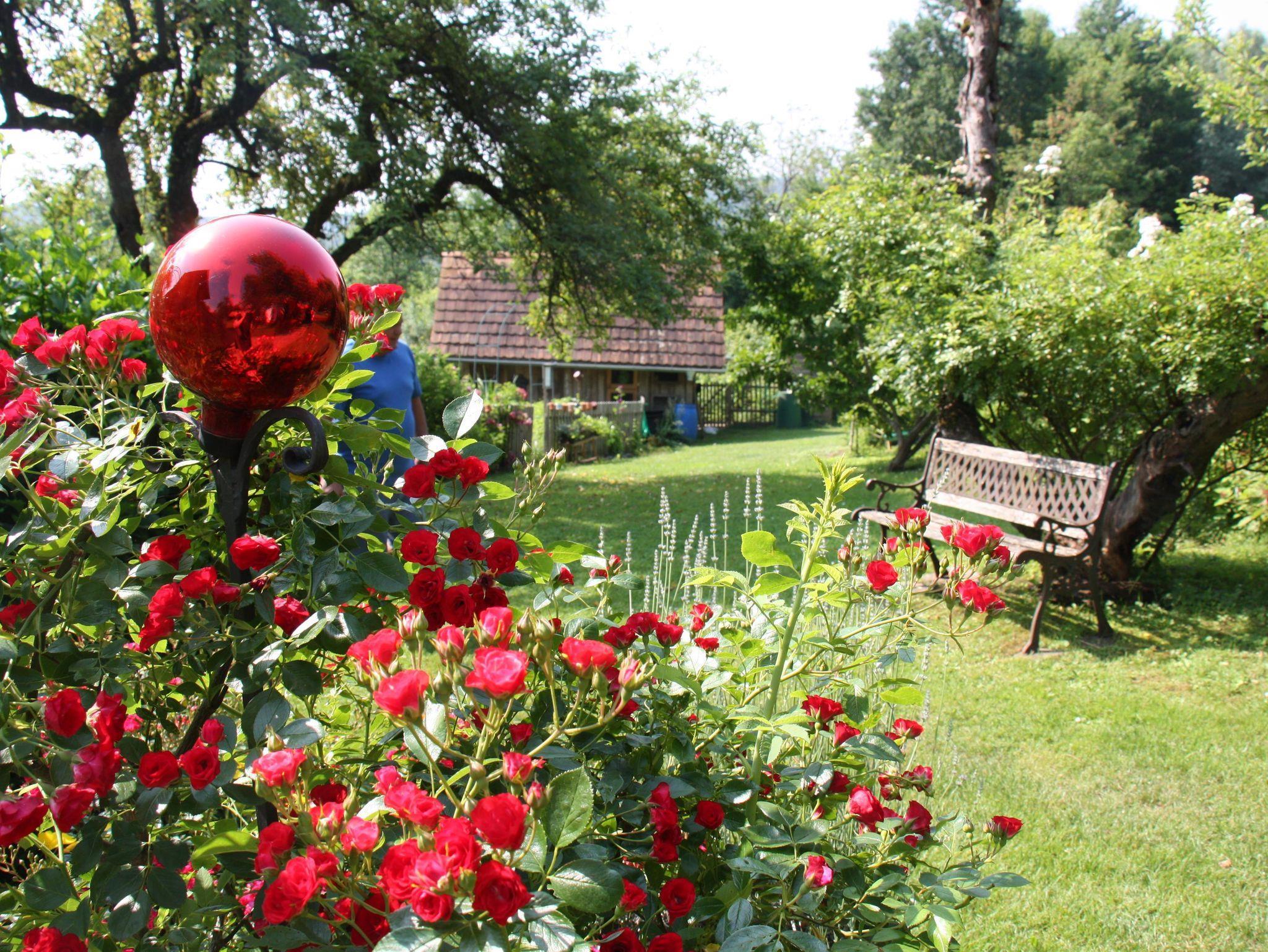 In unserem großen Naturgarten blühen unzählige Blumen wie Rosen und Sträucher, die dazu einladen, durch das grüne Paradies zu schlendern und die Seele baumeln zu lassen. Viele Sonnen- und Schattenplätze genießen Sie im Liegestuhl oder in der Hängematte.