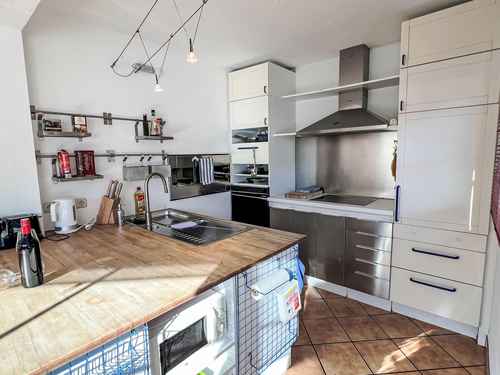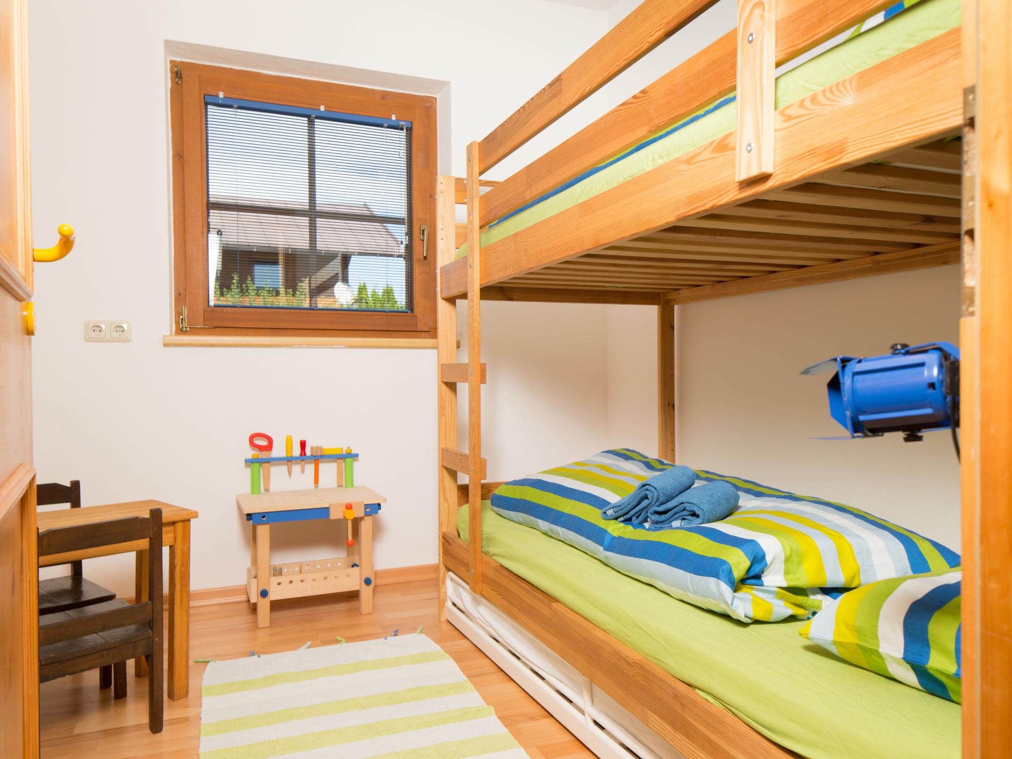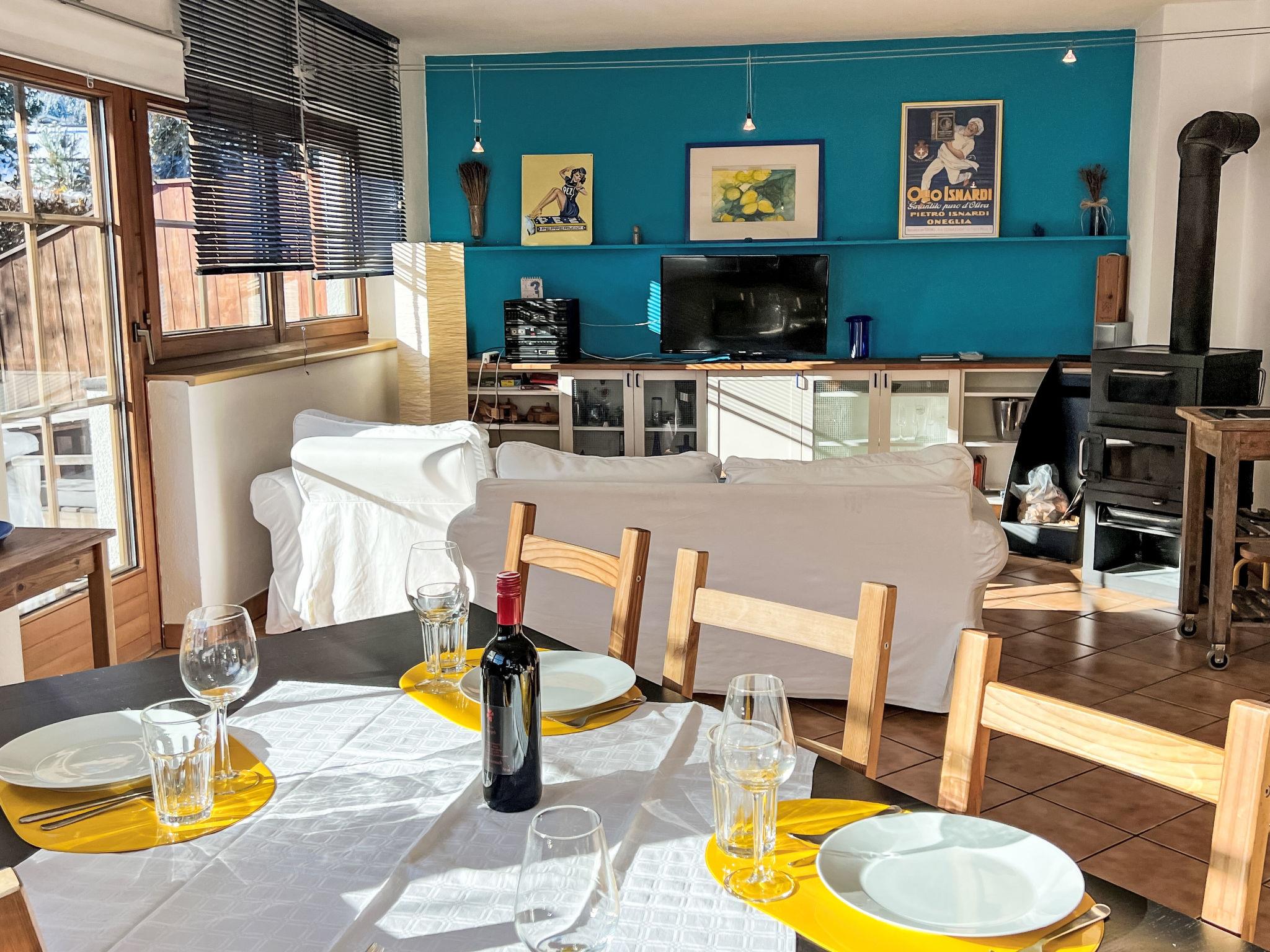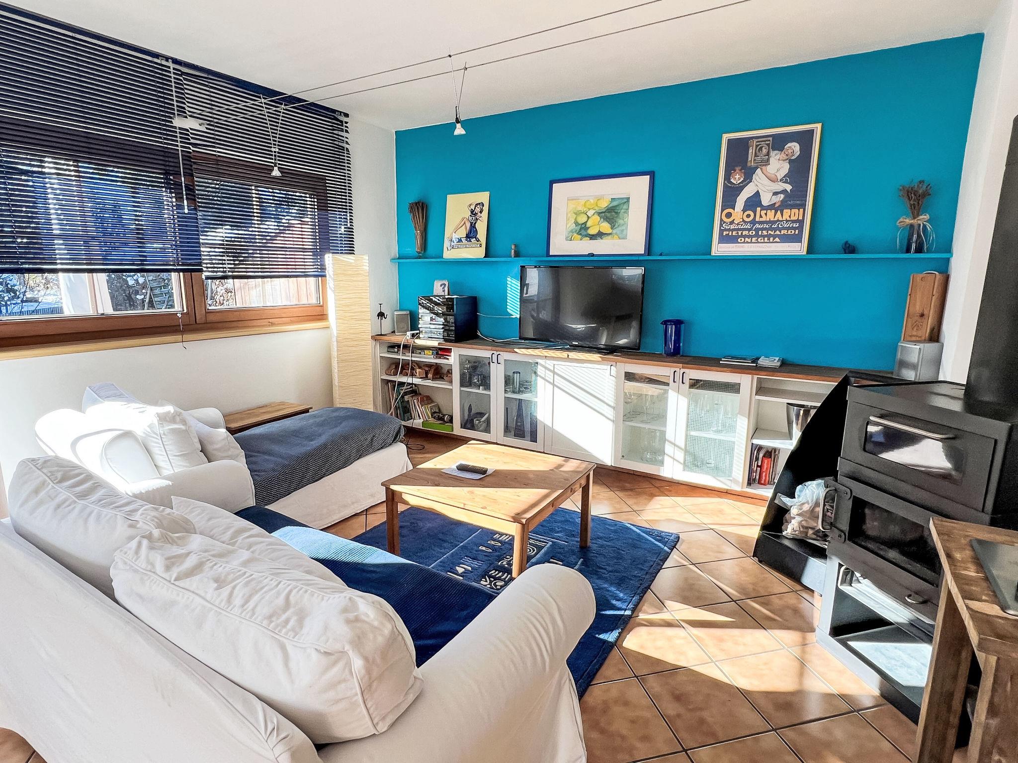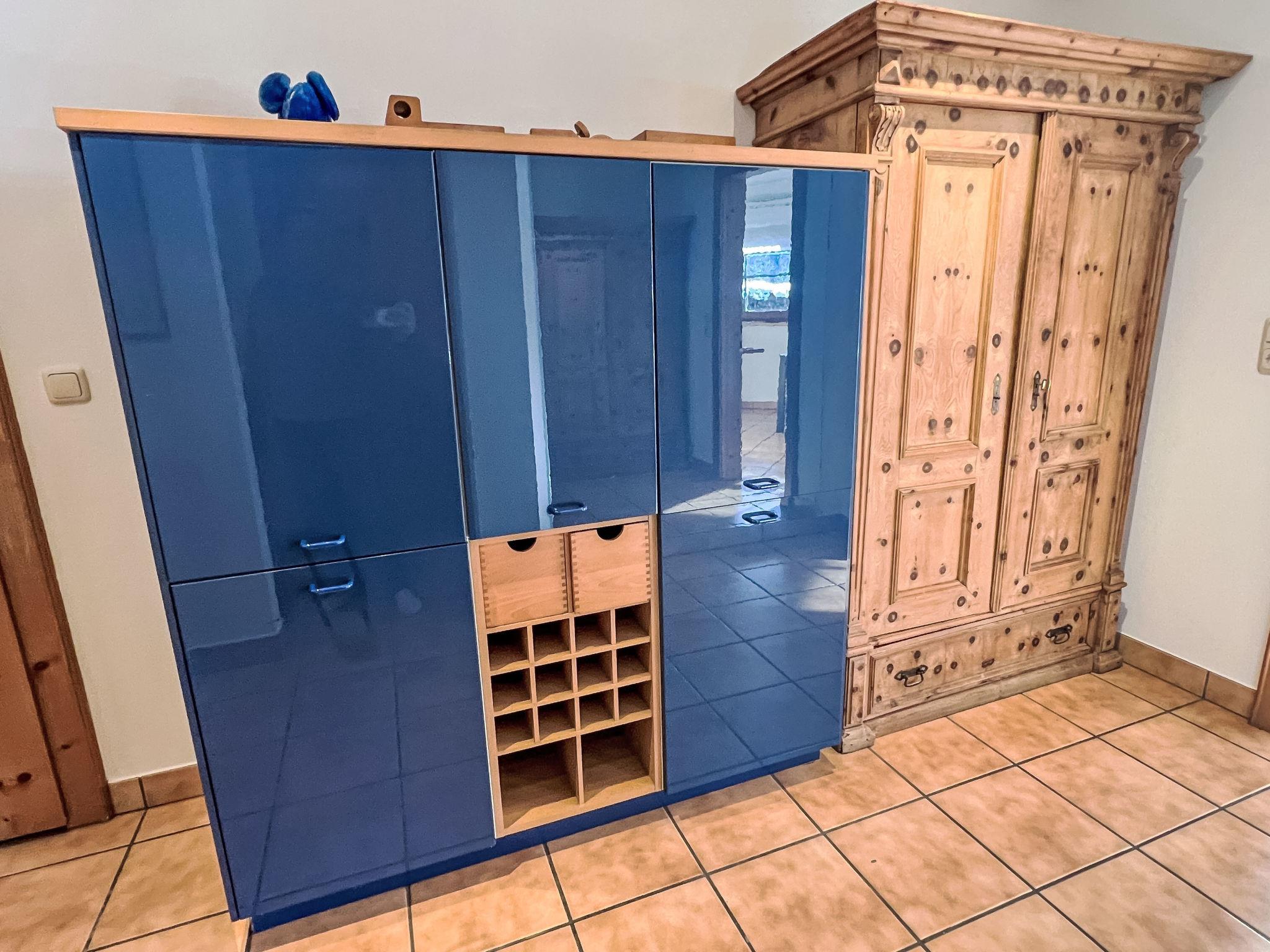 "Blauer Elefant", 4-room apartment 108 m2, on the ground floor. Tasteful furnishings: living room with Scandinavian wood stove and TV. 1 double bedroom with shower/WC and TV. 1 room with 1 x 2 bunk beds (90 cm, length 200 cm). 1 room with 1 double bed (130 cm, length 200 cm). Open kitchen (oven, dishwasher, 4 ceramic glass hob hotplates, toaster, kettle, microwave, fondue Set (chinoise)). Bath/WC. Oil heating. Wooden floors. Terrace 50 m2. Terrace furniture, electric barbecue. Very beautiful panoramic view of the mountains. Facilities: washing machine. Internet (WiFi, free). Please note: non-smokers only. Smoke alarm, fire extinguisher.
