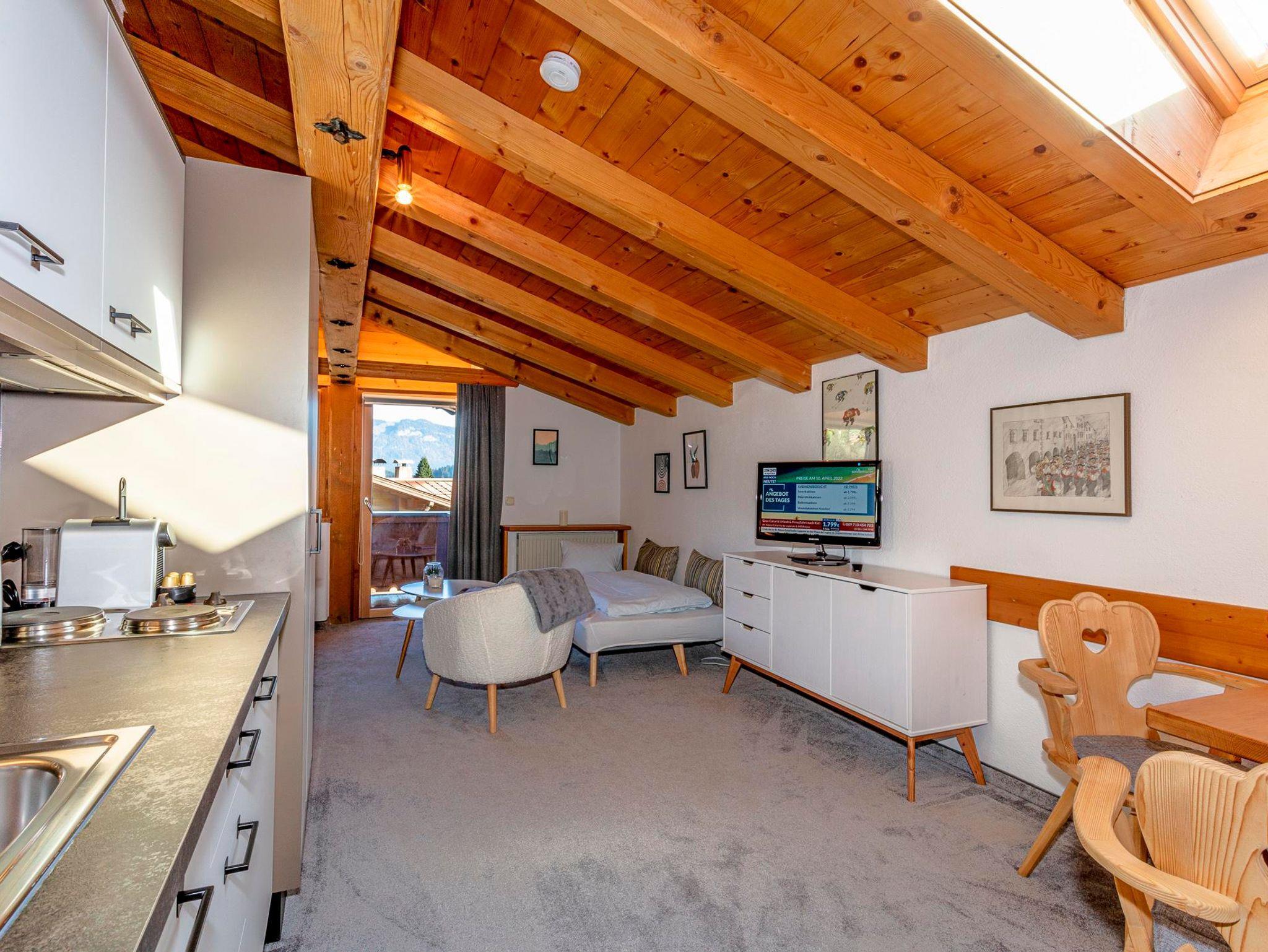 Willkommen in der modernen Ferienwohnung Kaiser 5! Hier erwarten dich auf 40 m² ein stilvolles und komfortables Ambiente. Angefangen von bequemen Betten und einer ausziehbaren Couch bis hin zu einer Kochnische mit Essecke findest du hier alles, was du für Ihren erholsamen Urlaub in den Kitzbüheler Alpen brauchst. Genieße die frische Luft und den herrlichen Ausblick vom Balkon aus. In der Ferienwohnung Kaiser 5 erwartet dich ein Aufenthalt voller Komfort und Gemütlichkeit.