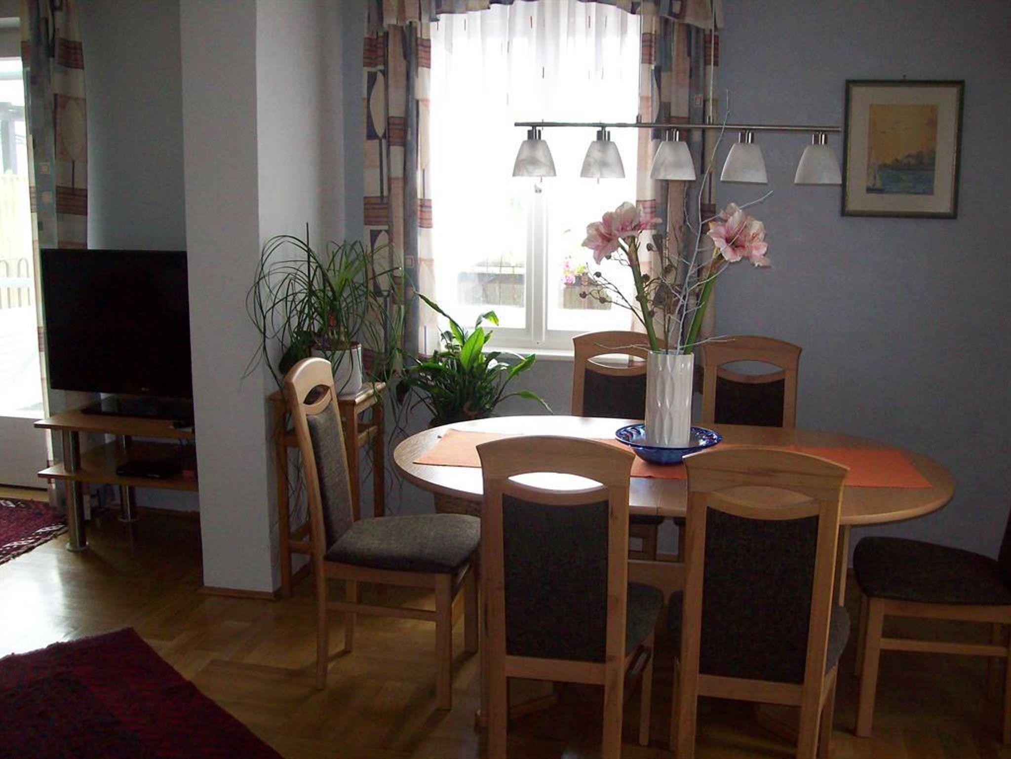 Die Wohnung befindet sich im abgeschlossenen Teil eines Hauses. Im Erdgeschoss eine voll ausgestattete Küche mit Kaffeevollautomat, Filterautomat, Geschirrspüler, Gefrierkombination, E-Herd, Mikrowelle, Wasserkocher, Toaster und Sitzgruppe für vier Personen.