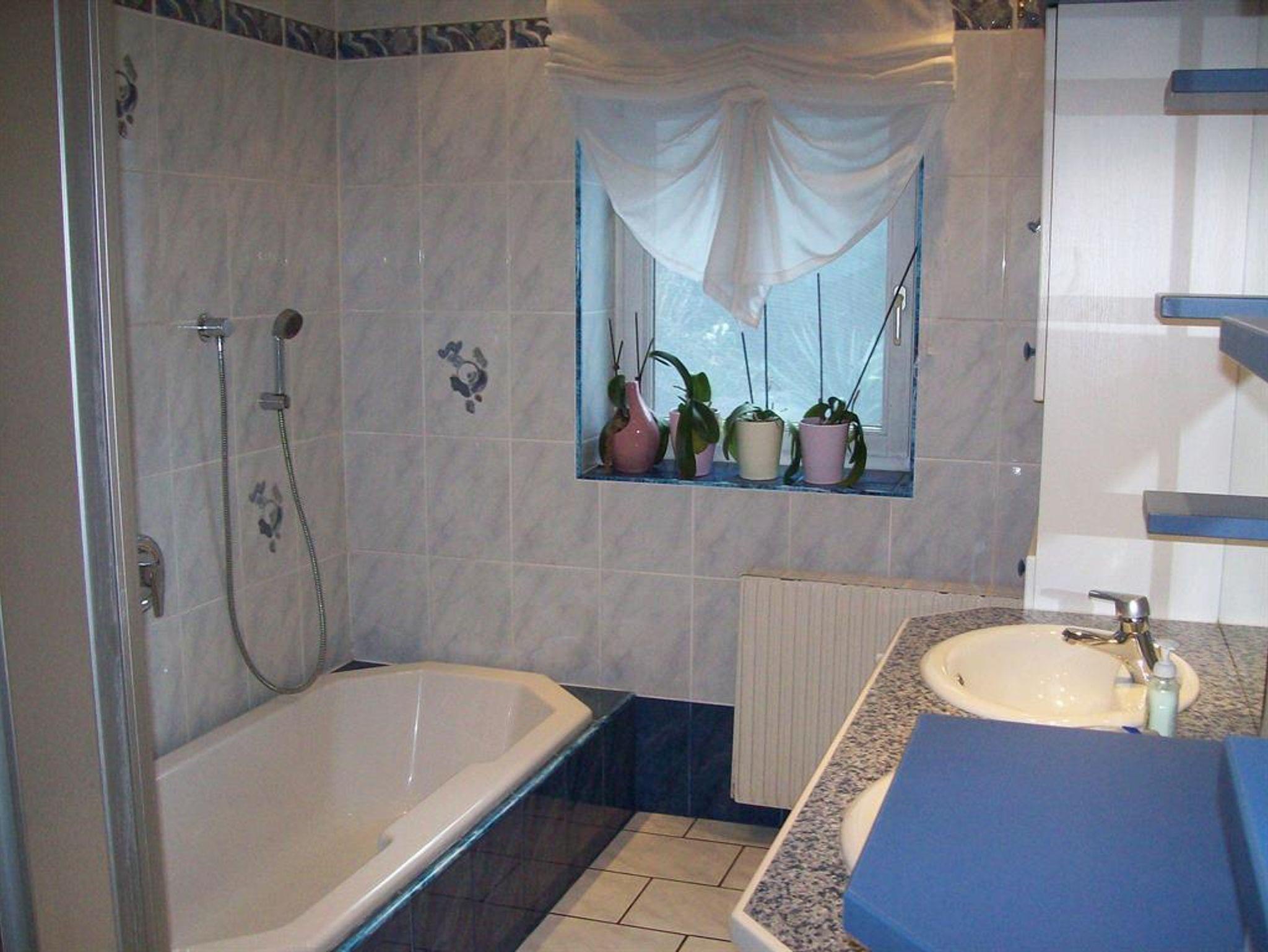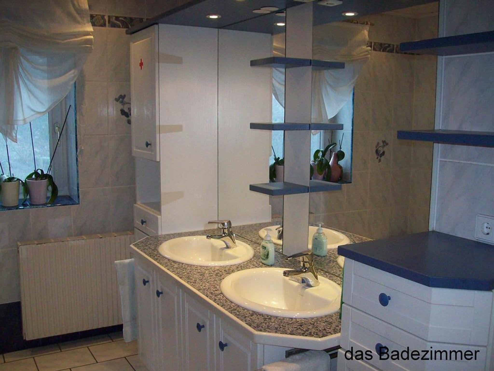 Doppelwaschbecken, Badewanne, Dusche, WC, zusätzlich im Obergeschoss noch ein WC