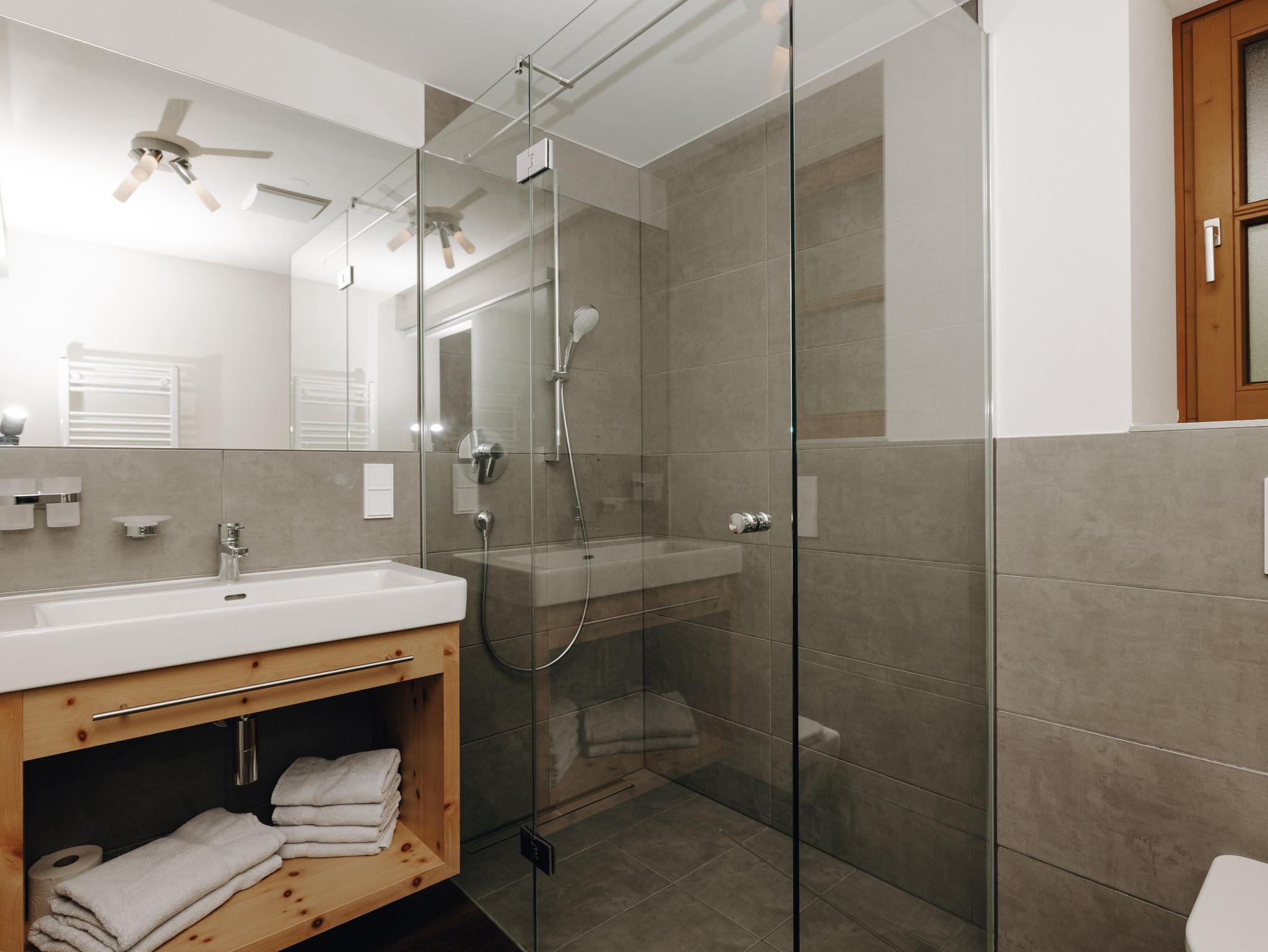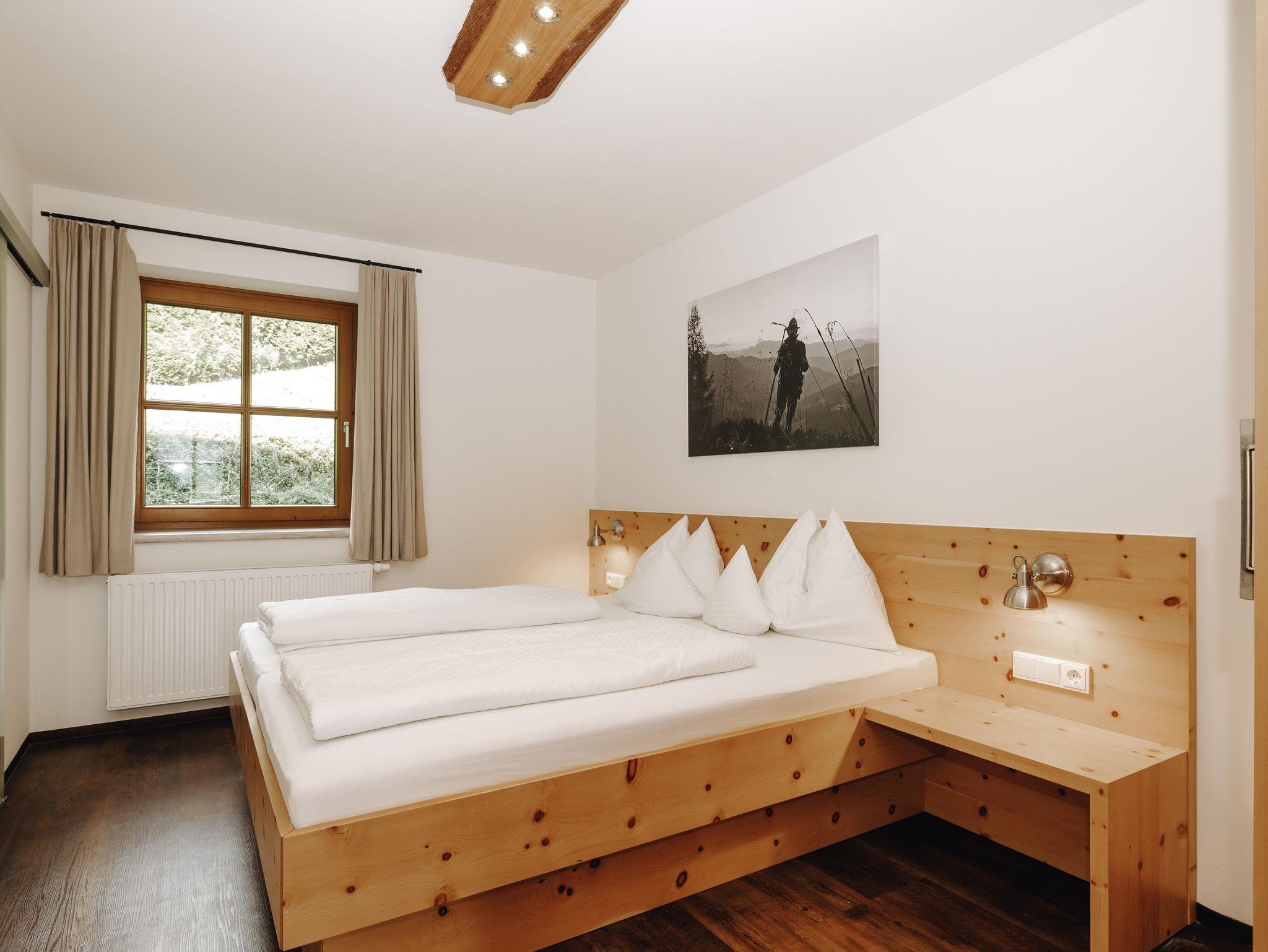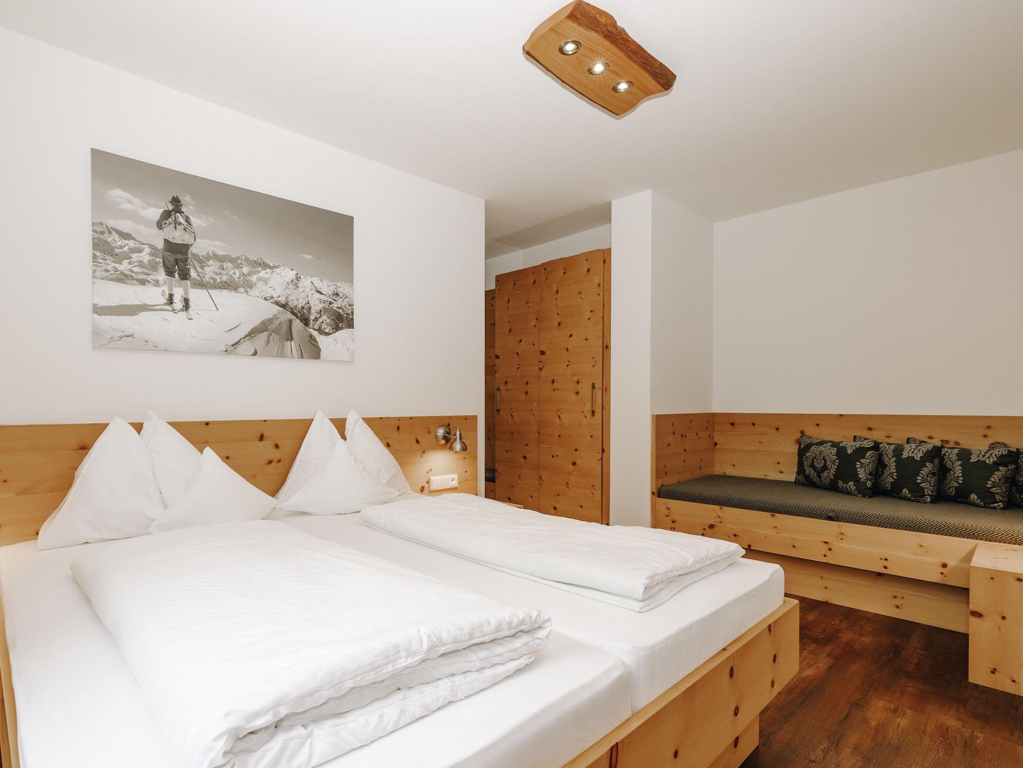 Luxus Komfort-Natur-Appartement in Zirbenholz,Wohnraum mit Küche,Sitzecke+Couch,2 getrennte Schlafzimmer (2 Bett, 2-3 Bett),2 Bäder mit Walk-In-Dusche/Toilette,Haarfön,Ost-Balkon, private Sauna, Flat-Screen mit Kabel-TV Radio,Safe