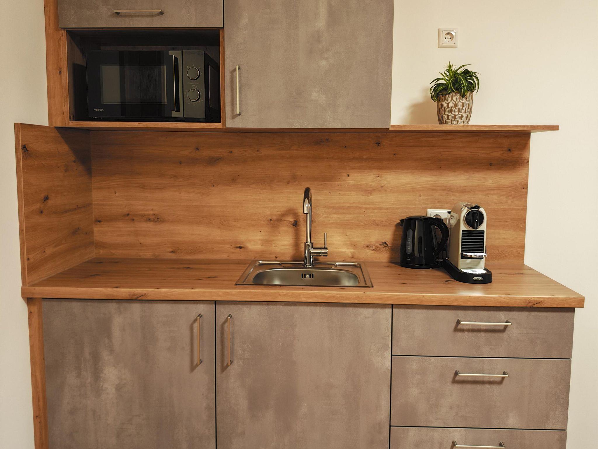 Genießen Sie den Komfort und Stil unseres brandneuen Gästezimmers mit hochwertiger Tischler-Einrichtung. Die hellen, lichtdurchfluteten Räume bieten ein Einzelbetten (extralang: 100×200cm) für optimalen Schlaf. Die voll ausgestattete Kochnische lässt keine Wünsche offen: Sie beinhaltet Backofen, Kochplatte, Mikrowelle, Kühlschrank sowie eine Kaffee-Espressomaschine und Teekocher. Zur weiteren Ausstattung gehören ein modernes Bad (Dusche/WC/Fön), kostenloses WLAN, SAT-TV und eine separate Rauchgelegenheit.