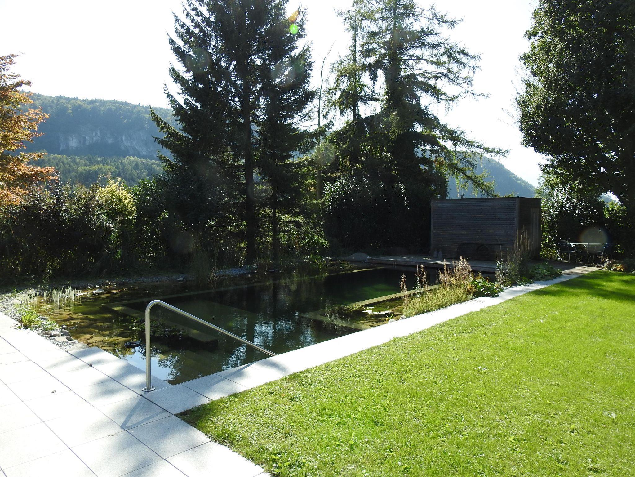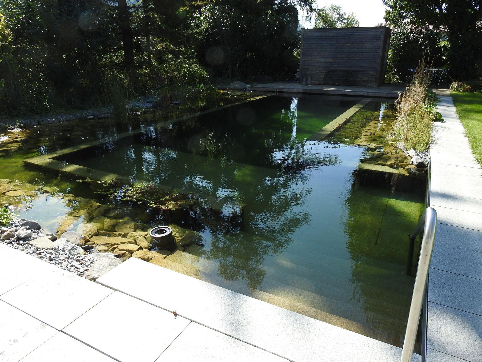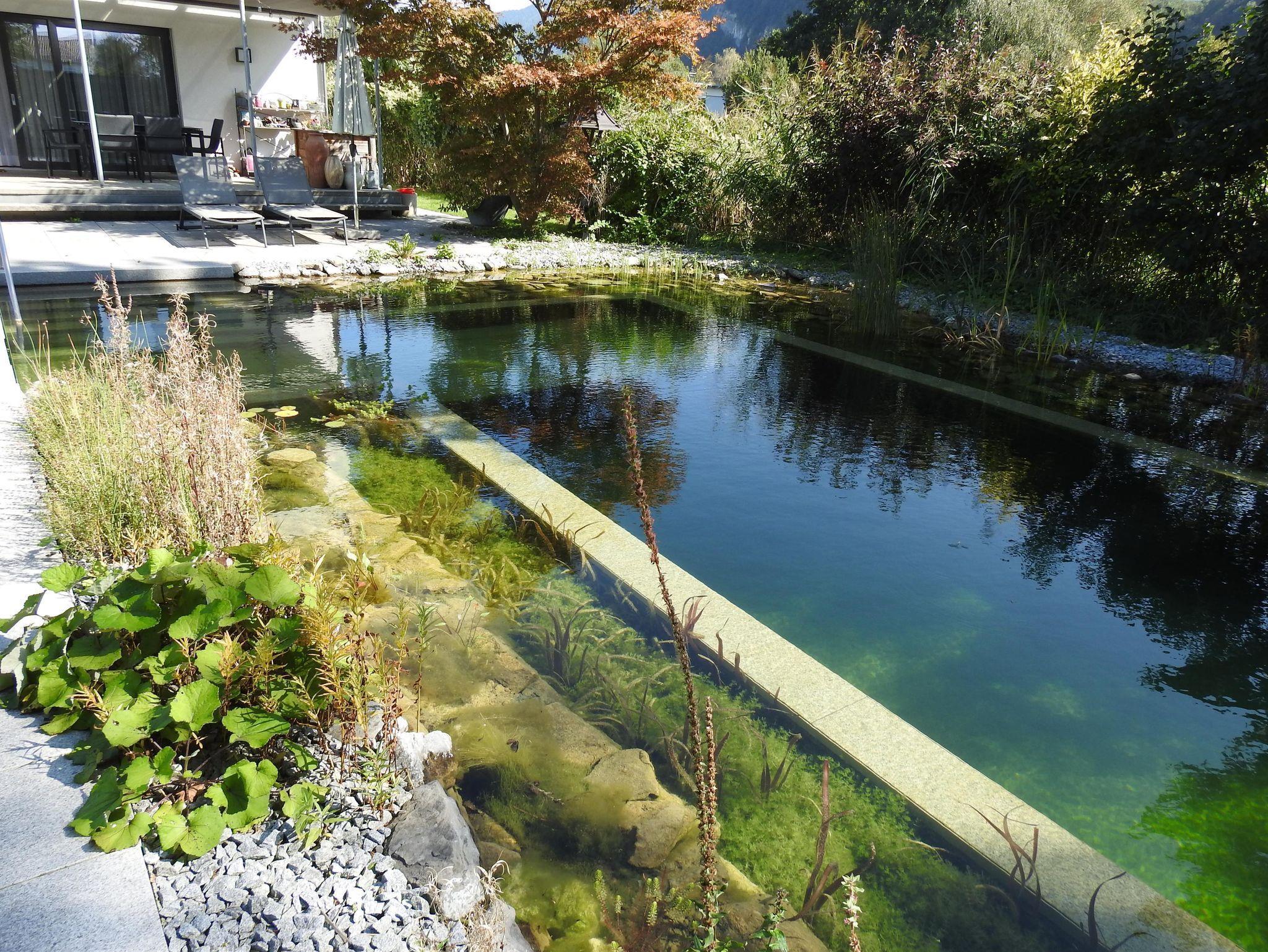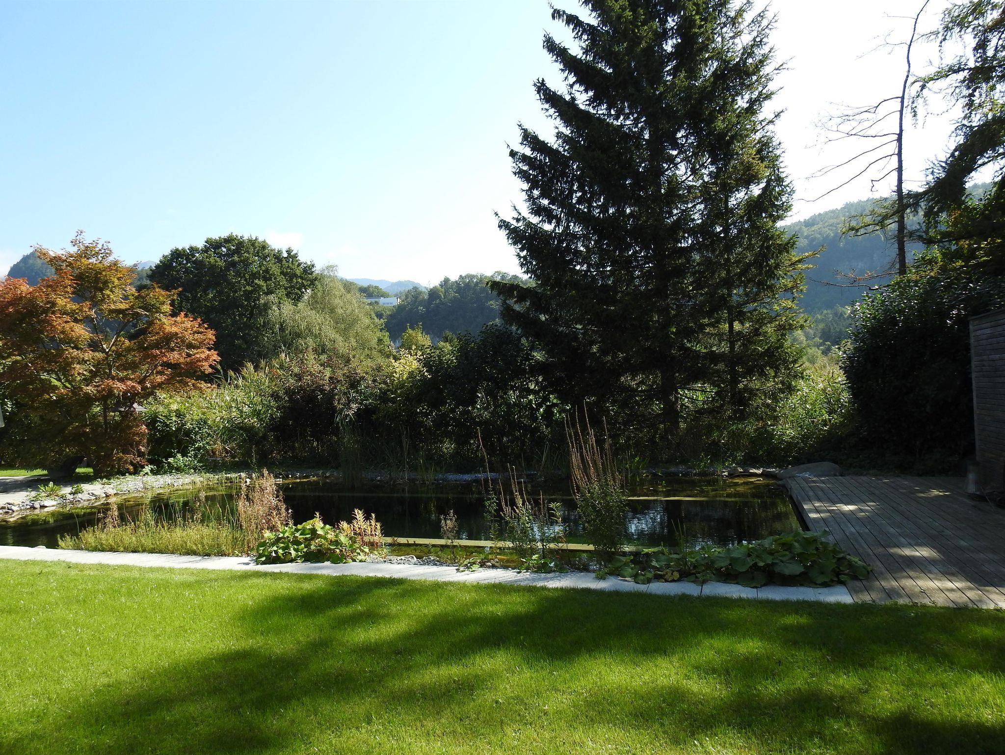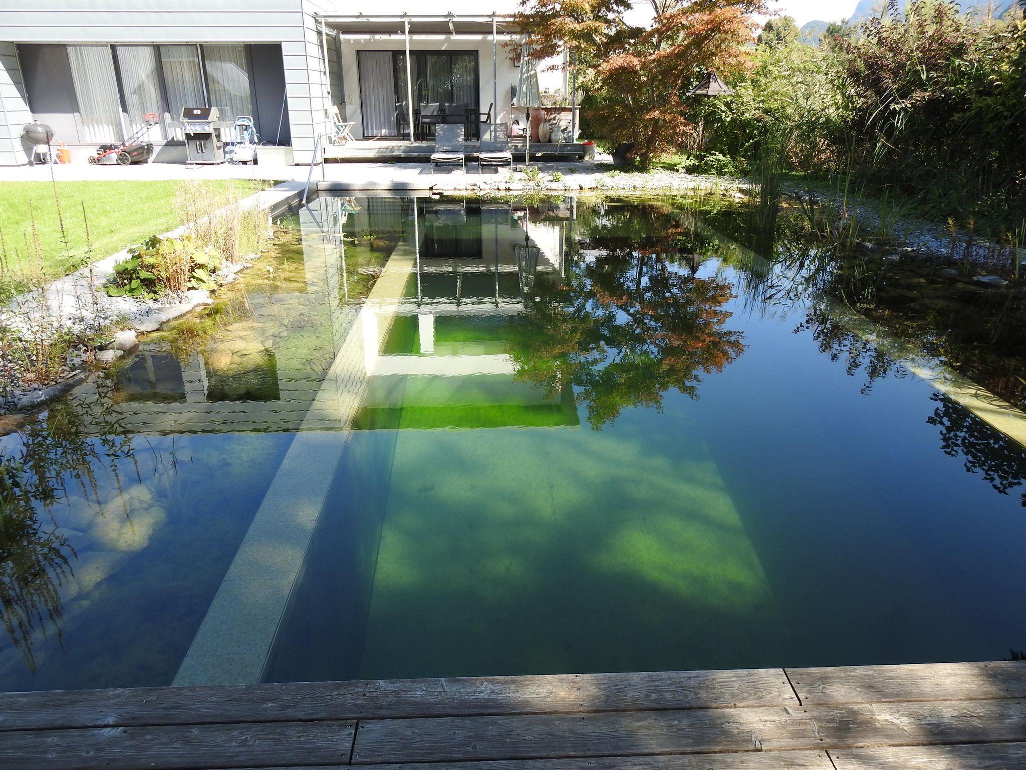 Achtung: Der Naturpool ist nur für Schwimmer! 3-Seitig ist der Pool durch die Pflanzen gesichert, auf der Seite der Sauna ist er aber ungesichert 240cm tief. Der Naturpool ist ganzjährig zB. auch nach der Sauna benutzbar oder als Kneipbecken auf der Mauer. Nach der Stiege ist er 120 cm tief und im Schwimmbereich 240cm.