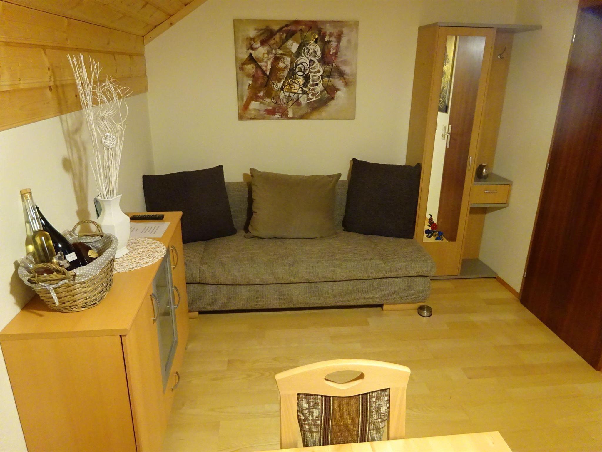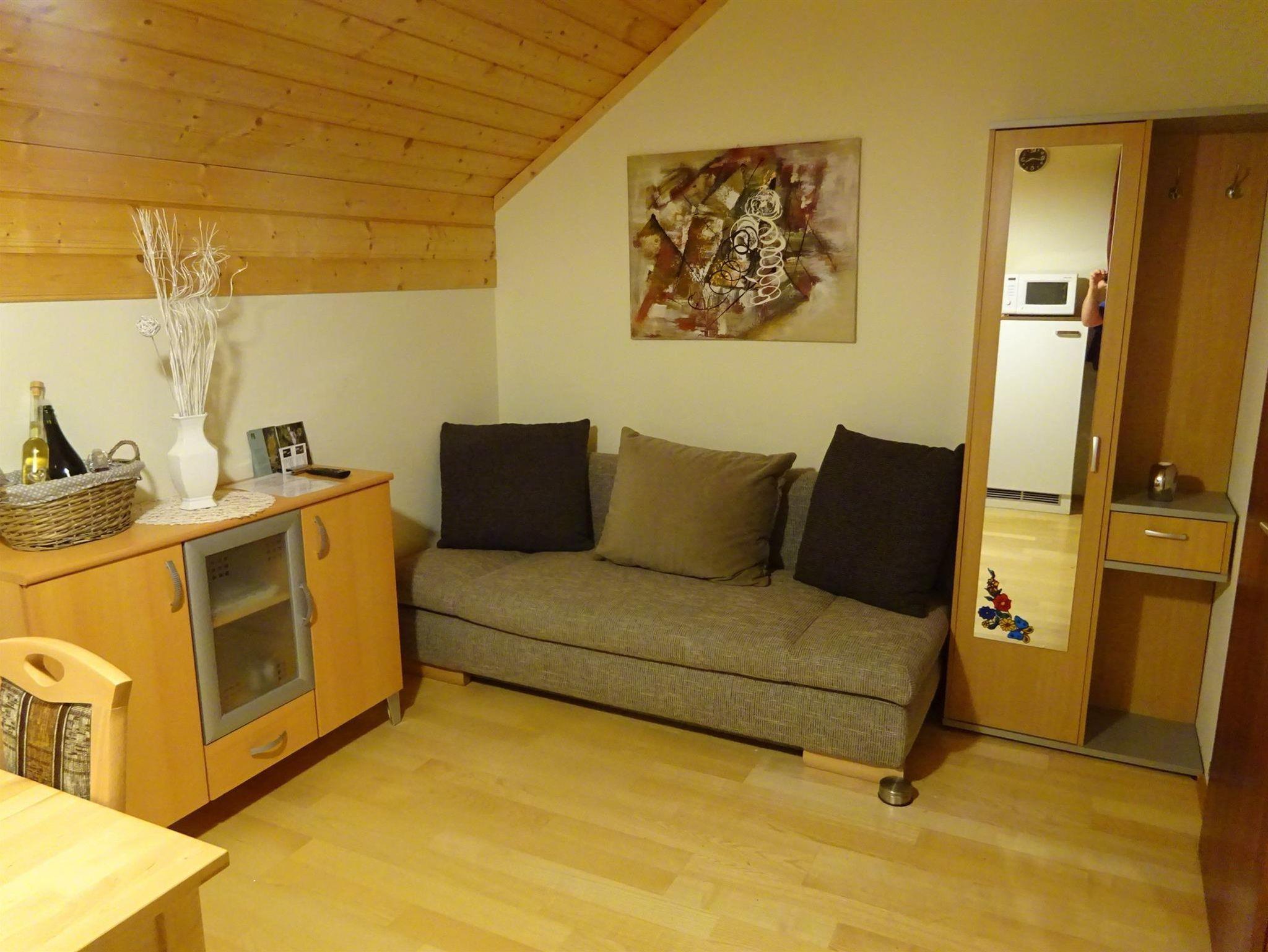 Apartment 2 (40 qm): Wohnküche mit Mini-Geschierspüler, Schlafsofa, TV, Schlafzimmer mit Schlafsofa, TV, Dusche, WC, 4 qm Balkon