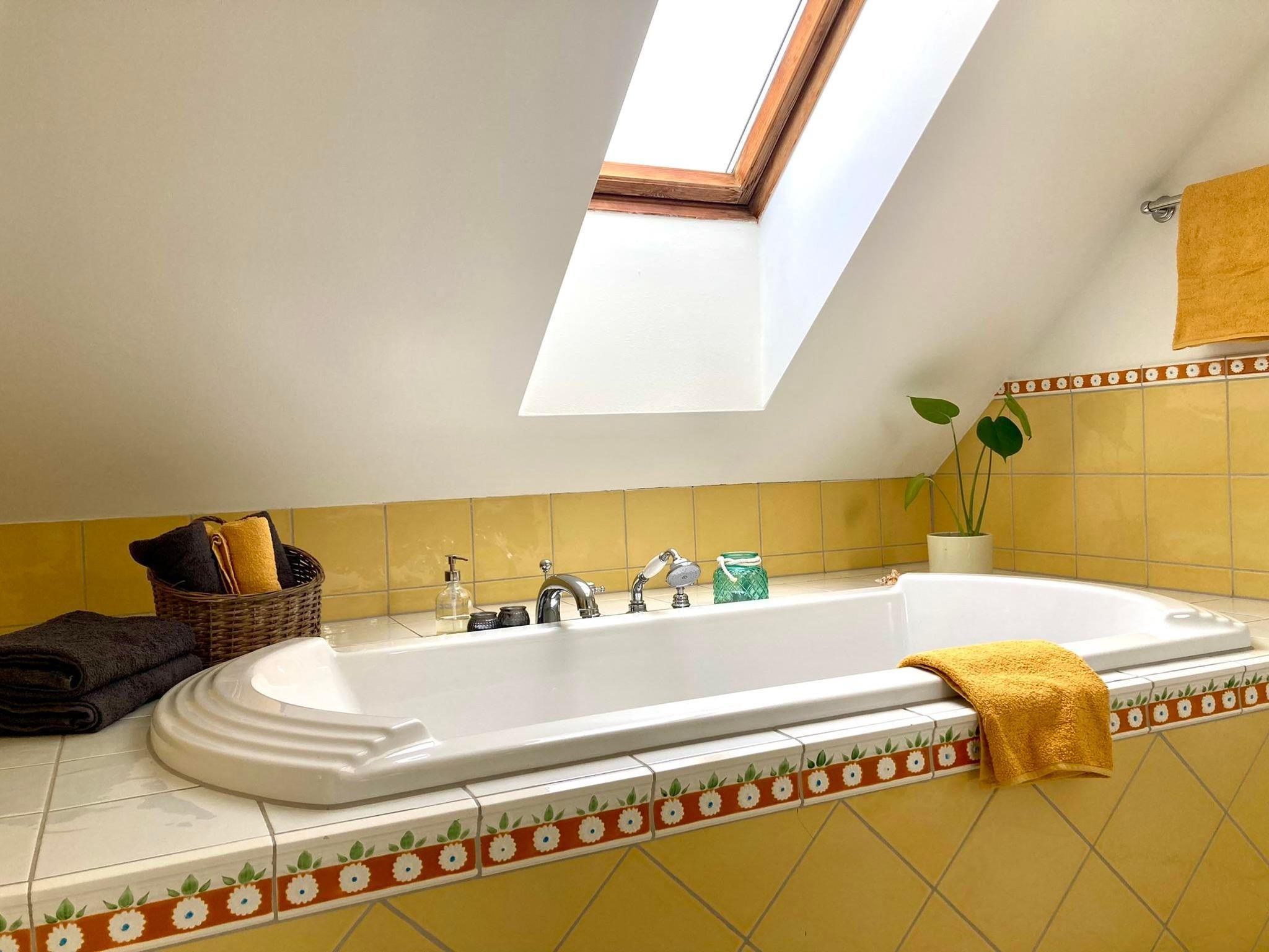 Das Bad ist von 2 Seiten zugängig und von der Badewanne aus genießen Sie einen umwerfenden Blick in den Sternenhimmel.