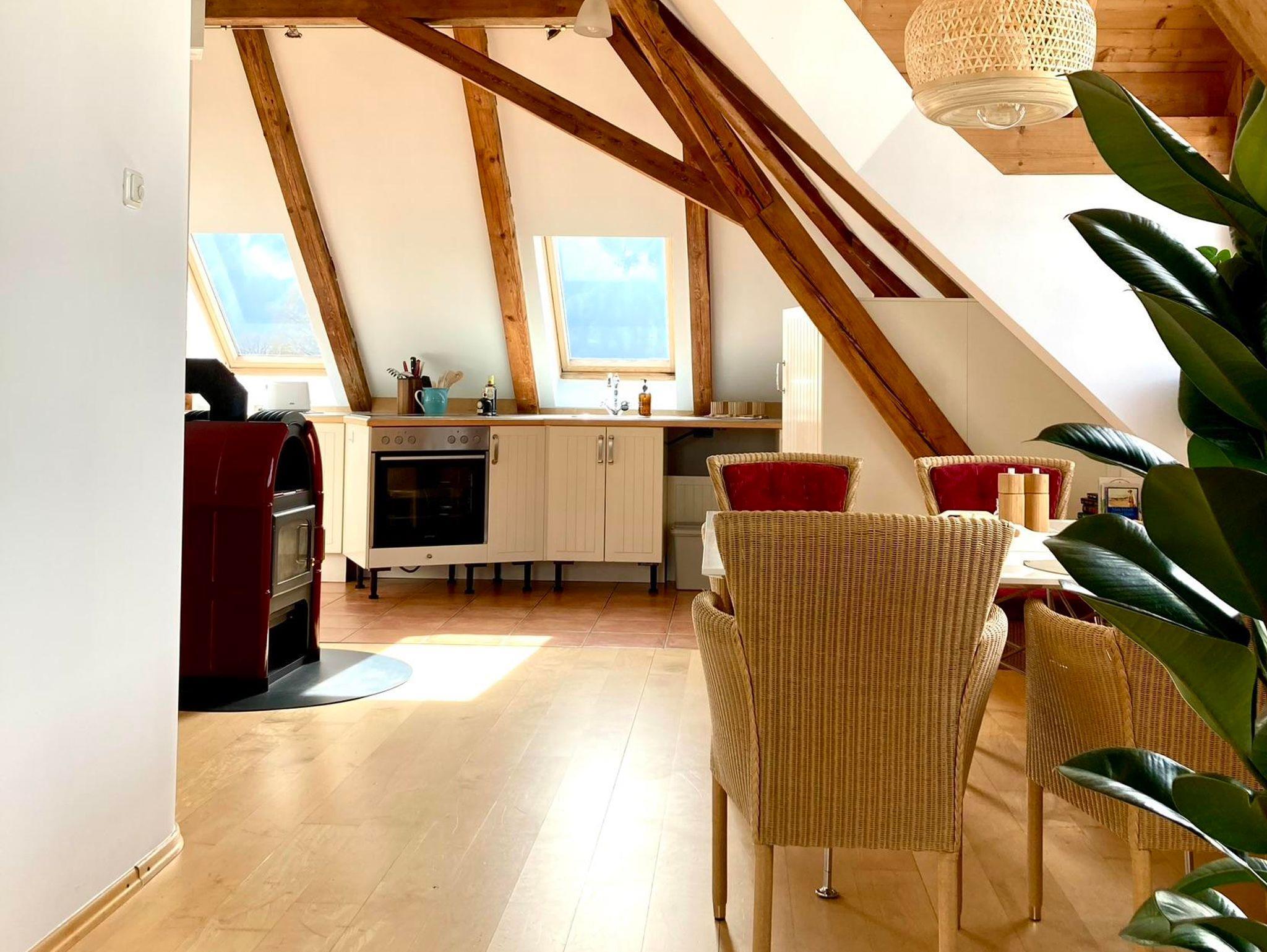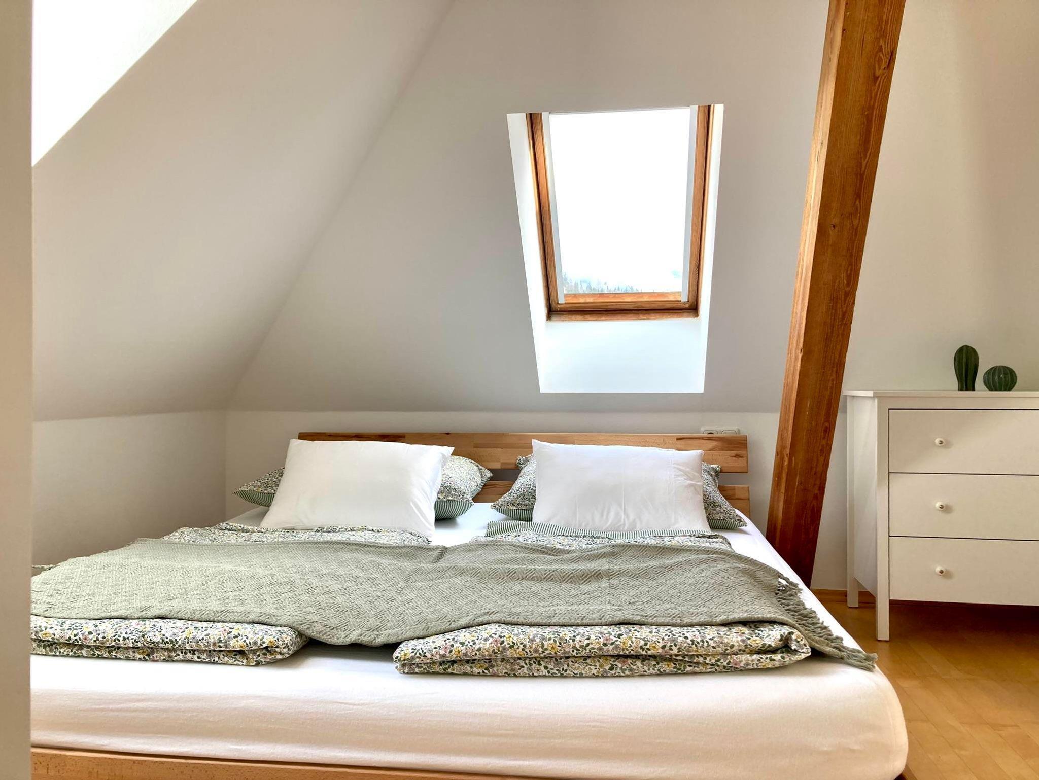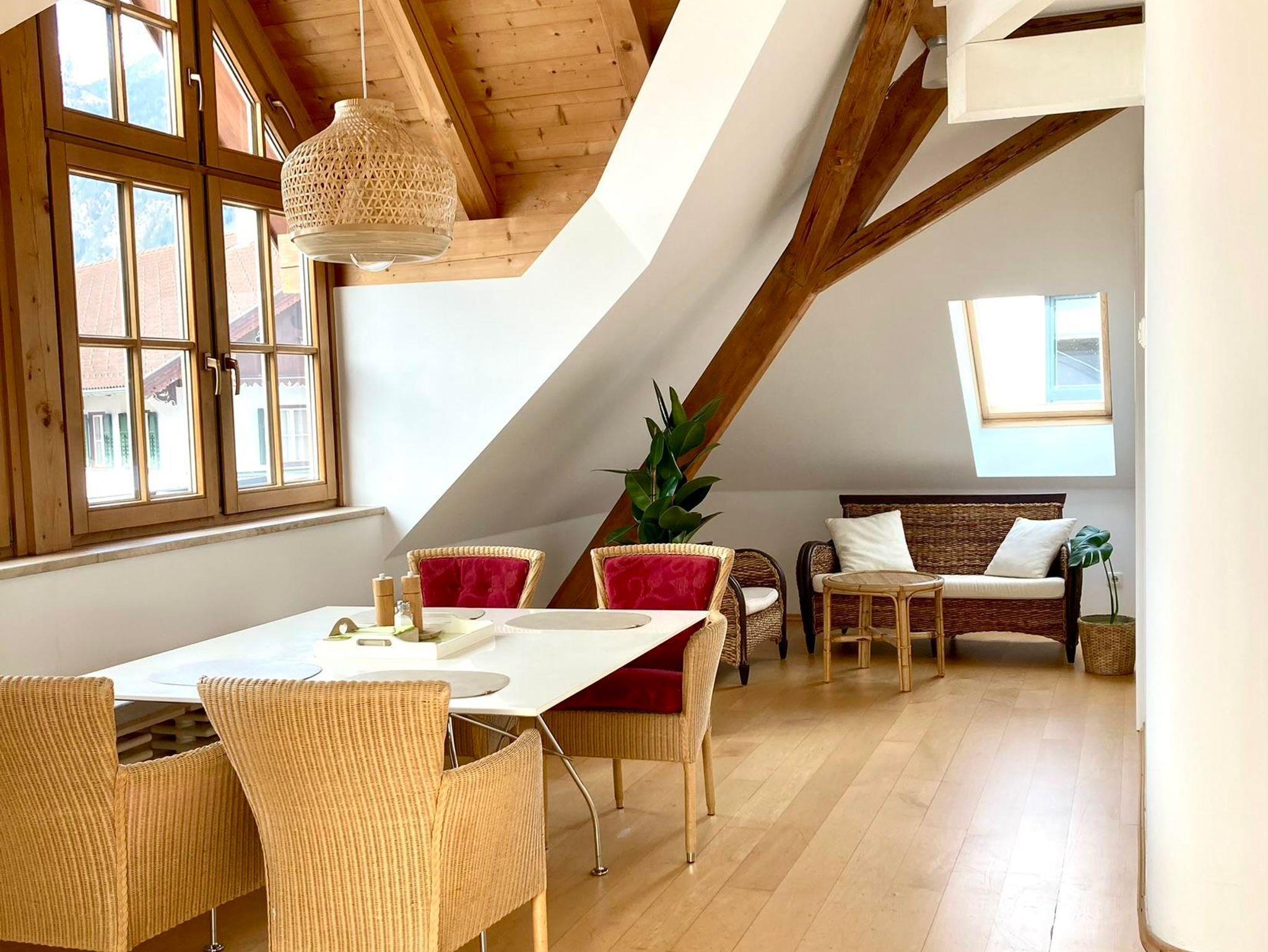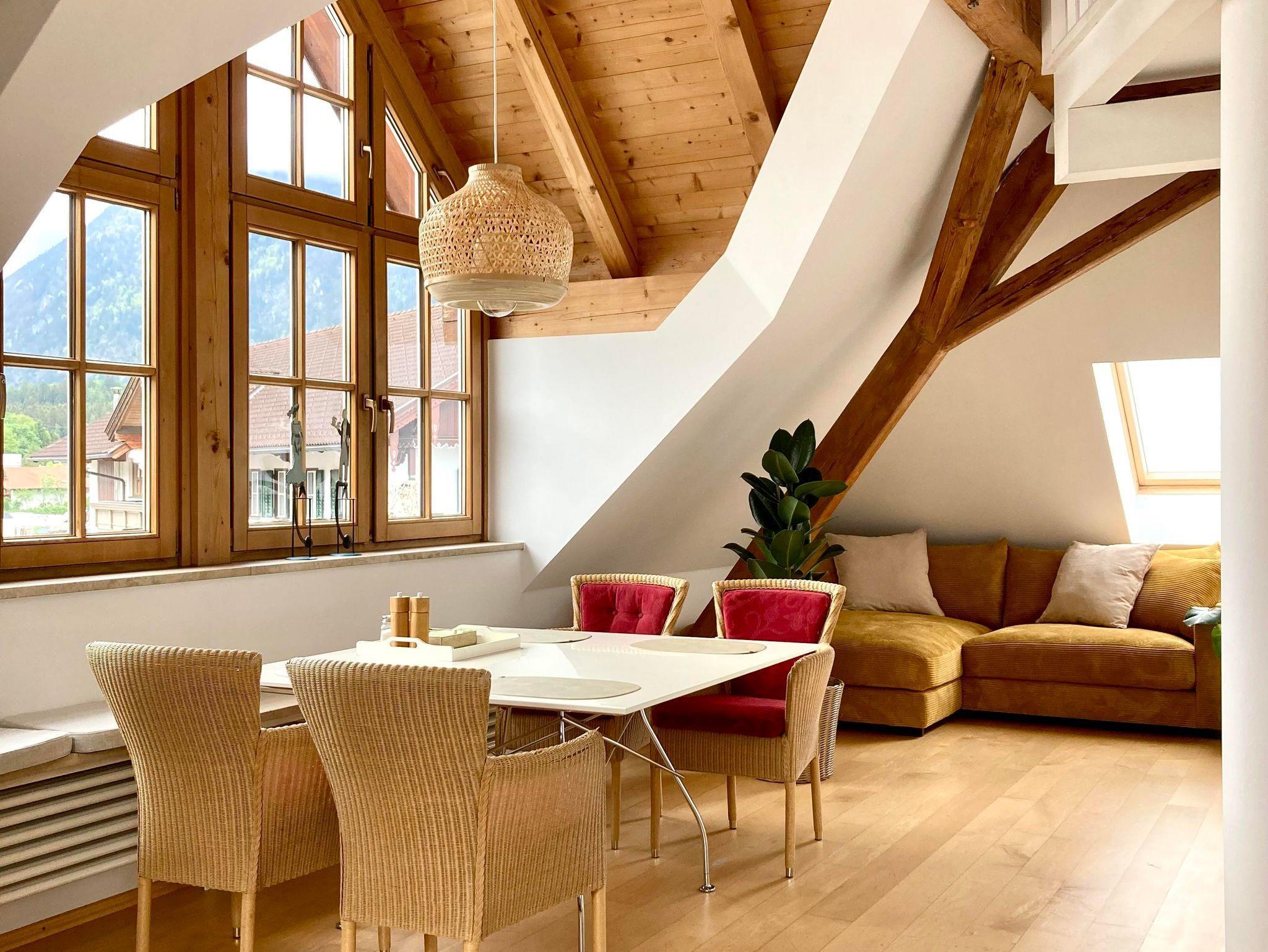 Mit viel Liebe zum Detail haben wir das Apartment eingerichtet, damit Sie Ihren Urlaub genießen können. Sie werden sich fühlen wie auf Wolke 7. Die Räumlichkeiten sind hell, luftig und mit vielen Naturmaterialien ausgestattet. Dachfenster geben den Blick in alle Himmelsrichtungen und die umliegende Bergwelt frei. Im Wohnbereich ist eine große Fensterfront mit Blick Richtung Westen.