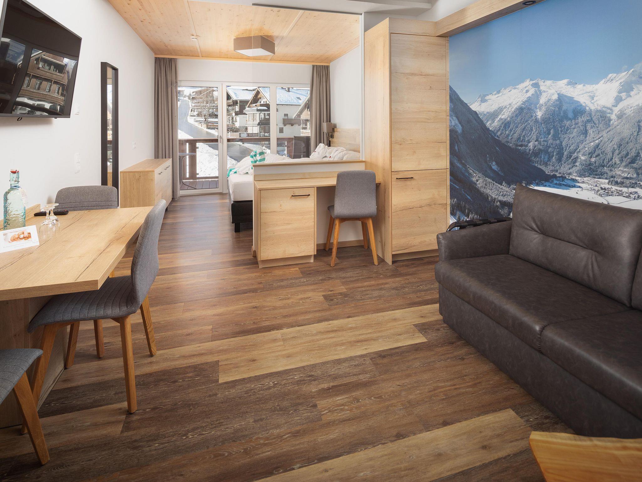 Die im Frühjahr 2019 komplett neu ausgestattete, allergikergerechte Suite (bis zu 6 Personen) verfügt über zwei getrennte Schlafzimmer sowie einen eigenen Wohnraum mit Ausziehcouch und bietet viel Platz im Urlaub. Die natürlichen Materialien im Alpine-Lifestyle-Design verbreiten eine angenehme Wohnatmosphäre und sorgen mit modernster Ausstattung für höchsten Wohnkomfort. Vom eigenen Balkon aus genießen Sie den Panoramablick auf die Krimmler Berge.