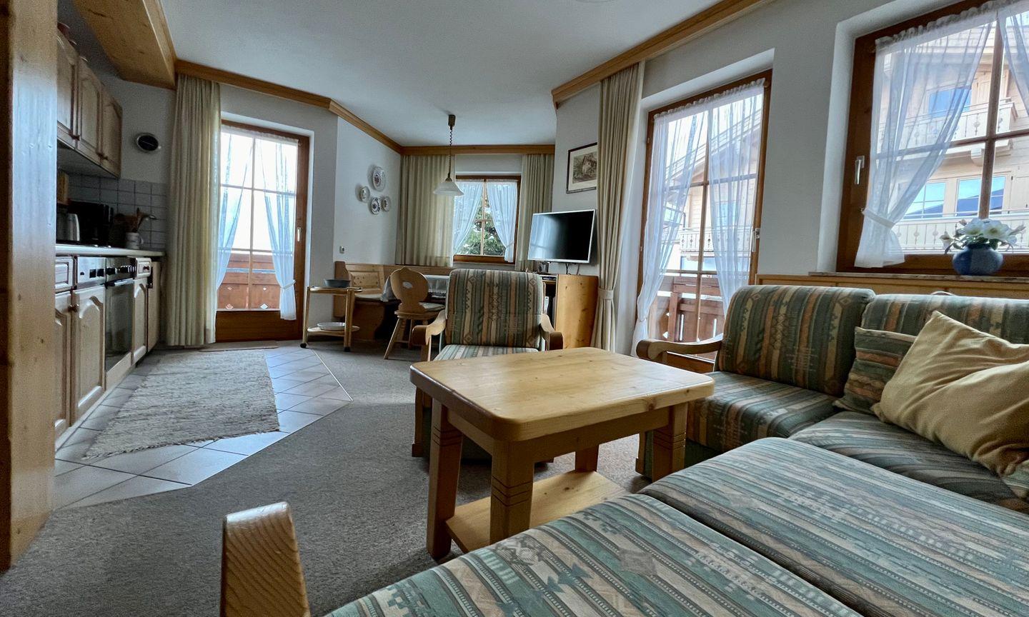 Die ortstypisch in Holz gehaltene Wohnung ist ausgestattet mit gemütlichen Sitzmöglichkeiten und verfügt über einen herrliche Südbalkon. Wer lieber selbst kocht als eines der in der Nähe liegenden Restaurants aufzusuchen, findet hier eine komplett ausgestattet Küche mit Herd und Geschirrspüler, so dass zu Hause bleiben eine wirklich ansprechende Option ist.
